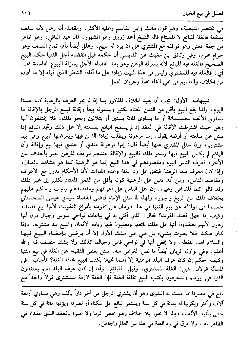 فِي مُخْتَصر الْمُتَيْطِيَّة، وَهُوَ قَول مَالك وَابْن الْقَاسِم وَعَلِيهِ الْأَكْثَر، وَمُقَابِله أَنه رهن لِأَنَّهُ سلف بِمَنْفَعَة فالغلة للْبَائِع لَا للْمُبْتَاع قَالَه الشَّيْخ أَحْمد زَرُّوق وَهُوَ الْمَشْهُور. قَالَ عبد الْبَاقِي: وَهُوَ ظَاهر من جِهَة الْمَعْنى وَهُوَ توافقه مَعَ المُشْتَرِي على أَن يرد لَهُ الْمَبِيع، وَعلل أَيْضا بِأَنَّهَا ثمن السّلف وَهُوَ حرَام محرم، وَفِي وثائق ابْن مغيث عَن الْقَابِسِيّ أَن حكمه قبل انْقِضَاء أجل الثنيا حكم البيع الصَّحِيح فالغلة فِيهِ للْبَائِع لِأَنَّهُ بِمَنْزِلَة الرَّهْن وَهُوَ بعد انْقِضَاء الْأَجَل بِمَنْزِلَة الْبيُوع الْفَاسِدَة اه. أَي: فالغلة فِيهِ للْمُشْتَرِي وَلَيْسَ فِي هَذَا الْبَيْت زِيَادَة على مَا أَفَادَهُ الشّطْر الَّذِي قبله إِلَّا مَا أَفَادَهُ من الْخلاف والتعميم فِي نفي الْغلَّة نصا وجريان الْعَمَل. تَنْبِيهَات. الأول: يجب أَن يُقيد الْخلاف الْمَذْكُور بِمَا إِذا لم يجر الْعرف بالرهنية كَمَا عندنَا الْيَوْم، وَلذَا يَقع البيع بِأَقَلّ من الثّمن الْمُعْتَاد بِكَثِير ويسمونه بيعا وإقالة فيبيع الرجل بالإقالة مَا يُسَاوِي الْألف بِخَمْسِمِائَة أَو مَا يُسَاوِي الْمِائَة بستين أَو بِثَلَاثِينَ وَنَحْو ذَلِك. فَلَا يَخْتَلِفُونَ أَنَّهَا رهن حَيْثُ اشْترطت الْإِقَالَة فِي العقد إِذْ لم يسمح البَائِع بسلعته إِلَّا على ذَلِك وتجد البَائِع إِذا سُئِلَ عَن سلْعَته أَو أرضه يَقُول: إِنَّهَا مَرْهُونَة وَيطْلب زِيَادَة الثّمن فِيهَا ويعرضها للْبيع وَهِي بيد مشتريها، وَإِذا سُئِلَ المُشْتَرِي عَنْهَا أَيْضا قَالَ: إِنَّهَا مَرْهُونَة عِنْدِي أَو عِنْدِي فِيهَا بيع وإقالة وَأَن البَائِع لم يكمل البيع فِيهَا وَنَحْو ذَلِك فَالْبيع وَالْإِقَالَة عِنْدهم مرادف للرَّهْن يعبر بِأَحَدِهِمَا عَن الآخر، فَعرف النَّاس الْيَوْم ومقصودهم فِي هَذَا البيع إِنَّمَا هُوَ الرهنية كَمَا هُوَ مشَاهد بالعيان، وَإِذا كَانَ الْعرف فِيهَا الرهنية فيتفق على رد الْغلَّة وَعدم الْفَوات لِأَن الْأَحْكَام تَدور مَعَ الْأَعْرَاف ومقاصد النَّاس وَمن أدل دَلِيل على الرهنية كَونه بِأَقَلّ من الثّمن الْمُعْتَاد بِكَثِير إِلَى غير ذَلِك وَقد قَالُوا كَمَا للقرافي وَغَيره: إِن حمل النَّاس على أعرافهم ومقاصدهم وَاجِب وَالْحكم عَلَيْهِم بِخِلَاف ذَلِك من الزيغ والجور، وَلِهَذَا لما سُئِلَ الإِمَام قَاضِي الْقُضَاة سَيِّدي عِيسَى السجسْتانِي حَسْبَمَا فِي نوازله عَن بيع الثنيا فِي هَذَا الزَّمَان هَل تفوت بأنواع التفويت لِأَنَّهَا بيع فَاسد، وَكَيف إِذا جهل قصد المفوت؟ فَقَالَ: الَّذِي أُفْتِي بِهِ فِي بياعات نواحي سوس وجبال درن أَنَّهَا رهون لأَنهم يَعْتَقِدُونَ أَنَّهَا على ملك بَائِعهَا وَيطْلبُونَ فِيهَا زِيَادَة الْأَثْمَان وَالْمَبِيع بيد مُشْتَرِيه، وَإِذا كَانَ هَكَذَا فَلَا يفوت بِشَيْء بل هِيَ على ملك الأول إِلَّا أَن يرضى بإمضاء البيع فِيهَا وَالسَّلَام اه. بِلَفْظِهِ. وَلَا يخفى أَنَّهَا فِي نواحي فاس وجبالها كَذَلِك وَلَا يشك منصف فِيهِ وَالله أعلم. وَفِي نَوَازِل الزياتي أَيْضا مَا نَص الْغَرَض مِنْهُ: سُئِلَ بعض الْفُقَهَاء عَن الْغلَّة فِي بيع الثنيا وَكَيف الحكم إِن كَانَ عرف الْبَلَد الرهنية إِلَّا أَنَّهُمَا تحيلا بكتب البيع مَخَافَة الْغلَّة؟ فَأجَاب: فِي الْمَسْأَلَة قَولَانِ. قيل: الْغلَّة للْمُشْتَرِي، وَقيل: للْبَائِع. وَأما إِن كَانَ عرف الْبَلَد أَنهم يَعْتَقِدُونَ الثنيا فِي بُيُوتهم ويتحرفون بكتب البيع مَخَافَة الْغلَّة فَإِن الْغلَّة لَازِمَة للْمُشْتَرِي قولا وَاحِدًا مَعَ