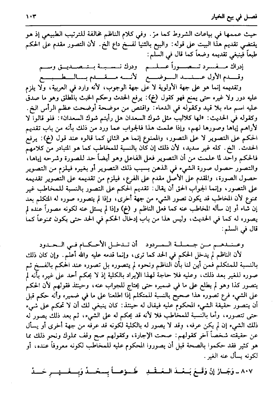 حَيْثُ عممها فِي بياعات الشُّرُوط كَمَا مرّ. وَفِي كَلَام النَّاظِم مُخَالفَة للتَّرْتِيب الطبيعي إِذْ هُوَ يَقْتَضِي تَقْدِيم هَذَا الْبَيْت على قَوْله: وَالْبيع بالثنيا لفسخ دَاع الخ. لِأَن التَّصَوُّر مقدم على الحكم طبعا فَيَنْبَغِي تَقْدِيمه وضعا كَمَا قَالَ فِي السّلم: إِدْرَاك مُفْرد تصوراً علم ودرك نِسْبَة بِتَصْدِيق وسم وَقدم الأول عِنْد الْوَضع لِأَنَّهُ مقدم بالطبع وتقديمه إِنَّمَا هُوَ على جِهَة الْأَوْلَوِيَّة لَا على جِهَة الْوُجُوب، لِأَنَّهُ وَارِد فِي الْعَرَبيَّة، وَلَا يلْزم عَلَيْهِ دور وَلَا غَيره حَتَّى يمْنَع فَهُوَ كَقَوْل (خَ) : يرفع الْحَدث وَحكم الْخبث بالمطلق وَهُوَ مَا صدق عَلَيْهِ اسْم مَاء بِلَا قيد وَكَقَوْلِه فِي الدِّمَاء: واقتص من مُوضحَة أوضحت عظم الرَّأْس الخ. وَكَقَوْلِه فِي الحَدِيث: (لَهَا كلاليب مثل شوك السعدان هَل رَأَيْتُمْ شوك السعدان) : فَلَو قَالُوا لَا لأراهم إِيَّاهَا وصورها لَهُم، وَإِذا علمت هَذَا فَالْجَوَاب عَمَّا ورد من ذَلِك بِأَنَّهُ من بَاب تَقْدِيم الحكم على التَّصْوِير لَا على التَّصَوُّر، والممنوع إِنَّمَا هُوَ الثَّانِي كَمَا قَالُوهُ عِنْد قَول (خَ) : يرفع الْحَدث. الخ. كُله غير سديد، لِأَن ذَلِك إِن كَانَ بِالنِّسْبَةِ للمخاطب كَمَا هُوَ الْمُتَبَادر من كَلَامهم فَالْحكم وَاحِد لما علمت من أَن التَّصْوِير فعل الْفَاعِل وَهُوَ أَيْضا حد للصورة وَشَرحه إِيَّاهَا، والتصور حُصُول صُورَة الشَّيْء فِي الذِّهْن بِسَبَب ذَلِك التَّصْوِير أَو بِغَيْرِهِ فَيلْزم من التَّصْوِير حُصُول الصُّورَة، والمقدم على الأَصْل مقدم على الْفَرْع، فَيلْزم من تَقْدِيمه على التَّصْوِير تَقْدِيمه على التَّصَوُّر، وَإِنَّمَا الْجَواب الْحق أَن يُقَال: تَقْدِيم الحكم على التَّصَوُّر بِالنِّسْبَةِ للمخاطب غير مَمْنُوع لِأَن الْمُخَاطب قد يكون تصور الشَّيْء من جِهَة أُخْرَى، وَإِذا لم يتصوره صوره لَهُ الْمُتَكَلّم بعد إِن شَاءَ أَو إِن سَأَلَهُ الْمُخَاطب عَنهُ كَمَا فعل النَّاظِم و (خَ) وَإِذا لم يسئل عَنهُ لكَونه مصوراً عِنْده لم يصوره لَهُ كَمَا فِي الحَدِيث، وَلَيْسَ هَذَا من بَاب إِدْخَال الحكم فِي الْحَد حَتَّى يكون مَمْنُوعًا كَمَا قَالَ فِي السّلم: وَعِنْدهم من جملَة الْمَرْدُود أَن تدخل الْأَحْكَام فِي الْحُدُود لِأَن النَّاظِم لم يدْخل الحكم فِي الْحَد كَمَا ترى، وَإِنَّمَا قدمه عَلَيْهِ وَالله أعلم. وَإِن كَانَ ذَلِك بِالنِّسْبَةِ للمتكلم فَمن أَيْن لنا بِأَن النَّاظِم وَنَحْوه لم يتصوره بل تصَوره عِنْد الحكم بِالْفَسْخِ ثمَّ صوره للْغَيْر بعد ذَلِك، وَعَلِيهِ فَلَا حَاجَة لهَذَا الْإِيرَاد بِالْكُلِّيَّةِ إِذْ لَا يحكم أحد على غَيره بِأَنَّهُ لم يتَصَوَّر كَذَا وَهُوَ لم يطلع على مَا فِي ضَمِيره حَتَّى يحْتَاج للجواب عَنهُ، وَحِينَئِذٍ فَقَوْلهم لِأَن الحكم على الشَّيْء فرع تصَوره هَذَا صَحِيح بِالنِّسْبَةِ للمتكلم إِذا اطَّلَعْنَا على مَا فِي ضَمِيره وَأَنه حكم قبل أَن يتَصَوَّر حَقِيقَة الشَّيْء الْمَحْكُوم عَلَيْهِ فَيُقَال لَهُ حِينَئِذٍ: كَانَ يَنْبَغِي لَك أَن لَا تحكم على شَيْء حَتَّى تتصوره، وَأما بِالنِّسْبَةِ للمخاطب فَلَا لِأَنَّهُ قد يحكم لَهُ على الشَّيْء، ثمَّ بعد ذَلِك يصور لَهُ ذَلِك الشَّيْء إِن لم يكن عرفه، وَقد لَا يصور لَهُ بِالْكُلِّيَّةِ لكَونه قد عرفه من جِهَة أُخْرَى أَو يسْأَل عَن حَقِيقَته شخصا آخر كَقَوْلِهِم: صحت الْإِجَارَة، وكقولهم صَحَّ وقف مَمْلُوك وَنَحْو ذَلِك مِمَّا هُوَ كثير فقد حكمُوا بِالصِّحَّةِ قبل أَن يصوروا الْمَحْكُوم عَلَيْهِ للمخاطب لكَونه مَعْرُوفا عِنْده، أَو لكَونه يسْأَل عَنهُ الْغَيْر. وَجَازَ إنْ وَقَعَ بَعْدَ العَقْدِ طَوْعاً بِحْدَ وَبِغَيْرِ حَدِّ