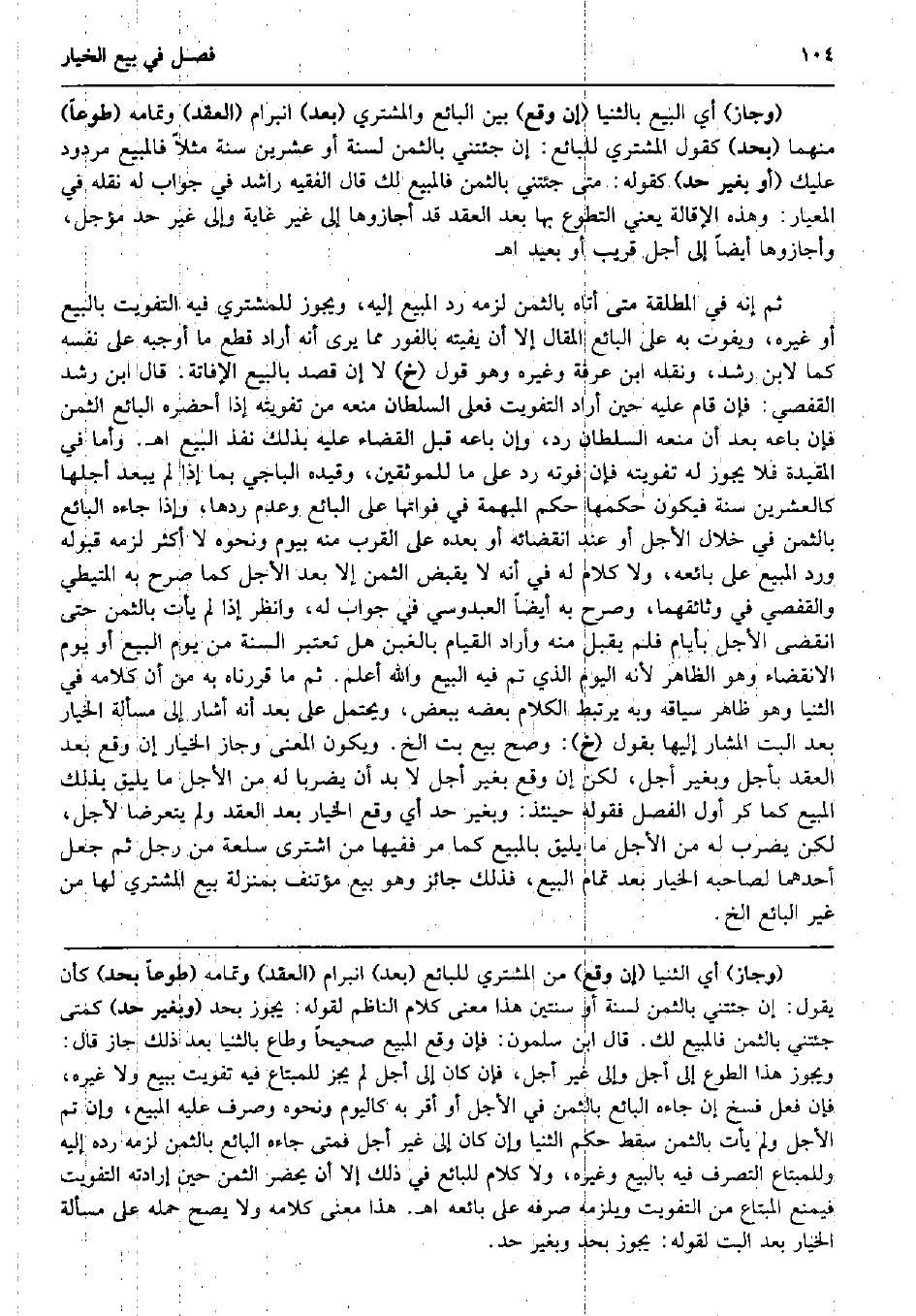 (وَجَاز) أَي البيع بالثنيا (إِن وَقع) بَين البَائِع وَالْمُشْتَرِي (بعد) انبرام (العقد) وَتَمَامه (طَوْعًا) مِنْهُمَا (بِحَدّ) كَقَوْل المُشْتَرِي للْبَائِع: إِن جئتني بِالثّمن لسنة أَو عشْرين سنة مثلا فالمبيع مَرْدُود عَلَيْك (أَو بِغَيْر حد) كَقَوْلِه: مَتى جئتني بِالثّمن فالمبيع لَك قَالَ الْفَقِيه رَاشد فِي جَوَاب لَهُ نَقله فِي المعيار: وَهَذِه الْإِقَالَة يَعْنِي التَّطَوُّع بهَا بعد العقد قد أجازوها إِلَى غير غَايَة وَإِلَى غير حد مُؤَجل، وأجازوها أَيْضا إِلَى أجل قريب أَو بعيد اه ثمَّ إِنَّه فِي الْمُطلقَة مَتى أَتَاهُ بِالثّمن لزمَه رد الْمَبِيع إِلَيْهِ، وَيجوز للْمُشْتَرِي فِيهِ التفويت بِالْبيعِ أَو غَيره، ويفوت بِهِ على البَائِع الْمقَال إِلَّا أَن يفيته بالفور مِمَّا يرى أَنه أَرَادَ قطع مَا أوجبه على نَفسه كَمَا لِابْنِ رشد، وَنَقله ابْن عَرَفَة وَغَيره وَهُوَ قَول (خَ) لَا إِن قصد بِالْبيعِ الإفاتة. قَالَ ابْن رشد القفصي: فَإِن قَامَ عَلَيْهِ حِين أَرَادَ التفويت فعلى السُّلْطَان مَنعه من تفويته إِذا أحضرهُ البَائِع الثّمن فَإِن بَاعه بعد أَن مَنعه السُّلْطَان رد وَإِن بَاعه قبل الْقَضَاء عَلَيْهِ بذلك نفذ البيع اه. وَأما فِي الْمقيدَة فَلَا يجوز لَهُ تفويته فَإِن فَوته رد على مَا للموثقين، وَقَيده الْبَاجِيّ بِمَا إِذا لم يبعد أجلهَا كالعشرين سنة فَيكون حكمهَا حكم المبهمة فِي فَوَاتهَا على البَائِع وَعدم ردهَا، وَإِذا جَاءَهُ البَائِع بِالثّمن فِي خلال الْأَجَل أَو عِنْد انقضائه أَو بعده على الْقرب مِنْهُ بِيَوْم وَنَحْوه لَا أَكثر لزمَه قبُوله ورد الْمَبِيع على بَائِعه، وَلَا كَلَام لَهُ فِي أَنه لَا يقبض الثّمن إِلَّا بعد الْأَجَل كَمَا صرح بِهِ المتيطي والقفصي فِي وثائقهما، وَصرح بِهِ أَيْضا العبدوسي فِي جَوَاب لَهُ، وَانْظُر إِذا لم يَأْتِ بِالثّمن حَتَّى انْقَضى الْأَجَل بأيام فَلم يقبل مِنْهُ وَأَرَادَ الْقيام بِالْغبنِ هَل تعْتَبر السّنة من يَوْم البيع أَو يَوْم الِانْقِضَاء وَهُوَ الظَّاهِر لِأَنَّهُ الْيَوْم الَّذِي تمّ فِيهِ البيع وَالله أعلم. ثمَّ مَا قَرَّرْنَاهُ بِهِ من أَن كَلَامه فِي الثنيا وَهُوَ ظَاهر سِيَاقه وَبِه يرتبط الْكَلَام بعضه بِبَعْض، وَيحْتَمل على بعد أَنه أَشَارَ إِلَى مَسْأَلَة الْخِيَار بعد الْبَتّ الْمشَار إِلَيْهَا بقول (خَ) : وَصَحَّ بيع بت الخ. وَيكون الْمَعْنى وَجَاز الْخِيَار إِن وَقع بعد العقد بِأَجل وَبِغير أجل، لَكِن إِن وَقع بِغَيْر أجل لَا بُد أَن يضربا لَهُ من الْأَجَل مَا يَلِيق بذلك الْمَبِيع كَمَا كرّ أول الْفَصْل فَقَوله حِينَئِذٍ: وَبِغير حد أَي وَقع الْخِيَار بعد العقد وَلم يتعرضا لأجل، لَكِن يضْرب لَهُ من الْأَجَل مَا يَلِيق بِالْمَبِيعِ كَمَا مر فَفِيهَا من اشْترى سلْعَة من رجل ثمَّ جعل أَحدهمَا لصَاحبه الْخِيَار بعد تَمام البيع، فَذَلِك جَائِز وَهُوَ بيع مؤتنف بِمَنْزِلَة بيع المُشْتَرِي لَهَا من غير البَائِع الخ.