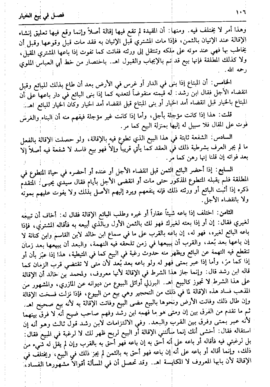 وَهَذَا أَمر لَا يخْتَلف فِيهِ. وَمِنْهَا: أَن الْمقيدَة لم تقع فِيهَا إِقَالَة أصلا وَإِنَّمَا وَقع فِيهَا تَعْلِيق إنْشَاء الْإِقَالَة عِنْد الْإِتْيَان بِالثّمن، فَإِذا مَاتَ المُشْتَرِي قبل الْإِتْيَان بِهِ فقد مَاتَ قبل وُقُوعهَا وَقبل أَن يُخَاطب بهَا فَهِيَ عِنْد مَوته على ملكه وتنتقل إِلَى ورثته ففاتت كَمَا تفوت إِذا بَاعهَا المُشْتَرِي المقيل، وَلَا كَذَلِك الْمُطلقَة فَإِنَّهَا بيع قد تمّ بِالْإِيجَابِ وَالْقَبُول اه. بِاخْتِصَار من خطّ أبي الْعَبَّاس الملوي رَحمَه الله. الْخَامِس: أَن الْمُبْتَاع إِذا بنى فِي الدَّار أَو غرس فِي الأَرْض بعد أَن طاع بذلك للْبَائِع وَقبل انْقِضَاء الْأَجَل فَقَالَ ابْن رشد: لَهُ قِيمَته منقوضاً لتعديه كَمَا إِذا بنى البَائِع فِي دَار بَاعهَا على أَن الْمُبْتَاع بِالْخِيَارِ قبل انْقِضَاء أمد الْخِيَار أَو بنى الْمُبْتَاع قبل انْقِضَاء أمد الْخِيَار وَكَانَ الْخِيَار للْبَائِع اه. قلت: هَذَا إِذا كَانَت مُؤَجّلَة بِأَجل، وَأما إِذا كَانَت غير مُؤَجّلَة فيفهم مِنْهُ أَن الْبناء وَالْغَرْس فَوت على الْمقَال فَلَا سَبِيل لَهُ إِلَيْهَا بِمَنْزِلَة البيع كَمَا مر. السَّادِس: الشُّفْعَة ثَابِتَة فِي هَذَا البيع الَّذِي تطوع فِيهِ بالإقالة، وَلَو حصلت الْإِقَالَة بِالْفِعْلِ مَا لم يجر الْعرف بشرطية ذَلِك فِي العقد كَمَا يَأْتِي قَرِيبا وإلاَّ فَهُوَ بيع فَاسد لَا شُفْعَة فِيهِ أصلا إِلَّا بعد فَوَاته إِن قُلْنَا إِنَّهَا رهن كَمَا مر. السَّابِع: إِذا أحضر البَائِع الثّمن قبل انْقِضَاء الْأَجَل أَو عِنْده أَو أحضرهُ فِي حَيَاة المتطوع فِي الْمُطلقَة فَلم يقبله المتطوع الْمَذْكُور حَتَّى مَاتَ أَو انْقَضى الْأَجَل بأيام فَقَالَ سَيِّدي يحيى: الْمُتَقَدّم ذكره إِذا أثبت البَائِع أَو ورثته ذَلِك فَإِنَّهُ يَنْفَعهُمْ وَيرد إِلَيْهِم الأَصْل بذلك وَلَا يفوت عَلَيْهِم بِمَوْتِهِ وَلَا بِانْقِضَاء الْأَجَل. الثَّامِن: اخْتلف إِذا بَاعه شَيْئا عقارا أَو غَيره وَطلب البَائِع الْإِقَالَة فَقَالَ لَهُ: أَخَاف أَن تبيعه لغيري فَقَالَ: إِن أَو إِذا بِعته لغيرك فَهُوَ لَك بِالثّمن الأول وَبِالَّذِي أبيعه بِهِ فأقاله المُشْتَرِي، فَإِذا بَاعه البَائِع لغيره، فَهُوَ لَهُ، إِن بَاعه بِالْقربِ على مَا فِي سَماع ابْن خَالِد لِابْنِ الْقَاسِم وَابْن كنَانَة لَا إِن بَاعهَا بعد بُعد، والقرب أَن يَبِيعهَا فِي زمن تلْحقهُ فِيهِ التُّهْمَة، والبعد أَن يَبِيعهَا بعد زمَان تَنْقَطِع فِيهِ التُّهْمَة عَن البَائِع وَيظْهر مِنْهُ حُدُوث رَغْبَة فِي البيع كَمَا فِي الْمُتَيْطِيَّة، هَذَا إِذا عبّر بِأَن أَو إِذا كَمَا مرّ، وَأما إِذا عبر بمتى فَهُوَ لَهُ وَلَو بَاعه بعد بُعد لِأَن مَتى لَا تَقْتَضِي قرب الزَّمَان كَمَا قَالَه ابْن رشد قَالَ: وَإِنَّمَا جَازَ هَذَا الشَّرْط فِي الْإِقَالَة لِأَنَّهَا مَعْرُوف، ولمحمد بن خَالِد أَن الْإِقَالَة على هَذَا الشَّرْط لَا تجوز كَالْبيع اه. الْبُرْزُليّ أَوَائِل الْبيُوع من ديوانه عَن الْمَازرِيّ، وَالْمَشْهُور من الْمَذْهَب فَسَاد هَذِه الْإِقَالَة لما فِي ذَلِك من التحجير وَهِي بيع من الْبيُوع، فَإِذا نزلت فسخت الْإِقَالَة وَإِن طَال ذَلِك وفاتت الأَرْض وَنَحْوهَا بِالْبيعِ مضى البيع وفاتت الْإِقَالَة بِهِ لِأَنَّهُ بيع صَحِيح اه. ثمَّ مَا تقدم من الْفرق بَين إِن وَمَتى هُوَ مَا فهمه ابْن رشد وَفهم صَاحب ضيح أَنه لَا فرق بَينهمَا لِأَنَّهُ عبر بمتى وَفرق بَين الْقرب والبعد. وَفِي الالتزامات لِابْنِ رشد قَول ثَالِث وَهُوَ أَنه إِن استقاله فَقَالَ: أخْشَى أَنَّك إِنَّمَا سَأَلتنِي الْإِقَالَة أَو البيع لربح ظهر لَك لَا لرغبة فِي الْمَبِيع فَقَالَ: بل لرغبتي فِيهِ فأقاله أَو بَاعه على أَنه أَحَق بِهِ إِن بَاعه فَهُوَ أَحَق بِهِ بِالْقربِ وَإِن لم ي