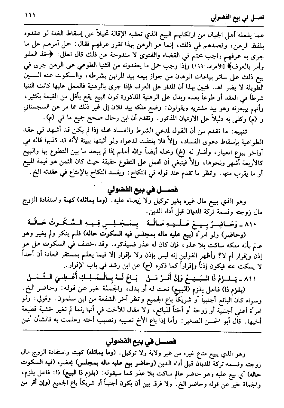وَهُوَ الَّذِي يَبِيع مَال غَيره بِغَيْر تَوْكِيل وَلَا إيصاء عَلَيْهِ. (وَمَا يماثله) كَهِبَة واستفادة الزَّوْج مَال زَوجته وَقِسْمَة تَرِكَة الْمديَان قبل أَدَاء الدّين. وَحَاضِرٌ بِيعَ عَلَيَهِ مَالُهُ بِمَجْلِسٍ فِيهِ السُّكُوتُ حَالُهُ (وحاضر) وَلَو امْرَأَة (بيع عَلَيْهِ مَاله بِمَجْلِس فِيهِ السُّكُوت حَاله) فَلم يُنكر وَلم يُغير وَهُوَ عَالم بِأَنَّهُ ملكه سَاكِت بِلَا عذر، فَإِن كَانَ لَهُ عذر فسيذكره. وَقد اخْتلف فِي السُّكُوت هَل هُوَ إِذن وَإِقْرَار أم لَا؟ وَأظْهر الْقَوْلَيْنِ إِنَّه لَيْسَ بِإِذن وَلَا بِإِقْرَار إِلَّا فِيمَا يعلم بمستقر الْعَادة أَن أحدا لَا يسكت عَنهُ فَيكون إِذْنا وإقراراً كَمَا ذكره (ح) عَن ابْن رشد فِي بَاب الْإِقْرَار. يَلزَمُ ذَا البَيْعُ وَإنْ أَقَرَّ مَنْ بَاعَ لَهُ بِالْمَلِكِ أُعْطِيَ الثَّمَنْ (يلْزم ذَا) فَاعل يلْزم (البيع) نعت لَهُ أَو بدل، وَالْجُمْلَة خبر عَن قَوْله: وحاضر الخ. وَسَوَاء كَانَ البَائِع أَجْنَبِيّا أَو شَرِيكا بَاعَ الْجَمِيع وَانْظُر آخر الشُّفْعَة من ابْن سَلمُون. وَقَوْلِي: وَلَو امْرَأَة أَعنِي أَجْنَبِيَّة أَو زَوْجَة أَو أُخْتا للْبَائِع، وَلَا مقَال للْأُخْت فِي أَنَّهَا إِنَّمَا لم تغير خشيَة قطيعة أَخِيهَا. قَالَ أَبُو الْحسن الصَّغِير: وَأما إِذا بَاعَ الْأَخ نصِيبه وَنصِيب أُخْته وَعلمت بِهِ فالشأن أَنَّهُنَّ