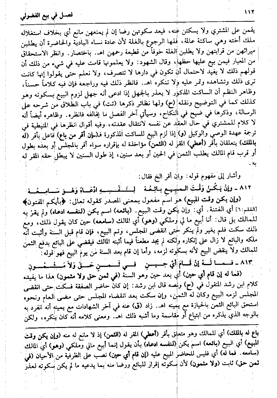 يقمن على المُشْتَرِي وَلَا يسكتن عَنهُ، فيعد سكوتهن رضَا إِن لم يمنعهن مَانع أَي بِخِلَاف استغلاله ملك أُخْته وَهِي ساكتة عَالِمَة، فلهَا الرُّجُوع بالغلة لِأَن عَادَة نسَاء الْبَادِيَة والحاضرة أَن يطلبن ميراثهن من قرابتهن وَلَا يطلبن الْغلَّة خوفًا من قطيعة رحمهن اه. بِاخْتِصَار. وَانْظُر الِاسْتِحْقَاق من المعيار فِيمَن بيع عَلَيْهَا حظها، وَقَالَ الشُّهُود: وَلَا يعلمونها قَامَت عَلَيْهِ فِي شَيْء من ذَلِك أَن قَوْلهم ذَلِك لَا يُفِيد لاحْتِمَال أَن تكون فِي دارها لَا تتصرف، وَلَا نعلم حَتَّى يَقُولُوا إِنَّهَا كَانَت ترى ذَلِك وتشاهده وتمر عَلَيْهِ وَلَا تنكره اه. فَانْظُر ذَلِك فِيهِ وراجعه فَإِن فِيهِ كلَاما حسنا، وَظَاهر النّظم أَن السَّاكِت الْمَذْكُور لَا يعْذر بِالْجَهْلِ إِذا ادّعى أَنه جهل لُزُوم البيع بسكوته وَهُوَ كَذَلِك كَمَا فِي التَّوْضِيح وَنَقله (ح) وَلها نَظَائِر ذكرهَا (تت) فِي بَاب الطَّلَاق من شَرحه على الرسَالَة، وَذكرهَا فِي ضيح فِي النِّكَاح، وَسَيَأْتِي آخر الْفَصْل مَا يُخَالِفهُ فَانْظُرْهُ. وَظَاهره أَيْضا أَنه لَا كَلَام للْمُشْتَرِي فِي حَال العقد عَن نَفسه لانتقال عقدته، وَفِيه أَقْوَال انظرها فِي الْمُتَيْطِيَّة فِي تَرْجَمَة عُهْدَة الْوَصِيّ وَالْوَكِيل (و) إِذا لزم البيع للساكت الْمَذْكُورَة ف (إِن أقرّ من بَاعَ) فَاعل بأقر (لَهُ بِالْملكِ) يتعلقان بأقر (أعطي) الْمقر لَهُ (الثّمن) مُؤَاخذَة لَهُ بِإِقْرَارِهِ سَوَاء أقرّ بِالْمَجْلِسِ أَو بعده بطول أَو قرب قَامَ الْمَالِك يطْلب الثّمن فِي الْحِين أَو بعد سِنِين، إِذْ طول السنين لَا يبطل حَقه الْمقر لَهُ بِهِ. وَأَشَارَ إِلَى مَفْهُوم قَوْله: وان أقرّ الخ فَقَالَ: وإنْ يَكُنْ وَقْتَ المبِيعِ بائِعُهْ لِنَفْسِهِ ادَّعَاهُ وَهْوَ سَامِعُهْ (وَإِن يكن وَقت الْمَبِيع) هُوَ اسْم مفعول بِمَعْنى الْمصدر كَقَوْلِه تَعَالَى: بأيكم الْمفْتُون} (الْقَلَم: 6) أَي الْفِتْنَة. أَي: وَإِن يكن وَقت البيع. (بَائِعه) اسْم يكن (لنَفسِهِ ادَّعَاهُ) وَلم يقرّ بِهِ للْمَالِك بل قَالَ: أَنا أبيع مَا لي وملكي (وَهُوَ) أَي الْمَالِك (سامعه) حِين كَانَ يَقُول ذَلِك، وَمَعَ ذَلِك سكت فَلم يُغير وَلم يُنكر حَتَّى انْقَضى الْمجْلس، وَتمّ البيع، فَإِن قَامَ قبل السّنة وَأثبت أَنه ملكه وَالْبَائِع لَا زَالَ على إِنْكَاره وَلكنه لم يجد مطعناً فِيمَا أثْبته الْمَالِك فَيَقْضِي على البَائِع بِدفع الثّمن للْمَالِك وَلَا ينْقض البيع لِأَنَّهُ بسكوته لزمَه، وَأما إِن قَامَ بعد السّنة من يَوْم البيع فَهُوَ قَوْله: فَمَا لَهُ إنْ قَامَ أيَّ حِينِ فِي ثَمنٍ حَقّ وَلاَ مَثْمُونِ (فَمَا لَهُ إِن قَامَ أَي حِين) أَي بعد حِين وَهُوَ السّنة (فِي ثمن حق وَلَا مثمون) هَذَا مَا يفِيدهُ كَلَام ابْن رشد الْمَنْقُول فِي (ح) وَنَصه قَالَ ابْن رشد: إِن كَانَ حَاضر الصَّفْقَة فَسكت حَتَّى انْقَضى الْمجْلس لزمَه البيع وَكَانَ لَهُ الثّمن، وَإِن سكت بعد انْقِضَاء الْمجْلس حَتَّى مضى الْعَام وَنَحْوه اسْتحق البَائِع الثّمن بالحيازة مَعَ يَمِينه اه. زَاد (ق) عَنهُ فِي آخر الشَّهَادَات مَعَ يَمِينه أَنه انْفَرد بِهِ بِالْوَجْهِ الَّذِي يذكرهُ من ابتياع أَو مقاسمة وَمَا أشبه ذَلِك اه. وَمعنى كَلَامه أَنه كَانَ يُنكره، وَلَكِن