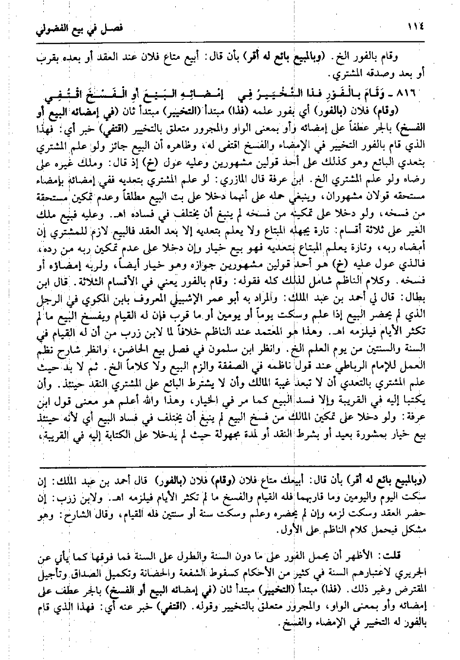 وَقَامَ بالفور الخ. (وبالمبيع بَائِع لَهُ أقرّ) بِأَن قَالَ: أبيع مَتَاع فلَان عِنْد العقد أَو بعده بِقرب أَو بعد وَصدقه المُشْتَرِي. وَقَامَ بالْفَوْرِ فَذا التَّخْيَيرُ فِي إمْضائِهِ البَيْعَ أوِ الْفَسْخَ اقْتُفِي (وَقَامَ) فلَان (بالفور) أَي بفور علمه (فَذا) مُبْتَدأ (التَّخْيِير) مُبْتَدأ ثَان (فِي إمضائه البيع أَو الْفَسْخ) بِالْجَرِّ عطفا على إمضائه وأو بِمَعْنى الْوَاو وَالْمَجْرُور مُتَعَلق بالتخيير (اقتفي) خبر أَي: فَهَذَا الَّذِي قَامَ بالفور التَّخْيِير فِي الْإِمْضَاء وَالْفَسْخ اقتفى لَهُ، وَظَاهره أَن البيع جَائِز وَلَو علم المُشْتَرِي بتعدي البَائِع وَهُوَ كَذَلِك على أحد قَوْلَيْنِ مشهورين وَعَلِيهِ عول (خَ) إِذْ قَالَ: وَملك غَيره على رِضَاهُ وَلَو علم المُشْتَرِي الخ. ابْن عَرَفَة قَالَ الْمَازرِيّ: لَو علم المُشْتَرِي بتعديه فَفِي إمضائه بإمضاء مُسْتَحقّه قَولَانِ مشهوران، وَيَنْبَغِي حمله على أَنَّهُمَا دخلا على بت البيع مُطلقًا وَعدم تَمْكِين مُسْتَحقَّة من فَسخه، وَلَو دخلا على تَمْكِينه من فَسخه لم يَنْبغ أَن يخْتَلف فِي فَسَاده اه. وَعَلِيهِ فَبيع ملك الْغَيْر على ثَلَاثَة أَقسَام: تَارَة يجهله الْمُبْتَاع وَلَا يعلم بتعديه إِلَّا بعد العقد فَالْبيع لَازم للْمُشْتَرِي إِن أَمْضَاهُ ربه، وَتارَة يعلم الْمُبْتَاع بتعديه فَهُوَ بيع خِيَار وَإِن دخلا على عدم تَمْكِين ربه من رده، فَالَّذِي عول عَلَيْهِ (خَ) هُوَ أحد قَوْلَيْنِ مشهورين جَوَازه وَهُوَ خِيَار أَيْضا، ولربه إمضاؤه أَو فَسخه. وَكَلَام النَّاظِم شَامِل لذَلِك كُله فَقَوله: وَقَامَ بالفور يَعْنِي فِي الْأَقْسَام الثَّلَاثَة. قَالَ ابْن بطال: قَالَ لي أَحْمد بن عبد الْملك: وَالْمرَاد بِهِ أَبُو عمر الإشبيلي الْمَعْرُوف بِابْن المكوي فِي الرجل الَّذِي لم يحضر البيع إِذا علم وَسكت يَوْمًا أَو يَوْمَيْنِ أَو مَا قرب فَإِن لَهُ الْقيام وَيفْسخ البيع مَا لم تكْثر الْأَيَّام فَيلْزمهُ اه. وَهَذَا هُوَ الْمُعْتَمد عِنْد النَّاظِم خلافًا لما لِابْنِ زرب من أَن لَهُ الْقيام فِي السّنة والسنتين من يَوْم الْعلم الخ. وَانْظُر ابْن سَلمُون فِي فصل بيع الحاضن، وَانْظُر شَارِح نظم الْعَمَل للْإِمَام الرباطي عِنْد قَول ناظمه فِي الصَّفْقَة والزم البيع وَلَا كلَاما الخ. ثمَّ لَا بُد حَيْثُ علم المُشْتَرِي بِالتَّعَدِّي أَن لَا تبعد غيبَة الْمَالِك وَأَن لَا يشْتَرط البَائِع على المُشْتَرِي النَّقْد حِينَئِذٍ. وَأَن يكتبا إِلَيْهِ فِي الْقَرِيبَة وَإِلَّا فسد البيع كَمَا مر فِي الْخِيَار، وَهَذَا وَالله أعلم هُوَ معنى قَول ابْن عَرَفَة: وَلَو دخلا على تَمْكِين الْمَالِك من فسخ البيع لم يَنْبغ أَن يخْتَلف فِي فَسَاد البيع أَي لِأَنَّهُ حِينَئِذٍ بيع خِيَار بمشورة بعيد أَو بِشَرْط النَّقْد أَو لمُدَّة مَجْهُولَة حَيْثُ لم يدخلا على الْكِتَابَة إِلَيْهِ فِي الْقَرِيبَة،