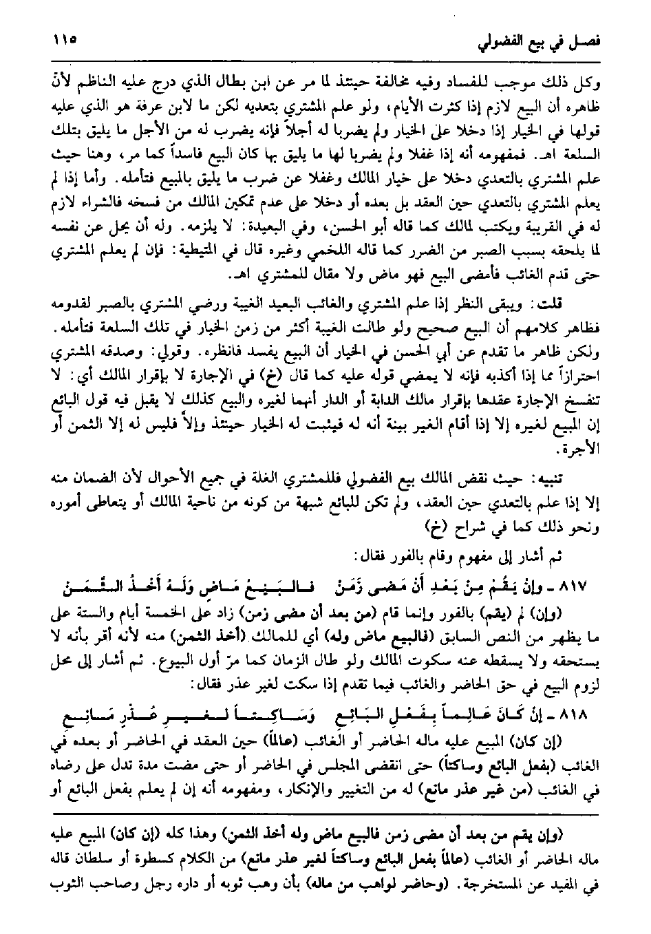 وكل ذَلِك مُوجب للْفَسَاد وَفِيه مُخَالفَة حِينَئِذٍ لما مر عَن ابْن بطال الَّذِي درج عَلَيْهِ النَّاظِم لأنّ ظَاهره أَن البيع لَازم إِذا كثرت الْأَيَّام، وَلَو علم المُشْتَرِي بتعديه لَكِن مَا لِابْنِ عَرَفَة هُوَ الَّذِي عَلَيْهِ قَوْلهَا فِي الْخِيَار إِذا دخلا على الْخِيَار وَلم يضربا لَهُ أَََجَلًا فَإِنَّهُ يضْرب لَهُ من الْأَجَل مَا يَلِيق بِتِلْكَ السّلْعَة اه. فمفهومه أَنه إِذا غفلا وَلم يضربا لَهَا مَا يَلِيق بهَا كَانَ البيع فَاسِدا كَمَا مر، وَهنا حَيْثُ علم المُشْتَرِي بِالتَّعَدِّي دخلا على خِيَار الْمَالِك وغفلا عَن ضرب مَا يَلِيق بِالْمَبِيعِ فَتَأَمّله. وَأما إِذا لم يعلم المُشْتَرِي بِالتَّعَدِّي حِين العقد بل بعده أَو دخلا على عدم تَمْكِين الْمَالِك من فَسخه فالشراء لَازم لَهُ فِي الْقَرِيبَة وَيكْتب لمَالِك كَمَا قَالَه أَبُو الْحسن، وَفِي الْبَعِيدَة: لَا يلْزمه. وَله أَن يحل عَن نَفسه لما يلْحقهُ بِسَبَب الصَّبْر من الضَّرَر كَمَا قَالَه اللَّخْمِيّ وَغَيره قَالَ فِي الْمُتَيْطِيَّة: فَإِن لم يعلم المُشْتَرِي حَتَّى قدم الْغَائِب فَأمْضى البيع فَهُوَ مَاض وَلَا مقَال للْمُشْتَرِي اه. قلت: وَيبقى النّظر إِذا علم المُشْتَرِي وَالْغَائِب الْبعيد الْغَيْبَة وَرَضي المُشْتَرِي بِالصبرِ لقدومه فَظَاهر كَلَامهم أَن البيع صَحِيح وَلَو طَالَتْ الْغَيْبَة أَكثر من زمن الْخِيَار فِي تِلْكَ السّلْعَة فَتَأَمّله. وَلَكِن ظَاهر مَا تقدم عَن أبي الْحسن فِي الْخِيَار أَن البيع يفْسد فَانْظُرْهُ. وَقَوْلِي: وَصدقه المُشْتَرِي احْتِرَازًا مِمَّا إِذا أكذبه فَإِنَّهُ لَا يمْضِي قَوْله عَلَيْهِ كَمَا قَالَ (خَ) فِي الْإِجَارَة لَا بِإِقْرَار الْمَالِك أَي: لَا تَنْفَسِخ الْإِجَارَة عقدهَا بِإِقْرَار مَالك الدَّابَّة أَو الدَّار أَنَّهُمَا لغيره وَالْبيع كَذَلِك لَا يقبل فِيهِ قَول البَائِع إِن الْمَبِيع لغيره إِلَّا إِذا أَقَامَ الْغَيْر بَيِّنَة أَنه لَهُ فَيثبت لَهُ الْخِيَار حِينَئِذٍ وإلاَّ فَلَيْسَ لَهُ إِلَّا الثّمن أَو الْأُجْرَة. تَنْبِيه: حَيْثُ نقض الْمَالِك بيع الْفُضُولِيّ فَلِلْمُشْتَرِي الْغلَّة فِي جَمِيع الْأَحْوَال لِأَن الضَّمَان مِنْهُ إِلَّا إِذا علم بِالتَّعَدِّي حِين العقد، وَلم تكن للْبَائِع شُبْهَة من كَونه من نَاحيَة الْمَالِك أَو يتعاطى أُمُوره وَنَحْو ذَلِك كَمَا فِي شرَّاح (خَ) . ثمَّ أَشَارَ إِلَى مَفْهُوم وَقَامَ بالفور فَقَالَ: وإنْ يَقُمْ مِنْ بَعْدِ أَنْ مَضى زَمَنْ فالبَيْعُ مَاضٍ وَلَهُ أَخْذُ الثَّمَنْ (وَإِن) لم (يقم) بالفور وَإِنَّمَا قَامَ (من بعد أَن مضى زمن) زَاد على الْخَمْسَة أَيَّام والستة على مَا يظْهر من النَّص السَّابِق (فَالْبيع مَاض وَله) أَي للْمَالِك (أَخذ الثّمن) مِنْهُ لِأَنَّهُ أقرّ بِأَنَّهُ لَا يسْتَحقّهُ وَلَا يسْقطهُ عَنهُ سكُوت الْمَالِك وَلَو طَال الزَّمَان كَمَا مرّ أول الْبيُوع. ثمَّ أَشَارَ إِلَى مَحل لُزُوم البيع فِي حق الْحَاضِر وَالْغَائِب فِيمَا تقدم إِذا سكت لغير عذر فَقَالَ: إنْ كَانَ عَالِماً بِفَعْلِ البَائِعِ وَسَاكِتاً لغيرِ عُذْرٍ مَانِعِ (إِن كَانَ) الْمَبِيع عَلَيْهِ مَاله الْحَاضِر أَو الْغَائِب (عَالما) حِين العقد فِي الْحَاضِر أَو بعده فِي الْغَائِب (بِفعل البَائِع وساكتاً) حَتَّى انْقَضى الْمجْلس فِي الْحَاضِر أَو حَتَّى مَضَت مُدَّة تدل على رِضَاهُ فِي الْغَائِب (من غير عذر مَانع) لَهُ من التَّغْيِير وَالْإِنْكَار، وَمَفْهُومه أَنه إِن لم يعلم بِفعل البَائِع أَو
