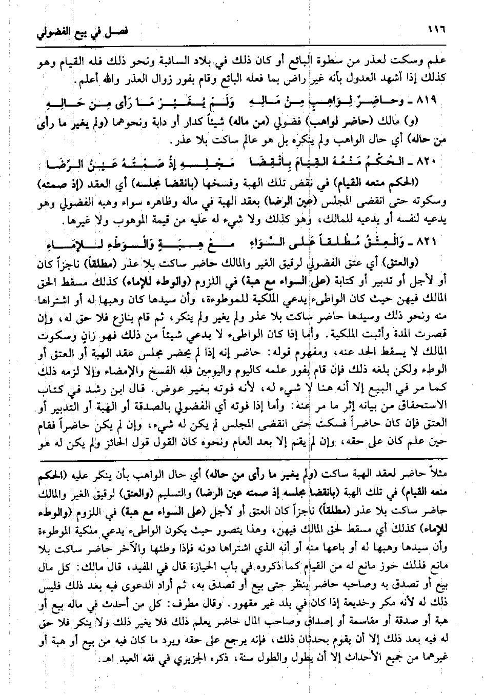 علم وَسكت لعذر من سطوة البَائِع أَو كَانَ ذَلِك فِي بِلَاد السائبة وَنَحْو ذَلِك فَلهُ الْقيام وَهُوَ كَذَلِك إِذا أشهد الْعُدُول بِأَنَّهُ غير رَاض بِمَا فعله البَائِع وَقَامَ بفور زَوَال الْعذر وَالله أعلم. وحاضِرٌ لِوَاهِبٍ مِنْ مَالِهِ وَلَمْ يُغَيِّرْ مَا رَأى مِن حَالِهِ (و) مَالك (حَاضر لواهب) فُضُولِيّ (من مَاله) شَيْئا كدار أَو دَابَّة وَنَحْوهمَا (وَلم يُغير مَا رأى من حَاله) أَي حَال الْوَاهِب وَلم يُنكره بل هُوَ عَالم سَاكِت بِلَا عذر. الحُكْمُ مَنْعُهُ القِيَامَ بِانْقِضَا مَجْلِسهِ إذْ صَمْتُهُ عَيْنُ الرِّضَا (الحكم مَنعه الْقيام) فِي نقض تِلْكَ الْهِبَة وفسخها (بانقضا مَجْلِسه) أَي العقد (إِذْ صمته) وسكوته حَتَّى انْقَضى الْمجْلس (عين الرِّضَا) بِعقد الْهِبَة فِي مَاله وَظَاهره سَوَاء وهبه الْفُضُولِيّ وَهُوَ يَدعِيهِ لنَفسِهِ أَو يَدعِيهِ للْمَالِك، وَهُوَ كَذَلِك وَلَا شَيْء لَهُ عَلَيْهِ من قيمَة الْمَوْهُوب وَلَا غَيرهَا. وَالْعِتْقُ مُطْلقاً عَلى السَّوَاءِ معْ هِبَةٍ وَالْوَطْءِ للإمَاءِ (وَالْعِتْق) أَي عتق الْفُضُولِيّ لرقيق الْغَيْر وَالْمَالِك حَاضر سَاكِت بِلَا عذر (مُطلقًا) ناجزاً كَانَ أَو لأجل أَو تَدْبِير أَو كِتَابَة (على السوَاء مَعَ هبة) فِي اللُّزُوم (وَالْوَطْء للإماء) كَذَلِك مسْقط الْحق الْمَالِك فِيهِنَّ حَيْثُ كَانَ الواطىء يَدعِي الملكية للموطوءة، وَأَن سَيِّدهَا كَانَ وَهبهَا لَهُ أَو اشْتَرَاهَا مِنْهُ وَنَحْو ذَلِك وسيدها حَاضر سَاكِت بِلَا عذر وَلم يُغير وَلم يُنكر، ثمَّ قَامَ يُنَازع فَلَا حق لَهُ، وَإِن قصرت الْمدَّة وَأثبت الملكية. وَأما إِذا كَانَ الواطىء لَا يَدعِي شَيْئا من ذَلِك فَهُوَ زانٍ وسكوت الْمَالِك لَا يسْقط الْحَد عَنهُ، وَمَفْهُوم قَوْله: حَاضر إِنَّه إِذا لم يحضر مجْلِس عقد الْهِبَة أَو الْعتْق أَو الْوَطْء وَلَكِن بلغه ذَلِك فَإِن قَامَ بفور علمه كَالْيَوْمِ واليومين فَلهُ الْفَسْخ والإمضاء وَإِلَّا لزمَه ذَلِك كَمَا مر فِي البيع إِلَّا أَنه هُنَا لَا شَيْء لَهُ، لِأَنَّهُ فَوته بِغَيْر عوض. قَالَ ابْن رشد فِي كتاب الِاسْتِحْقَاق من بَيَانه إِثْر مَا مر عَنهُ: وَأما إِذا فَوته أَي الْفُضُولِيّ بِالصَّدَقَةِ أَو الْهِبَة أَو التَّدْبِير أَو الْعتْق فَإِن كَانَ حَاضرا فَسكت حَتَّى انْقَضى الْمجْلس لم يكن لَهُ شَيْء، وَإِن لم يكن حَاضرا فَقَامَ حِين علم كَانَ على حَقه، وَإِن لم يقم إِلَّا بعد الْعَام وَنَحْوه كَانَ القَوْل قَول الْحَائِز وَلم يكن لَهُ هُوَ