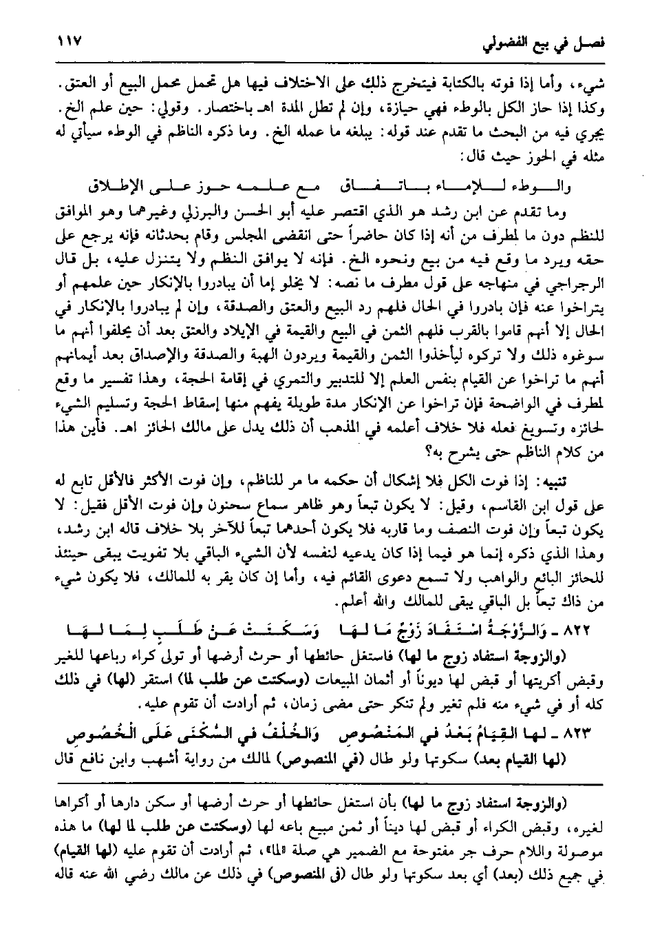 شَيْء، وَأما إِذا فَوته بِالْكِتَابَةِ فيتخرج ذَلِك على الِاخْتِلَاف فِيهَا هَل تحمل محمل البيع أَو الْعتْق. وَكَذَا إِذا حَاز الْكل بِالْوَطْءِ فَهِيَ حِيَازَة، وَإِن لم تطل الْمدَّة اه بِاخْتِصَار. وَقَوْلِي: حِين علم الخ. يجْرِي فِيهِ من الْبَحْث مَا تقدم عِنْد قَوْله: يبلغهُ مَا عمله الخ. وَمَا ذكره النَّاظِم فِي الْوَطْء سَيَأْتِي لَهُ مثله فِي الْحَوْز حَيْثُ قَالَ: وَالْوَطْء للإماء بِاتِّفَاق مَعَ علمه حوز على الْإِطْلَاق وَمَا تقدم عَن ابْن رشد هُوَ الَّذِي اقْتصر عَلَيْهِ أَبُو الْحسن والبرزلي وَغَيرهمَا وَهُوَ الْمُوَافق للنظم دون مَا لمطرف من أَنه إِذا كَانَ حَاضرا حَتَّى انْقَضى الْمجْلس وَقَامَ بحدثانه فَإِنَّهُ يرجع على حَقه وَيرد مَا وَقع فِيهِ من بيع وَنَحْوه الخ. فَإِنَّهُ لَا يُوَافق النّظم وَلَا يتنزل عَلَيْهِ، بل قَالَ الرجراجي فِي منهاجه على قَول مطرف مَا نَصه: لَا يَخْلُو إِمَّا أَن يبادروا بالإنكار حِين علمهمْ أَو يتراخوا عَنهُ فَإِن بَادرُوا فِي الْحَال فَلهم رد البيع وَالْعِتْق وَالصَّدَََقَة، وَإِن لم يبادروا بالإنكار فِي الْحَال إِلَّا أَنهم قَامُوا بِالْقربِ فَلهم الثّمن فِي البيع وَالْقيمَة فِي الإيلاد وَالْعِتْق بعد أَن يحلفوا أَنهم مَا سوغوه ذَلِك وَلَا تَرَكُوهُ ليأخذوا الثّمن وَالْقيمَة ويردون الْهِبَة وَالصَّدَََقَة والإصداق بعد أَيْمَانهم أَنهم مَا تراخوا عَن الْقيام بِنَفس الْعلم إِلَّا للتدبير والتمري فِي إِقَامَة الْحجَّة وَهَذَا تَفْسِير مَا وَقع لمطرف فِي الْوَاضِحَة فَإِن تراخوا عَن الْإِنْكَار مُدَّة طَوِيلَة يفهم مِنْهَا إِسْقَاط الْحجَّة وَتَسْلِيم الشَّيْء لحائزه وتسويغ فعله فَلَا خلاف أعلمهُ فِي الْمَذْهَب أَن ذَلِك يدل على مَالك الْحَائِز اه. فَأَيْنَ هَذَا من كَلَام النَّاظِم حَتَّى يشْرَح بِهِ؟ تَنْبِيه: إِذا فَوت الْكل فَلَا إِشْكَال أَن حكمه مَا مر للناظم، وَإِن فَوت الْأَكْثَر فالأقل تَابع لَهُ على قَول ابْن الْقَاسِم، وَقيل: لَا يكون تبعا وَهُوَ ظَاهر سَماع سَحْنُون وَإِن فَوت الْأَقَل فَقيل: لَا يكون تبعا وَإِن فَوت النّصْف وَمَا قاربه فَلَا يكون أَحدهمَا تبعا للْآخر بِلَا خلاف قَالَه ابْن رشد، وَهَذَا الَّذِي ذكره إِنَّمَا هُوَ فِيمَا إِذا كَانَ يَدعِيهِ لنَفسِهِ لِأَن الشَّيْء الْبَاقِي بِلَا تَفْوِيت يبْقى حِينَئِذٍ للحائز البَائِع والواهب وَلَا تسمع دَعْوَى الْقَائِم فِيهِ، وَأما إِن كَانَ يقر بِهِ للْمَالِك، فَلَا يكون شَيْء من ذَاك تبعا بل الْبَاقِي يبْقى للْمَالِك وَالله أعلم. وَالزَّوْجَةُ اسْتَفَادَ زَوْجٌ مَا لهَا وَسَكَتَتْ عَنْ طَلَبٍ لِمَا لهَا (وَالزَّوْجَة اسْتَفَادَ زوج مَا لَهَا) فاستغل حائطها أَو حرث أرْضهَا أَو تولى كِرَاء رباعها للْغَيْر وَقبض أكريتها أَو قبض لَهَا ديوناً أَو أَثمَان المبيعات (وسكتت عَن طلب لما) اسْتَقر (لَهَا) فِي ذَلِك كُله أَو فِي شَيْء مِنْهُ فَلم تغير وَلم تنكر حَتَّى مضى زمَان، ثمَّ أَرَادَت أَن تقوم عَلَيْهِ. لَهَا القِيَامُ بَعْدُ فِي المَنْصُوصِ وَالخُلْفُ فِي السُّكْنَى عَلَى الْخُصُوصِ (لَهَا الْقيام بعد) سكُوتهَا وَلَو طَال (فِي الْمَنْصُوص) لمَالِك من رِوَايَة أَشهب وَابْن نَافِع قَالَ