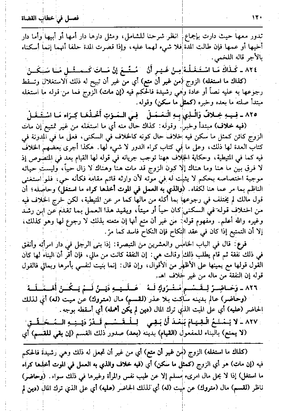 تَدور مَعهَا حَيْثُ دارت بِإِجْمَاع. انْظُر شرحنا للشامل، وَمثل دارها دَار أمهَا أَو أَبِيهَا وَأما دَار أَخِيهَا أَو عَمها فَإِن طَالَتْ الْمدَّة فَلَا شَيْء لَهما عَلَيْهِ، وَإِذا قصرت الْمدَّة حلفا أَنَّهُمَا إِنَّمَا أسكناه بِالْأَجْرِ قَالَه اللَّخْمِيّ. كَذَاكَ مَا اسْتَغَلَّهُ مِنْ غَيْرِ أَنْ مُتِّعَ إنْ مَاتَ كَمثْلِ مَا سَكَنْ (كَذَاك مَا استغله) الزَّوْج (من غير أَن متع) أَي من غير أَن تبيح لَهُ ذَلِك الاستغلال وَتسقط رُجُوعهَا بِهِ عَلَيْهِ نصا أَو عَادَة وَهِي رَشِيدَة فَالْحكم فِيهِ (إِن مَاتَ) الزَّوْج فَمَا من قَوْله مَا استغله مُبْتَدأ صلته مَا بعده وَخَبره (كَمثل مَا سكن) وَقَوله. فِيهِ خِلافٌ وَالَّذِي بِهِ الْعَمَلْ فِي المَوْتِ أَخْذُهَا كِرَاء مَا اسْتَغَلْ (فِيهِ خلاف) مُبْتَدأ وَخبر. وَقَوله: كَذَاك حَال مِنْهُ أَي مَا استغله من غير تمتيع إِن مَاتَ الزَّوْج كَائِن كَمثل مَا سكن فِيهِ خلاف حَال كَونه كالخلاف فِي السُّكْنَى، فعلى مَا فِي الْمُدَوَّنَة فِي كتاب الْعدة لَهَا ذَلِك، وعَلى مَا فِي كتاب كِرَاء الدّور لَا شَيْء لَهَا. هَكَذَا أجْرى بَعضهم الْخلاف فِيهِ كَمَا فِي الْمُتَيْطِيَّة، وحكاية الْخلاف هَهُنَا توجب جَرَيَانه فِي قَوْله لَهَا الْقيام بعد فِي الْمَنْصُوص إِذْ لَا فرق بَين مَا هُنَا وَمَا هُنَاكَ إِلَّا كَون الزَّوْج قد مَاتَ هُنَا وَهُنَاكَ لَا زَالَ حَيا، وَلَيْسَت حَيَاته مُوجبَة اخْتِصَاصه بِحكم لَا يثبت لَهُ فِي مَوته لِأَن وَارثه قَائِم مقَامه فَكَأَنَّهُ حَيّ، فَلَو اسْتغنى النَّاظِم بِمَا مر عَمَّا هُنَا لكفاه. (وَالَّذِي بِهِ الْعَمَل فِي الْمَوْت أَخذهَا كِرَاء مَا استغل) وَحَاصِله؛ أَن قَول مَالك لم يخْتَلف فِي رُجُوعهَا بِمَا أكله من مَالهَا كَمَا مر عَن الْمُتَيْطِيَّة، لَكِن خرج الْخلاف فِيهِ من اخْتِلَاف قَوْله فِي السُّكْنَى كَانَ حَيا أَو مَيتا، ويقيد هَذَا الْعَمَل بِمَا تقدم عَن ابْن رشد وَغَيره وَالله أعلم. وَمَفْهُوم قَوْله: من غير أَن متع أَنَّهَا إِن متعته بذلك لَا رُجُوع لَهَا وَهُوَ كَذَلِك، إِلَّا أَن التمتيع إِذا كَانَ فِي عقد النِّكَاح فَإِن النِّكَاح فَاسد كَمَا مرّ. فرع: قَالَ فِي الْبَاب الْخَامِس وَالْعِشْرين من التَّبْصِرَة: إِذا بنى الرجل فِي دَار امْرَأَته وَأنْفق فِي ذَلِك نَفَقَة ثمَّ قَامَ يطْلب ذَلِك وَقَالَت هِيَ: إِن النَّفَقَة كَانَت من مَالِي، فَإِن أقرّ أَن الْبناء لَهَا كَانَ القَوْل قَوْلهَا مَعَ يَمِينهَا على الْأَظْهر من الْأَقْوَال، وَإِن قَالَ: إِنَّمَا بنيت لنَفْسي بأمرها وبمالي فَالْقَوْل قَوْله إِن النَّفَقَة من مَاله من غير خلاف اه. وَحَاضِرٌ لِقَسْمِ مَتْرُوكٍ لَهُ عَلَيْهِ دَيْنٌ لَمْ يَكُنْ أَهْمَلَهُ (وحاضر) عَالم بِدِينِهِ سَاكِت بِلَا عذر (لقسم) مَال (مَتْرُوك) عَن ميت (لَهُ) أَي لذَلِك الْحَاضِر (عَلَيْهِ) أَي على الْمَيِّت الَّذِي ترك المَال (دين لم يكن أهمله) أَي أسْقطه بِوَجْه. لَا يُمْنَعُ الْقِيَامَ بَعْدَ أَنْ بَقِي لِلْقَسْم قَدْرُ دَيْنِهِ المُحَقَّقِ (لَا يمْنَع) بِالْبِنَاءِ للْمَفْعُول (الْقيام) بِدِينِهِ (بعد) صُدُور ذَلِك الْقسم (إِن بَقِي للقسم) أَي