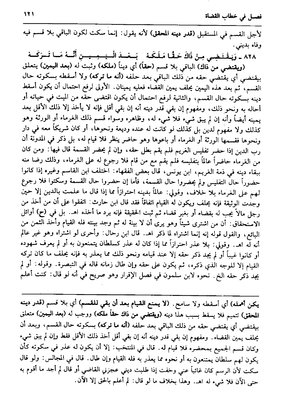 لأجل الْقسم فِي الْمُسْتَقْبل (قدر دينه الْمُحَقق) لِأَنَّهُ يَقُول: إِنَّمَا سكت لكَون الْبَاقِي بِلَا قسم فِيهِ وفاه بديني. وَيَقْتَضِي مِنْ ذَاكَ حَقًّا مَلَكَهْ بَعْدَ الْيَمِينِ أَنَّهُ مَا تَرَكَهْ (وَيَقْتَضِي من ذَاك) الْبَاقِي بِلَا قسم (حَقًا) أَي دينا (ملكه) وَثَبت لَهُ (بعد الْيَمين) يتَعَلَّق بيقتضي أَي يَقْتَضِي حَقه من ذَلِك الْبَاقِي بعد حلفه (أَنه مَا تَركه) وَلَا أسْقطه بسكوته حَال الْقسم، ثمَّ بعد هَذِه الْيَمين يحلف يَمِين الْقَضَاء فَعَلَيهِ يمينان. الأولى لرفع احْتِمَال أَن يكون أسقط دينه بسكوته حَال الْقسم، وَالثَّانيَِة لرفع احْتِمَال أَن يكون اقْتضى حَقه من الْمَيِّت فِي حَيَاته أَو أَحَالهُ بِهِ وَنَحْو ذَلِك، وَمَفْهُوم إِن بَقِي قدر دِيَته أَنه إِن بَقِي أقل فَإِنَّهُ لَا يَأْخُذ إِلَّا ذَلِك الْأَقَل بعد يَمِينه أَيْضا وَأَنه إِن لم يبْق شَيْء فَلَا شَيْء لَهُ، وَظَاهره وَسَوَاء قسم ذَلِك الْغُرَمَاء أَو الْوَرَثَة وَهُوَ كَذَلِك وَلَا مَفْهُوم لدين بل كَذَلِك لَو كَانَت لَهُ عِنْده وَدِيعَة وَنَحْوهَا، أَو كَانَ شَرِيكا مَعَه فِي دَار وَنَحْوهَا فَقَسمهَا الْوَرَثَة أَو الْغُرَمَاء أَو باعوها وَهُوَ حَاضر ينظر فَلَا قيام لَهُ، بل ذكر فِي الْمُدَوَّنَة أَن رب الدّين إِذا حضر تفليس الْغَرِيم فَلم يقم بَطل حَقه، وَإِن لم يحضر الْقِسْمَة قَالَ فِيهَا: وَمن كَانَ من الْغُرَمَاء حَاضرا عَالما بتفليسه فَلم يقم مَعَ من قَامَ فَلَا رُجُوع لَهُ على الْغُرَمَاء، وَذَلِكَ رضَا مِنْهُ بِبَقَاء دينه فِي ذمَّة الْغَرِيم، ابْن يُونُس، قَالَ بعض الْفُقَهَاء: اخْتلف ابْن الْقَاسِم وَغَيره إِذا كَانُوا حضوراً حَال التَّفْلِيس وَلم يحضروا حَال الْقِسْمَة، فَأَما إِن حَضَرُوا حَال الْقِسْمَة وسكتوا فَلَا رُجُوع لَهُم على الْغُرَمَاء بِلَا خلاف، وَقَوْلِي: عَالما بِدِينِهِ احْتِرَازًا مِمَّا إِذا قَالَ مَا علمت بِالدّينِ إِلَّا حِين وجدت الْوَثِيقَة فَإِنَّهُ يحلف وَيكون لَهُ الْقيام اتِّفَاقًا فقد قَالَ ابْن حَارِث: اتَّفقُوا على أَن من أَخذ من رجل مَالا يجب لَهُ بِقَضَاء أَو بِغَيْر قَضَاء ثمَّ ثَبت الْحَقِيقَة فَإِنَّهُ يرد مَا أَخذه اه. بل فِي (ح) أَوَائِل الِاسْتِحْقَاق: أَن من اشْترى شَيْئا وَهُوَ يرى أَن لَا بَيِّنَة لَهُ ثمَّ وجد بَينته فَلهُ الْقيام وَأخذ الثّمن من البَائِع، وَالْقَوْل قَوْله إِنَّه إِنَّمَا اشْتَرَاهُ لما ذكر اه. قَالَ ابْن رحال: وَأَحْرَى لَو اشْتَرَاهُ وَهُوَ غير عَالم أَنه لَهُ اه. وَقَوْلِي: بِلَا عذر احْتِرَازًا مِمَّا إِذا كَانَ لَهُ عذر كسلطان يتمنعون بِهِ أَو لم يعرف شُهُوده أَو كَانُوا غيباً أَو لم يجد ذكر حَقه إِلَّا عِنْد قِيَامه وَنَحْو ذَلِك مِمَّا يعْذر بِهِ فَإِنَّهُ يحلف مَا كَانَ تَركه الْقيام إِلَّا للْوَجْه الَّذِي ذكره، ثمَّ يكون على حَقه وَإِن طَال زَمَانه قَالَه فِي التَّبْصِرَة. وَقَوله: أَو لم يجد ذكر حَقه الخ. نَحوه لِابْنِ سَلمُون فِي فصل الْإِقْرَار وَهُوَ صَرِيح فِي أَنه لَو قَالَ: كنت أعلم