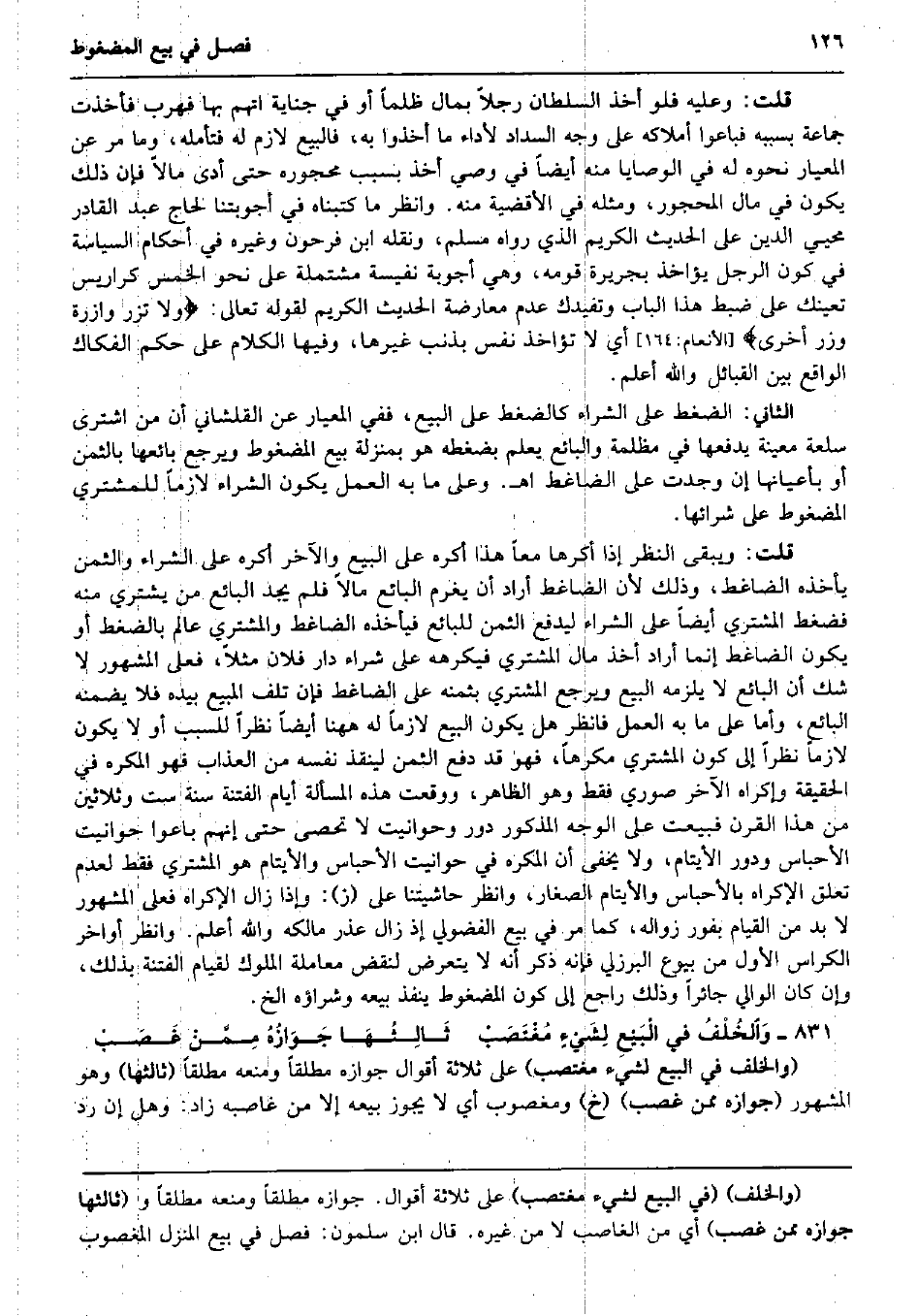 قلت: وَعَلِيهِ فَلَو أَخذ السُّلْطَان رجلا بِمَال ظلما أَو فِي جِنَايَة اتهمَ بهَا فهرب فَأخذت جمَاعَة بِسَبَبِهِ فباعوا أملاكه على وَجه السداد لأَدَاء مَا أخذُوا بِهِ، فَالْبيع لَازم لَهُ فَتَأَمّله، وَمَا مر عَن المعيار نَحوه لَهُ فِي الْوَصَايَا مِنْهُ أَيْضا فِي وَصِيّ أَخذ بِسَبَب مَحْجُوره حَتَّى أدّى مَالا فَإِن ذَلِك يكون فِي مَال الْمَحْجُور، وَمثله فِي الْأَقْضِيَة مِنْهُ. وَانْظُر مَا كتبناه فِي أجوبتنا لحاج عبد الْقَادِر محيي الدّين على الحَدِيث الْكَرِيم الَّذِي رَوَاهُ مُسلم، وَنَقله ابْن فَرِحُونَ وَغَيره فِي أَحْكَام السياسة فِي كَون الرجل يُؤَاخذ بجريرة قومه، وَهِي أجوبة نفيسة مُشْتَمِلَة على نَحْو الْخمس كراريس تعينك على ضبط هَذَا الْبَاب وتفيدك عدم مُعَارضَة الحَدِيث الْكَرِيم لقَوْله تَعَالَى: وَلَا تزر وَازِرَة وزر أُخْرَى} (الْأَنْعَام: 164) أَي لَا تؤاخذ نفس بذنب غَيرهَا، وفيهَا الْكَلَام على حكم الفكاك الْوَاقِع بَين الْقَبَائِل وَالله أعلم. الثَّانِي: الضغط على الشِّرَاء كالضغط على البيع، فَفِي المعيار عَن القلشاني أَن من اشْترى سلْعَة مُعينَة يَدْفَعهَا فِي مظْلمَة وَالْبَائِع يعلم بضغطه هُوَ بِمَنْزِلَة بيع المضغوط وَيرجع بَائِعهَا بِالثّمن أَو بِأَعْيَانِهَا إِن وجدت على الضاغط اه. وعَلى مَا بِهِ الْعَمَل يكون الشِّرَاء لَازِما للْمُشْتَرِي المضغوط على شِرَائهَا. قلت: وَيبقى النّظر إِذا أكرها مَعًا هَذَا أكره على البيع وَالْآخر أكره على الشِّرَاء وَالثمن يَأْخُذهُ الضاغط، وَذَلِكَ لِأَن الضاغط أَرَادَ أَن يغرم البَائِع مَالا فَلم يجد البَائِع من يَشْتَرِي مِنْهُ فضغط المُشْتَرِي أَيْضا على الشِّرَاء ليدفع الثّمن للْبَائِع فَيَأْخذهُ الضاغط وَالْمُشْتَرِي عَالم بالضغط أَو يكون الضاغط إِنَّمَا أَرَادَ أَخذ مَال المُشْتَرِي فيكرهه على شِرَاء دَار فلَان مثلا، فعلى الْمَشْهُور لَا شكّ أَن البَائِع لَا يلْزمه البيع وَيرجع المُشْتَرِي بِثمنِهِ على الضاغط فَإِن تلف الْمَبِيع بِيَدِهِ فَلَا يضمنهُ البَائِع، وَأما على مَا بِهِ الْعَمَل فَانْظُر هَل يكون البيع لَازِما لَهُ هَهُنَا أَيْضا نظرا للسبب أَو لَا يكون لَازِما نظرا إِلَى كَون المُشْتَرِي مكْرها، فَهُوَ قد دفع الثّمن لينقذ نَفسه من الْعَذَاب فَهُوَ الْمُكْره فِي الْحَقِيقَة وإكراه الآخر صوري فَقَط وَهُوَ الظَّاهِر، وَوَقعت هَذِه الْمَسْأَلَة أَيَّام الْفِتْنَة سنة سِتّ وَثَلَاثِينَ من هَذَا الْقرن فبيعت على الْوَجْه الْمَذْكُور دور وحوانيت لَا تحصى حَتَّى إِنَّهُم باعوا حوانيت الأحباس ودور الْأَيْتَام وَلَا يخفى أَن الْمُكْره فِي حوانيت الأحباس والأيتام هُوَ المُشْتَرِي فَقَط لعدم تعلق الْإِكْرَاه بالأحباس والأيتام الصغار، وَانْظُر حاشيتنا على (ز) : وَإِذا زَالَ الْإِكْرَاه فعلى الْمَشْهُور لَا بُد من الْقيام بفور زَوَاله، كَمَا مر فِي بيع الْفُضُولِيّ إِذْ زَالَ عذر مَالِكه وَالله أعلم. وَانْظُر أَوَاخِر الكراس الأول من بُيُوع الْبُرْزُليّ فَإِنَّهُ ذكر أَنه لَا يتَعَرَّض لنقض مُعَاملَة الْمُلُوك لقِيَام الْفِتْنَة بذلك، وَإِن كَانَ الْوَالِي جائراً وَذَلِكَ رَاجع إِلَى كَون المضغوط ينفذ بَيْعه وشراؤه الخ. وَالخُلْفُ فِي الْبَيْعِ لِشَيْءٍ مُغْتَصَبْ ثَالِثُهَا جَوَازُهُ مِمَّنْ غَصَبْ (وَالْخلف فِي البيع لشَيْء مغتصب) على ثَلَاثَة أَقْوَال جَوَازه مُطلقًا وَمنعه مُطلقًا (ثَالِثهَا) وَهُوَ الْمَشْهُور (جَوَازه مِمَّن غصب) (خَ) ومغصوب أَي لَا يجوز بَيْعه إِلَّا من غاصبه زَاد: وَهل إِن رد