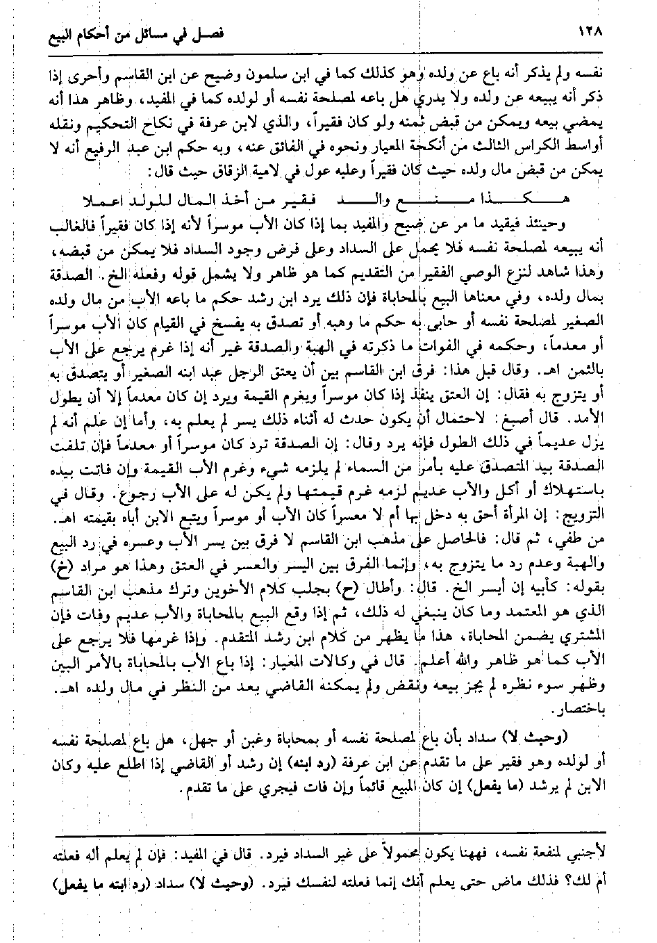 نَفسه وَلم يذكر أَنه بَاعَ عَن وَلَده وَهُوَ كَذَلِك كَمَا فِي ابْن سَلمُون وضيح عَن ابْن الْقَاسِم وَأَحْرَى إِذا ذكر أَنه يَبِيعهُ عَن وَلَده وَلَا يدْرِي هَل بَاعه لمصْلحَة نَفسه أَو لوَلَده كَمَا فِي الْمُفِيد، وَظَاهر هَذَا أَنه يمْضِي بَيْعه وَيُمكن من قبض ثمنه وَلَو كَانَ فَقِيرا، وَالَّذِي لِابْنِ عَرَفَة فِي نِكَاح التَّحْكِيم وَنَقله أواسط الكراس الثَّالِث من أنكحة المعيار وَنَحْوه فِي الْفَائِق عَنهُ، وَبِه حكم ابْن عبد الرفيع أَنه لَا يُمكن من قبض مَال وَلَده حَيْثُ كَانَ فَقِيرا وَعَلِيهِ عول فِي لامية الزقاق حَيْثُ قَالَ: هَكَذَا منع وَالِد فَقير من أَخذ المَال للْوَلَد اعملا وَحِينَئِذٍ فيقيد مَا مر عَن ضيح والمفيد بِمَا إِذا كَانَ الْأَب مُوسِرًا لِأَنَّهُ إِذا كَانَ فَقِيرا فالغالب أَنه يَبِيعهُ لمصْلحَة نَفسه فَلَا يحمل على السداد وعَلى فرض وجود السداد فَلَا يُمكن من قَبضه، وَهَذَا شَاهد لنزع الْوَصِيّ الْفَقِير من التَّقْدِيم كَمَا هُوَ ظَاهر وَلَا يَشْمَل قَوْله وَفعله الخ. الصَّدَقَة بِمَال وَلَده، وَفِي مَعْنَاهَا البيع بالمحاباة فَإِن ذَلِك يرد ابْن رشد حكم مَا بَاعه الْأَب من مَال وَلَده الصَّغِير لمصْلحَة نَفسه أَو حابى بِهِ حكم مَا وهبه أَو تصدق بِهِ يفْسخ فِي الْقيام كَانَ الْأَب مُوسِرًا أَو معدماً، وَحكمه فِي الْفَوات مَا ذكرته فِي الْهِبَة وَالصَّدَََقَة غير أَنه إِذا غرم يرجع على الْأَب بِالثّمن اه. وَقَالَ قبل هَذَا: فرق ابْن الْقَاسِم بَين أَن يعْتق الرجل عبد ابْنه الصَّغِير أَو يتَصَدَّق بِهِ أَو يتَزَوَّج بِهِ فَقَالَ: إِن الْعتْق ينفذ إِذا كَانَ مُوسِرًا وَيغرم الْقيمَة وَيرد إِن كَانَ معدماً إِلَّا أَن يطول الأمد. قَالَ أصبغ: لاحْتِمَال أَن يكون حدث لَهُ أثْنَاء ذَلِك يسر لم يعلم بِهِ، وَأما إِن علم أَنه لم يزل عديماً فِي ذَلِك الطول فَإِنَّهُ يرد وَقَالَ: إِن الصَّدَقَة ترد كَانَ مُوسِرًا أَو معدماً فَإِن تلفت الصَّدَقَة بيد الْمُتَصَدّق عَلَيْهِ بِأَمْر من السَّمَاء لم يلْزمه شَيْء وَغرم الْأَب الْقيمَة وَإِن فَاتَت بِيَدِهِ باستهلاك أَو أكل وَالْأَب عديم لزمَه غرم قيمتهَا وَلم يكن لَهُ على الْأَب رُجُوع. وَقَالَ فِي التَّزْوِيج: إِن الْمَرْأَة أَحَق بِهِ دخل بهَا أم لَا مُعسرا كَانَ الْأَب أَو مُوسِرًا وَيتبع الابْن أَبَاهُ بِقِيمَتِه اه. من طفي، ثمَّ قَالَ: فَالْحَاصِل على مَذْهَب ابْن الْقَاسِم لَا فرق بَين يسر الْأَب وعسره فِي رد البيع وَالْهِبَة وَعدم رد مَا يتَزَوَّج بِهِ، وَإِنَّمَا الْفرق بَين الْيُسْر والعسر فِي الْعتْق وَهَذَا هُوَ مُرَاد (خَ) بقوله: كأبيه إِن أيسر الخ. قَالَ: وَأطَال (ح) بجلب كَلَام الْأَخَوَيْنِ وَترك مَذْهَب ابْن الْقَاسِم الَّذِي هُوَ الْمُعْتَمد وَمَا كَانَ يَنْبَغِي لَهُ ذَلِك، ثمَّ إِذا وَقع البيع بالمحاباة وَالْأَب عديم وَفَاتَ فَإِن المُشْتَرِي يضمن الْمُحَابَاة هَذَا مَا يظْهر من كَلَام ابْن رشد الْمُتَقَدّم. وَإِذا غرمها فَلَا يرجع على الْأَب كَمَا هُوَ ظَاهر وَالله أعلم. قَالَ فِي وكالات المعيار: إِذا بَاعَ الْأَب بالمحاباة بِالْأَمر الْبَين وَظهر سوء نظره لم يجز بَيْعه وَنقض وَلم يُمكنهُ القَاضِي بعد من النّظر فِي مَال وَلَده اه. بِاخْتِصَار. (وَحَيْثُ لَا) سداد بِأَن بَاعَ لمصْلحَة نَفسه أَو بمحاباة وغبن أَو جهل، هَل بَاعَ لمصْلحَة نَفسه أَو لوَلَده وَهُوَ فَقير على مَا تقدم عَن ابْن عَرَفَة (رد ابْنه) إِن رشد أَو القَاضِي إِذا اطلع عَلَيْهِ وَكَانَ الابْن لم يرشد (مَا يفعل) إِن كَانَ الْمَبِيع قَائِما وَإِن فَاتَ فَيجْرِي على مَا تقدم.