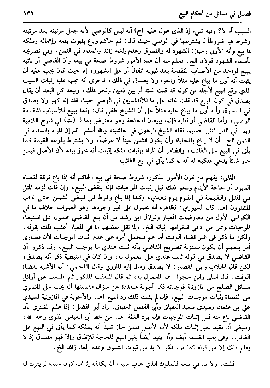 السَّبَب أم لَا؟ وَفِيه شَيْء إِذْ الَّذِي عول عَلَيْهِ (خَ) أَنه لَيْسَ كالوصي لِأَنَّهُ جعل مرتبته بعد مرتبته وَشرط فِيهِ شُرُوطًا لم يشترطها فِي الْوَصِيّ حَيْثُ قَالَ: ثمَّ حَاكم وَبَاعَ بِثُبُوت يتمه وإهماله وَملكه لما بيع وَأَنه الأولى وحيازة الشُّهُود لَهُ والتسوق وَعدم إِلْغَاء زَائِد والسداد فِي الثّمن، وَفِي تصريحه بأسماء الشُّهُود قَولَانِ الخ. فَعلم مِنْهُ أَن هَذِه الْأُمُور شُرُوط صِحَة فِي بَيْعه وَأَن القَاضِي أَو نَائِبه يَبِيع لوَاحِد من الْأَسْبَاب الْمُتَقَدّمَة بعد ثُبُوته اتِّفَاقًا أَو على الْمَشْهُور، إِذْ حَيْثُ كَانَ يجب عَلَيْهِ أَن يثبت أَنه أولى مَا يُبَاع عَلَيْهِ مثلا وَنَحْوه وَلَا يصدق فِي ذَلِك، فأحرى أَنه يجب عَلَيْهِ إِثْبَات السَّبَب الَّذِي وَقع البيع لأَجله من كَونه قد قلت غَلَّته أَو بَين ذميين وَنَحْو ذَلِك، وَيبعد كل الْبعد أَن يُقَال يصدق فِي كَون الرّبع قد قلت غَلَّته على مَا للأندلسيين فِي الْوَصِيّ حَيْثُ قُلْنَا إِنَّه كَهُوَ وَلَا يصدق فِي التسوق وَأَنه أولى مَا يُبَاع عَلَيْهِ مثلا على أَن الشَّيْخ طفي قَالَ: إِنَّمَا يَبِيع للأسباب الْمُتَقَدّمَة الْوَصِيّ، وَأما القَاضِي أَو نَائِبه فَإِنَّمَا يبيعان للْحَاجة وَهُوَ معترض بِمَا ل (ت) فِي شرح اللامية وَبِمَا فِي الدّرّ النثير حَسْبَمَا نَقله الشَّيْخ الرهوني فِي حَاشِيَته وَالله أعلم. ثمَّ إِن المُرَاد بالسداد فِي الثّمن الخ. أَن لَا يُبَاع بالمحاباة وَأَن يكون الثّمن عينا لَا عرضا، وَلَا يشْتَرط بُلُوغه الْقيمَة كَمَا يَأْتِي فِي البيع على الْغَائِب، وَالظَّاهِر أَن المُرَاد بِإِثْبَات ملكه إِثْبَات أَنه محوز بِيَدِهِ لِأَن الأَصْل فِيمَن حَاز شَيْئا يَدعِي ملكيته لَهُ أَنه لَهُ كَمَا يَأْتِي فِي بيع الْغَائِب. الثَّانِي: يفهم من كَون الْأُمُور الْمَذْكُورَة شُرُوط صِحَة فِي بيع الْحَاكِم أَنه إِذا بَاعَ تَرِكَة لقَضَاء الدُّيُون أَو لحَاجَة الْأَيْتَام وَنَحْو ذَلِك قبل إِثْبَات الموجبات فَإِنَّهُ ينْقض البيع، وَإِن فَاتَ لزمَه الْمثل فِي المثلى وَالْقيمَة فِي الْمُقَوّم يَوْم تعدِي، وَكَذَا إِذا بَاعَ وفرط فِي قبض الثّمن حَتَّى غَابَ المشترون اه. قَالَ السيوري: فَظَاهره أَنه مَحْمُول على غير وجودهَا وَهُوَ الصَّوَاب خلاف مَا فِي الكراس الأول من معاوضات المعيار ونوازل ابْن رشد من أَن بيع القَاضِي مَحْمُول على اسْتِيفَاء الموجبات وعَلى من ادّعى انخرامها إثْبَاته الخ. وَلما نقل بَعضهم مَا فِي المعيار أعقب ذَلِك بقوله: وَلَكِن مَا ذكر فِي غير قُضَاة الْوَقْت أما هم فَيحمل أمره على عدم إِثْبَات الموجبات لِأَن قصارى أَمر بيعهم أَن يكون بِمَنْزِلَة تَصْرِيح القَاضِي بِأَنَّهُ ثَبت عِنْدِي مَا يُوجب البيع، وَقد ذكرُوا أَن القَاضِي لَا يصدق فِي قَوْله ثَبت عِنْدِي على الْمَعْمُول بِهِ، وَإِن كَانَ فِي الْمُتَيْطِيَّة ذكر أَنه يصدق، لَكِن قَالَ الْجلاب وَابْن الْقصار: لَا يصدق وَمَال إِلَيْهِ الْمَازرِيّ وَقَالَ اللَّخْمِيّ: أَنه الْأَشْبَه بقضاة الْوَقْت. قَالَ النالي وَابْن حجُّوا: هُوَ الْمَعْمُول بِهِ، ثمَّ قَالَ المتعقب الْمَذْكُور ثمَّ اطَّلَعت على أَوَائِل مسَائِل الصُّلْح من المازونية فَوَجَدته ذكر أجوبة مُتعَدِّدَة عَن سُؤال مضمنها أَنه يجب على المُشْتَرِي من الْقُضَاة إِثْبَات مُوجبَات البيع فَإِن لم يثبت ذَلِك رد البيع اه. والأجوبة فِي المازونية لسيدي عَليّ بن عُثْمَان وسيدي سعيد العقباني وَأبي الْفضل العقباني. زَاد أَبُو الْفضل: إِذا علم المُشْتَرِي بِأَن القَاضِي بَاعَ مِنْهُ قبل إِثْبَات الموجبات فَإِنَّهُ يرد الْغلَّة اه. من خطّ أبي الْعَبَّاس الملوي رَحمَه الله، وَيَنْبَغِي أَن يُقيد بِغَيْر إِثْبَات ملكه لِأَن الأَصْل فِيمَن حَاز شَيْئا أَنه يملكهُ كَمَا يَأْتِي فِي البيع على الْغَائِب، وَف