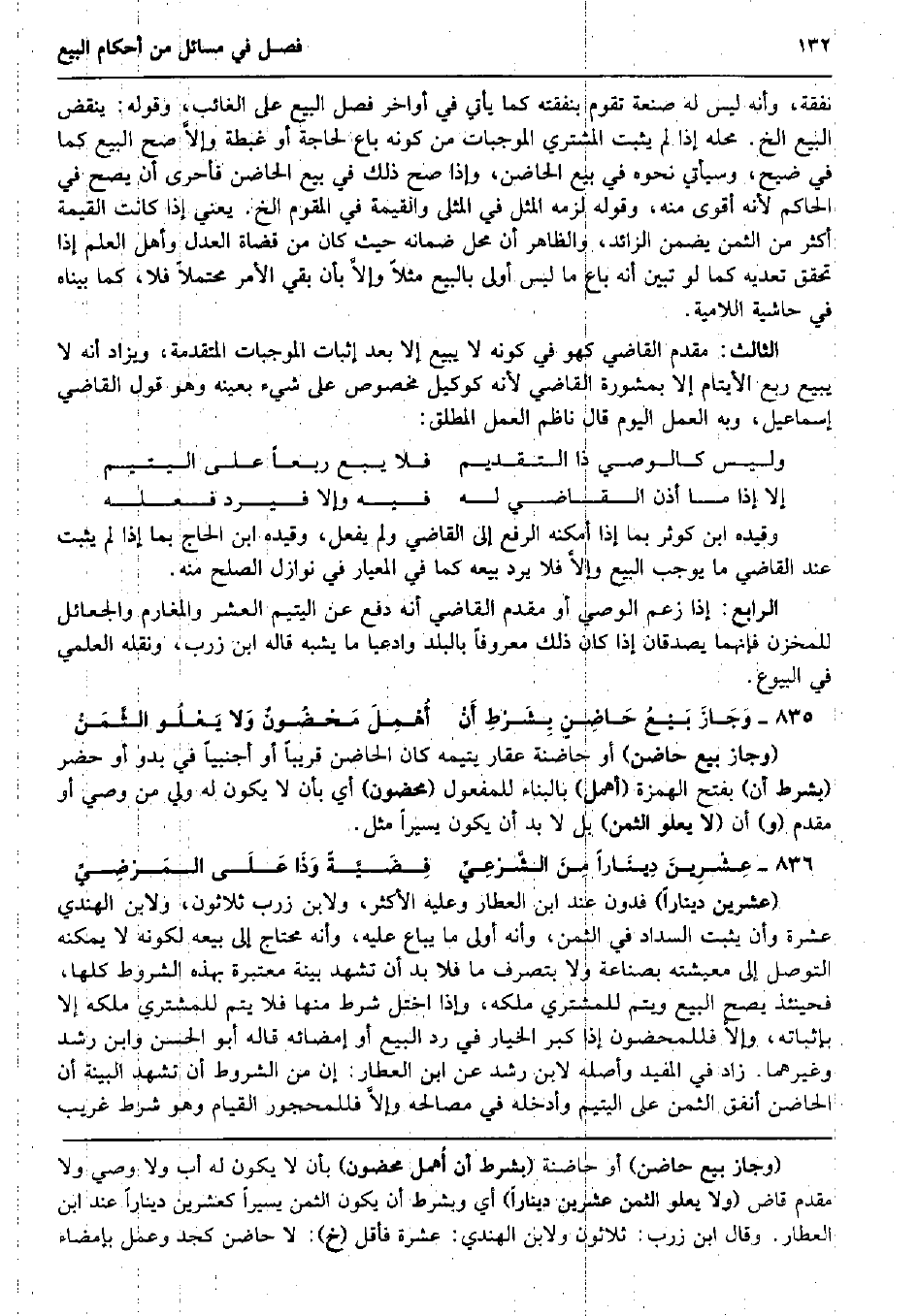 نَفَقَة، وَأَنه لَيْسَ لَهُ صَنْعَة تقوم بِنَفَقَتِهِ كَمَا يَأْتِي فِي أَوَاخِر فصل البيع على الْغَائِب، وَقَوله: ينْقض البيع الخ. مَحَله إِذا لم يثبت المُشْتَرِي الموجبات من كَونه بَاعَ لحَاجَة أَو غِبْطَة وإلاَّ صَحَّ البيع كَمَا فِي ضيح، وَسَيَأْتِي نَحوه فِي بيع الحاضن، وَإِذا صَحَّ ذَلِك فِي بيع الحاضن فأحرى أَن يَصح فِي الْحَاكِم لِأَنَّهُ أقوى مِنْهُ، وَقَوله لزمَه الْمثل فِي المثلى وَالْقيمَة فِي الْمُقَوّم الخ. يَعْنِي إِذا كَانَت الْقيمَة أَكثر من الثّمن يضمن الزَّائِد، وَالظَّاهِر أَن مَحل ضَمَانه حَيْثُ كَانَ من قُضَاة الْعدْل وَأهل الْعلم إِذا تحقق تعديه كَمَا لَو تبين أَنه بَاعَ مَا لَيْسَ أولى بِالْبيعِ مثلا وإلاَّ بِأَن بَقِي الْأَمر مُحْتملا فَلَا، كَمَا بَيناهُ فِي حَاشِيَة اللامية. الثَّالِث: مقدم القَاضِي كَهُوَ فِي كَونه لَا يَبِيع إِلَّا بعد إِثْبَات الموجبات الْمُتَقَدّمَة، وَيُزَاد أَنه لَا يَبِيع ربع الْأَيْتَام إِلَّا بمشورة القَاضِي لِأَنَّهُ كوكيل مَخْصُوص على شَيْء بِعَيْنِه وَهُوَ قَول القَاضِي إِسْمَاعِيل، وَبِه الْعَمَل الْيَوْم قَالَ ناظم الْعَمَل الْمُطلق: وَلَيْسَ كالوصي ذَا التَّقْدِيم فَلَا يبع ربعا على الْيَتِيم إِلَّا إِذا مَا أذن القَاضِي لَهُ فِيهِ وَإِلَّا فَيرد فعله وَقَيده ابْن كوثر بِمَا إِذا أمكنه الرّفْع إِلَى القَاضِي وَلم يفعل، وَقَيده ابْن الْحَاج بِمَا إِذا لم يثبت عِنْد القَاضِي مَا يُوجب البيع وإلاَّ فَلَا يرد بَيْعه كَمَا فِي المعيار فِي نَوَازِل الصُّلْح مِنْهُ. الرَّابِع: إِذا زعم الْوَصِيّ أَو مقدم القَاضِي أَنه دفع عَن الْيَتِيم الْعشْر والمغارم والجعائل للمخزن فَإِنَّهُمَا يصدقان إِذا كَانَ ذَلِك مَعْرُوفا بِالْبَلَدِ وادعيا مَا يشبه قَالَه ابْن زرب، وَنَقله العلمي فِي الْبيُوع. وَجَازَ بَيْعُ حَاضِنٍ بِشَرْطِ أَنْ أُهْمِلَ مَحْضُونٌ وَلا يَعْلُو الثَّمَنْ (وَجَاز بيع حاضن) أَو حاضنة عقار يتيمه كَانَ الحاضن قَرِيبا أَو أَجْنَبِيّا فِي بَدو أَو حضر (بِشَرْط أَن) بِفَتْح الْهمزَة (أهمل) بِالْبِنَاءِ للْمَفْعُول (محضون) أَي بِأَن لَا يكون لَهُ ولي من وَصِيّ أَو مقدم (و) أَن (لَا يَعْلُو الثّمن) بل لَا بُد أَن يكون يَسِيرا مثل. عِشْرِينَ دِينَاراً مِنَ الشَّرْعِيِّ فِضَيَّةً وَذَا عَلَى المَرْضِيِّ (عشْرين دِينَارا) فدون عِنْد ابْن الْعَطَّار وَعَلِيهِ الْأَكْثَر، وَلابْن زرب ثَلَاثُونَ، وَلابْن الْهِنْدِيّ عشرَة وَأَن يثبت السداد فِي الثّمن، وَأَنه أولى مَا يُبَاع عَلَيْهِ، وَأَنه مُحْتَاج إِلَى بَيْعه لكَونه لَا يُمكنهُ التَّوَصُّل إِلَى معيشته بصناعة وَلَا بِتَصَرُّف مَا فَلَا بُد أَن تشهد بَيِّنَة مُعْتَبرَة بِهَذِهِ الشُّرُوط كلهَا، فَحِينَئِذٍ يَصح البيع وَيتم للْمُشْتَرِي ملكه، وَإِذا اخْتَلَّ شَرط مِنْهَا فَلَا يتم للْمُشْتَرِي ملكه إِلَّا بإثباته، وإلاَّ فللمحضون إِذا كبر الْخِيَار فِي رد البيع أَو إمضائه قَالَه أَبُو الْحسن وَابْن رشد وَغَيرهمَا. زَاد فِي الْمُفِيد وَأَصله لِابْنِ رشد عَن ابْن الْعَطَّار: إِن من الشُّرُوط أَن تشهد الْبَيِّنَة أَن الحاضن أنْفق الثّمن على الْيَتِيم وَأدْخلهُ فِي مَصَالِحه وإلاَّ فللمحجور الْقيام وَهُوَ شَرط غَرِيب