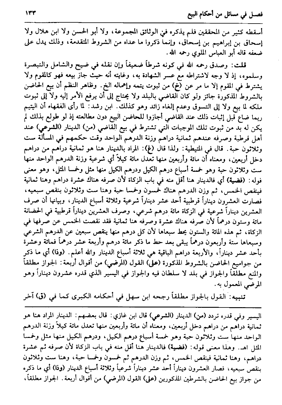 أسْقطه كثير من الْمُحَقِّقين فَلم يذكرهُ فِي الوثائق الْمَجْمُوعَة، وَلَا أَبُو الْحسن وَلَا ابْن هِلَال وَلَا إِسْحَاق بن إِبْرَاهِيم بن إِسْحَاق، وَإِنَّمَا ذكرُوا مَا عداهُ من الشُّرُوط الْمُتَقَدّمَة، وَذَلِكَ يدل على ضعفه قَالَه أَبُو الْعَبَّاس الملوي رَحمَه الله. قلت: وَصدق رَحمَه الله فِي كَونه شرطا ضَعِيفا وَإِن نَقله فِي ضيح والشامل والتبصرة وسلموه، إِذْ لَا وَجه لاشتراطه مَعَ عسر الشَّهَادَة بِهِ، وغايته أَنه حَيْثُ جَازَ بَيْعه فَهُوَ كالمقوم وَلَا يشْتَرط فِي الْمُقَوّم إِلَّا مَا مر عَن (خَ) من ثُبُوت يتمه وإهماله الخ. وَظَاهر النّظم أَن بيع الحاضن بِالشُّرُوطِ الْمَذْكُورَة جَائِز وَلَو كَانَ القَاضِي بِالْبَلَدِ وَلَا يحْتَاج إِلَى أَن يرفع الْأَمر إِلَيْهِ وَلَا إِلَى ثُبُوت ملكه لما بيع وَلَا إِلَى التسوق وَعدم إِلْغَاء زَائِد وَهُوَ كَذَلِك. ابْن رشد: لما رأى الْفُقَهَاء أَن الْيَتِيم رُبمَا ضَاعَ قبل إِثْبَات ذَلِك عِنْد القَاضِي أَجَازُوا للحاضن البيع دون مطالعته إِذْ لَو طولع بذلك لم يكن لَهُ بُد من ثُبُوت تِلْكَ الموجبات الَّتِي تشْتَرط فِي بيع القَاضِي (من) الدِّينَار (الشَّرْعِيّ) عِنْد أهل قرطبة وَصَرفه عِنْدهم ثَمَانِيَة دَرَاهِم وزنة الدِّرْهَم الْوَاحِد وَقت حكمهم فِي الْمَسْأَلَة سِتّ وَثَلَاثُونَ حَبَّة. قَالَ فِي الْمُتَيْطِيَّة: وَلذَا قَالَ (غ) : المُرَاد بالدينار هُنَا هُوَ ثَمَانِيَة دَرَاهِم من دَرَاهِم دخل أَرْبَعِينَ، وَمَعْنَاهُ أَن مائَة وَأَرْبَعين مِنْهَا تعدل مائَة كَيْلا أَي شَرْعِيَّة وزنة الدِّرْهَم الْوَاحِد مِنْهَا سِتّ وَثَلَاثُونَ حَبَّة وَهُوَ خَمْسَة أَسْبَاع دِرْهَم الْكَيْل وَدِرْهَم الْكَيْل مِنْهَا مثل وخمسا الْمثل، وَهُوَ معنى قَوْله: (فضية) أَي فالدينار هُنَا أقل مِنْهُ فِي بَاب الزَّكَاة لِأَن صرفه هُنَاكَ عشرَة دَرَاهِم وَهنا ثَمَانِيَة فينقص الْخمس، ثمَّ وزن الدِّرْهَم هُنَاكَ خَمْسُونَ وخمسا حَبَّة وَهنا سِتّ وَثَلَاثُونَ بِنَقص سبعيه، فَصَارَت الْعشْرُونَ دِينَارا قرطبية أحد عشر دِينَارا شَرْعِيَّة وَثَلَاثَة أَسْبَاع الدِّينَار، وبيانها أَن صرف الْعشْرين دِينَارا شَرْعِيَّة فِي الزَّكَاة مائَة دِرْهَم شَرْعِي، وَصرف الْعشْرين دِينَارا قرطبية فِي الْحَضَانَة مائَة وَسِتُّونَ درهما لِأَن صرفه هُنَاكَ عشرَة وَصَرفه هُنَا ثَمَانِيَة فقد نقصت الْخمس عَن صرفهَا فِي الزَّكَاة، ثمَّ هَذِه الْمِائَة وَالسِّتُّونَ يحط سبعاها لِأَن كل دِرْهَم مِنْهَا ينقص سبعين عَن الدِّرْهَم الشَّرْعِيّ وسبعاها سِتَّة وَأَرْبَعُونَ درهما يبْقى بعد حط مَا ذكر مائَة دِرْهَم وَأَرْبَعَة عشر درهما فمائة وَعشرَة بِأحد عشر دِينَارا، وَالْأَرْبَعَة دَرَاهِم الْبَاقِيَة هِيَ ثَلَاثَة أَسْبَاع الدِّينَار وَالله أعلم. (وَذَا) أَي مَا ذكر من جواميع الحاضن بِالشُّرُوطِ الْمَذْكُورَة (على) القَوْل (المرضي) من أَقْوَال أَرْبَعَة: الْجَوَاز مُطلقًا وَالْمَنْع مُطلقًا وَالْجَوَاز فِي بلد لَا سُلْطَان فِيهِ وَالْجَوَاز فِي الْيَسِير الَّذِي قدره عشرُون دِينَارا وَهُوَ المرضي الْمَعْمُول بِهِ. تَنْبِيه: القَوْل بِالْجَوَازِ مُطلقًا رَجحه ابْن سهل فِي أَحْكَامه الْكُبْرَى كَمَا فِي (ق) آخر