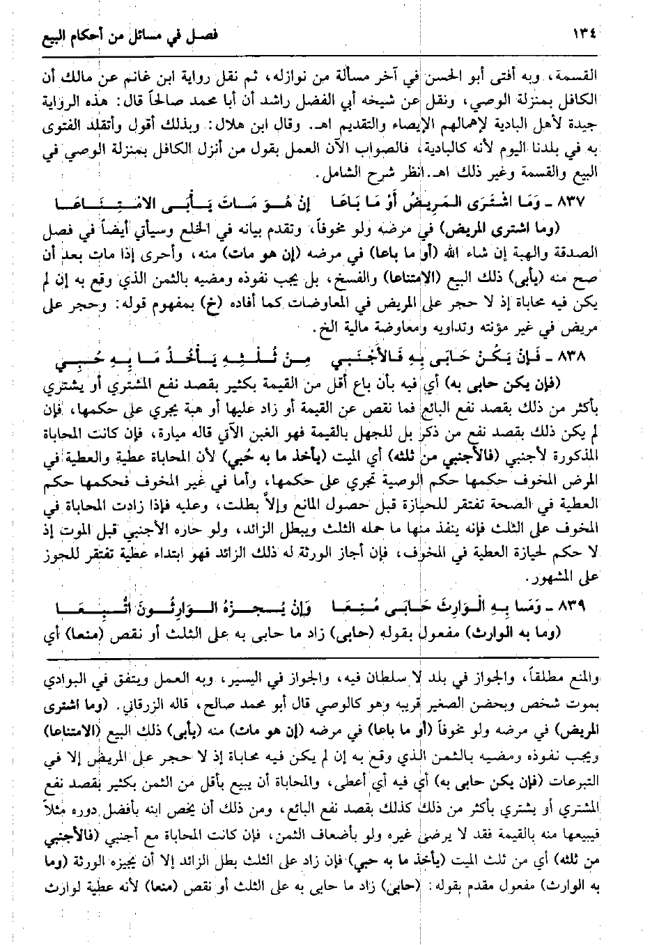 الْقِسْمَة، وَبِه أفتى أَبُو الْحسن فِي آخر مَسْأَلَة من نوازله، ثمَّ نقل رِوَايَة ابْن غَانِم عَن مَالك أَن الكافل بِمَنْزِلَة الْوَصِيّ، وَنقل عَن شَيْخه أبي الْفضل رَاشد أَن أَبَا مُحَمَّد صَالحا قَالَ: هَذِه الرِّوَايَة جَيِّدَة لأهل الْبَادِيَة لإهمالهم الْإِيصَاء والتقديم اه. وَقَالَ ابْن هِلَال: وَبِذَلِك أَقُول وأتقلد الْفَتْوَى بِهِ فِي بلدنا الْيَوْم لِأَنَّهُ كالبادية، فَالصَّوَاب الْآن الْعَمَل بقول من أنزل الكافل بِمَنْزِلَة الْوَصِيّ فِي البيع وَالْقِسْمَة وَغير ذَلِك اه. انْظُر شرح الشَّامِل. وَمَا اشْتَرَى المَرِيضُ أَوْ مَا بَاعَا إنْ هُوَ مَاتَ يَأْبَى الامْتِنَاعَا (وَمَا اشْترى الْمَرِيض) فِي مَرضه وَلَو مخوفا، وَتقدم بَيَانه فِي الْخلْع وَسَيَأْتِي أَيْضا فِي فصل الصَّدَقَة وَالْهِبَة إِن شَاءَ الله (أَو مَا باعا) فِي مَرضه (إِن هُوَ مَاتَ) مِنْهُ، وَأَحْرَى إِذا مَاتَ بعد أَن صَحَّ مِنْهُ (يَأْبَى) ذَلِك البيع (الامتناعا) وَالْفَسْخ، بل يجب نُفُوذه ومضيه بِالثّمن الَّذِي وَقع بِهِ إِن لم يكن فِيهِ مُحَابَاة إِذْ لَا حجر على الْمَرِيض فِي الْمُعَاوَضَات كَمَا أَفَادَهُ (خَ) بِمَفْهُوم قَوْله: وَحجر على مَرِيض فِي غير مُؤْنَته وتداويه ومعاوضة مَالِيَّة الخ. فَإنْ يَكُنْ حَابَى بِهِ فَالأَجْنَبي مِنْ ثُلْثِهِ يَأْخُذُ مَا بِهِ حُبِي (فَإِن يكن حابى بِهِ) أَي فِيهِ بِأَن بَاعَ أقل من الْقيمَة بِكَثِير بِقصد نفع المُشْتَرِي أَو يَشْتَرِي بِأَكْثَرَ من ذَلِك بِقصد نفع البَائِع فَمَا نقص عَن الْقيمَة أَو زَاد عَلَيْهَا أَو هبة يجْرِي على حكمهَا فَإِن لم يكن ذَلِك بِقصد نفع من ذكر بل للْجَهْل بِالْقيمَةِ فَهُوَ الْغبن الْآتِي قَالَه ميارة، فَإِن كَانَت الْمُحَابَاة الْمَذْكُورَة لأَجْنَبِيّ (فالأجنبي من ثلثه) أَي الْمَيِّت (يَأْخُذ مَا بِهِ حُبي) لِأَن الْمُحَابَاة عَطِيَّة والعطية فِي الْمَرَض الْمخوف حكمهَا حكم الْوَصِيَّة تجْرِي على حكمهَا، وَأما فِي غير الْمخوف فَحكمهَا حكم الْعَطِيَّة فِي الصِّحَّة تفْتَقر للحيازة قبل حُصُول الْمَانِع وإلاَّ بطلت، وَعَلِيهِ فَإِذا زَادَت الْمُحَابَاة فِي الْمخوف على الثُّلُث فَإِنَّهُ ينفذ مِنْهَا مَا حمله الثُّلُث وَيبْطل الزَّائِد، وَلَو حازه الْأَجْنَبِيّ قبل الْمَوْت إِذْ لَا حكم لحيازة الْعَطِيَّة فِي الْمخوف، فَإِن أجَاز الْوَرَثَة لَهُ ذَلِك الزَّائِد فَهُوَ ابْتِدَاء عَطِيَّة تفْتَقر للحوز على الْمَشْهُور. 4 وَمَا بِهِ الْوَارِثَ حَابَى مُنِعَا وَإنْ يُجزْهُ الوَارِثُونَ اتُّبِعَا (وَمَا بِهِ الْوَارِث) مفعول بقوله (حابى) زَاد مَا حابى بِهِ على الثُّلُث أَو نقص (منعا) أَي
