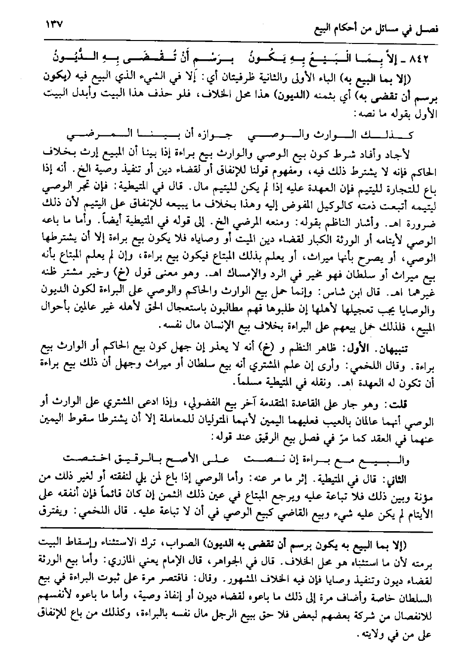 إلاَّ بِمَا الْبَيْعُ بِهِ يَكُونُ برَسْمِ أَنْ تُقْضَى بِهِ الدُّيُونُ (إِلَّا بِمَا البيع بِهِ) الْبَاء الأولى وَالثَّانيَِة ظرفيتان أَي: إِلَّا فِي الشَّيْء الَّذِي البيع فِيهِ (يكون برسم أَن تقضى بِهِ) أَي بِثمنِهِ (الدُّيُون) هَذَا مَحل الْخلاف، فَلَو حذف هَذَا الْبَيْت وأبدل الْبَيْت الأول بقوله مَا نَصه: كَذَلِك الْوَارِث وَالْوَصِيّ جَوَازه أَن بَينا المرضي لأجاد وَأفَاد شَرط كَون بيع الْوَصِيّ وَالْوَارِث بيع بَرَاءَة إِذا بَينا أَن الْمَبِيع إِرْث بِخِلَاف الْحَاكِم فَإِنَّهُ لَا يشْتَرط ذَلِك فِيهِ، وَمَفْهُوم قَوْلنَا للإنفاق أَو لقَضَاء دين أَو تَنْفِيذ وَصِيَّة الخ. أَنه إِذا بَاعَ للتِّجَارَة للْيَتِيم فَإِن الْعهْدَة عَلَيْهِ إِذا لم يكن للْيَتِيم مَال. قَالَ فِي الْمُتَيْطِيَّة: فَإِن تجر الْوَصِيّ ليتيمه أتبعت ذمَّته كَالْوَكِيلِ الْمُفَوض إِلَيْهِ وَهَذَا بِخِلَاف مَا يَبِيعهُ للإنفاق على الْيَتِيم لِأَن ذَلِك ضَرُورَة اه. وَأَشَارَ النَّاظِم بقوله: وَمنعه المرضي الخ. إِلَى قَوْله فِي الْمُتَيْطِيَّة أَيْضا. وَأما مَا بَاعه الْوَصِيّ لأيتامه أَو الْوَرَثَة الْكِبَار لقَضَاء دين الْمَيِّت أَو وَصَايَاهُ فَلَا يكون بيع بَرَاءَة إِلَّا أَن يشترطها الْوَصِيّ، أَو يُصَرح بِأَنَّهَا مِيرَاث، أَو يعلم بذلك الْمُبْتَاع فَيكون بيع بَرَاءَة، وَإِن لم يعلم الْمُبْتَاع بِأَنَّهُ بيع مِيرَاث أَو سُلْطَان فَهُوَ مُخَيّر فِي الرَّد والإمساك اه. وَهُوَ معنى قَول (خَ) وَخير مُشْتَر ظَنّه غَيرهمَا اه. قَالَ ابْن شَاس: وَإِنَّمَا حمل بيع الْوَارِث وَالْحَاكِم وَالْوَصِيّ على الْبَرَاءَة لكَون الدُّيُون والوصايا يجب تَعْجِيلهَا لأَهْلهَا إِن طلبوها فهم مطالبون باستعجال الْحق لأَهله غير عَالمين بأحوال الْمَبِيع، فَلذَلِك حمل بيعهم على الْبَرَاءَة بِخِلَاف بيع الْإِنْسَان مَال نَفسه. تَنْبِيهَانِ. الأول: ظَاهر النّظم و (خَ) أَنه لَا يعْذر إِن جهل كَون بيع الْحَاكِم أَو الْوَارِث بيع بَرَاءَة. وَقَالَ اللَّخْمِيّ: وَأرى إِن علم المُشْتَرِي أَنه بيع سُلْطَان أَو مِيرَاث وَجَهل أَن ذَلِك بيع بَرَاءَة أَن تكون لَهُ الْعهْدَة اه. وَنَقله فِي الْمُتَيْطِيَّة مُسلما. قلت: وَهُوَ جَار على الْقَاعِدَة الْمُتَقَدّمَة آخر بيع الْفُضُولِيّ، وَإِذا ادّعى المُشْتَرِي على الْوَارِث أَو الْوَصِيّ أَنَّهُمَا عالمان بِالْعَيْبِ فعلَيْهِمَا الْيَمين لِأَنَّهُمَا المتوليان للمعاملة إِلَّا أَن يشترطا سُقُوط الْيَمين عَنْهُمَا فِي العقد كَمَا مرّ فِي فصل بيع الرَّقِيق عِنْد قَوْله: وَالْبيع مَعَ بَرَاءَة إِن نصت على الْأَصَح بالرقيق اخْتصّت الثَّانِي: قَالَ فِي الْمُتَيْطِيَّة. إِثْر مَا مر عَنهُ: وَأما الْوَصِيّ إِذا بَاعَ لمن يَلِي لنفقته أَو لغير ذَلِك من مُؤنَة وَبَين ذَلِك فَلَا تباعة عَلَيْهِ وَيرجع الْمُبْتَاع فِي عين ذَلِك الثّمن إِن كَانَ قَائِما فَإِن أنفقهُ على الْأَيْتَام لم يكن عَلَيْهِ شَيْء وَبيع القَاضِي كَبيع الْوَصِيّ فِي أَن لَا تباعة عَلَيْهِ. قَالَ اللَّخْمِيّ: ويفترق
