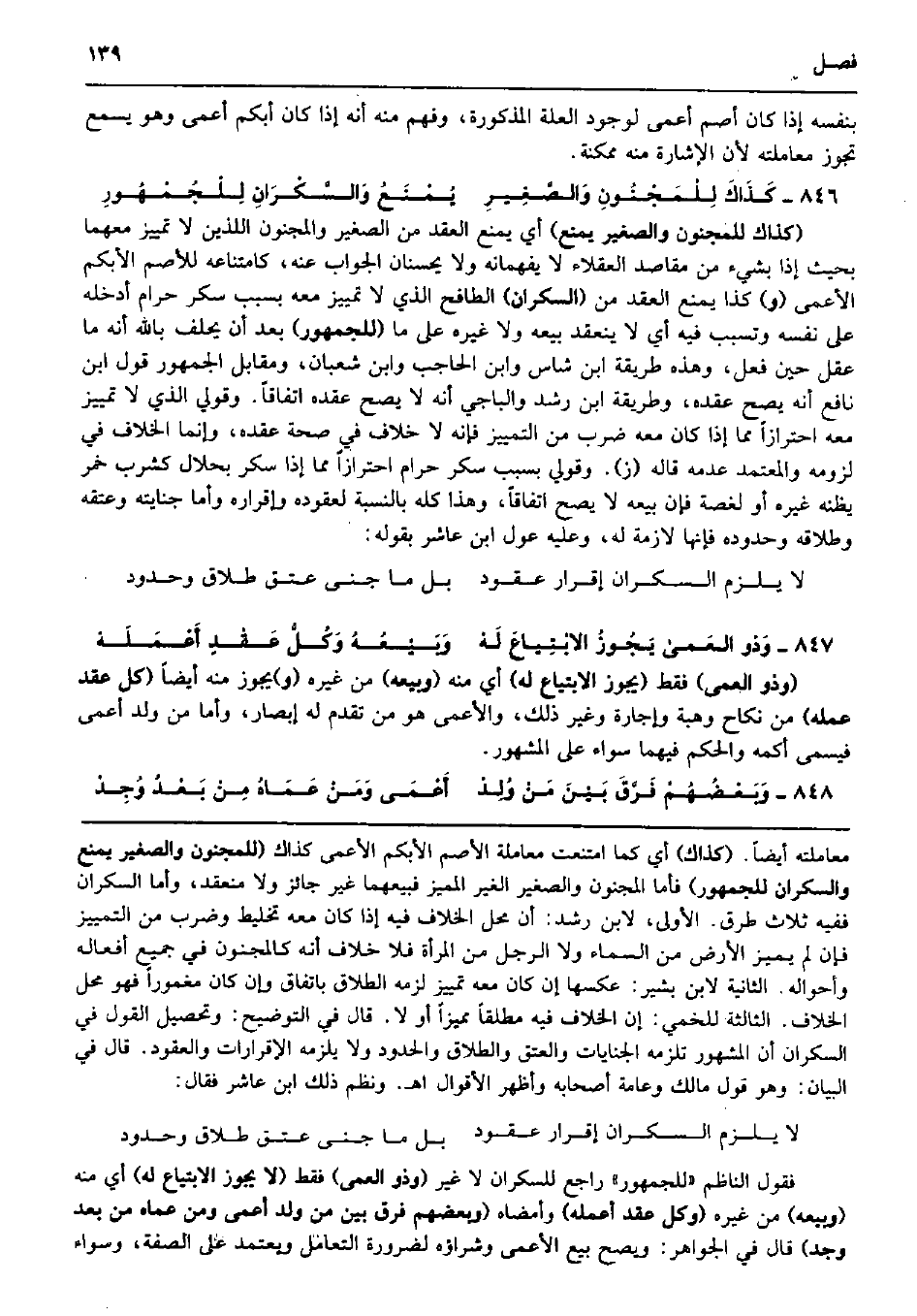 1648 - ; يَجُوزُ الابْتِياعَ لَهْ وَبَيْعُهُ وَكُلُّ عَقْدٍ أَعْمَلَهْ (وَذُو الْعَمى) فَقَط (يجوز الابتياع لَهُ) أَي مِنْهُ (وَبيعه) من غَيره (و) يجوز مِنْهُ أَيْضا (كل عقد عمله) من نِكَاح وَهبة وَإِجَارَة وَغير ذَلِك، وَالْأَعْمَى هُوَ من تقدم لَهُ إبصار، وَأما من ولد أعمى فيسمى أكمه وَالْحكم فيهمَا سَوَاء على الْمَشْهُور. وَبَعْضُهُمْ فَرَّقَ بَيْنَ مَنْ وُلِدْ أَعْمَى وَمَنْ عَمَاهُ مِنْ بَعْدُ وُجِدْ