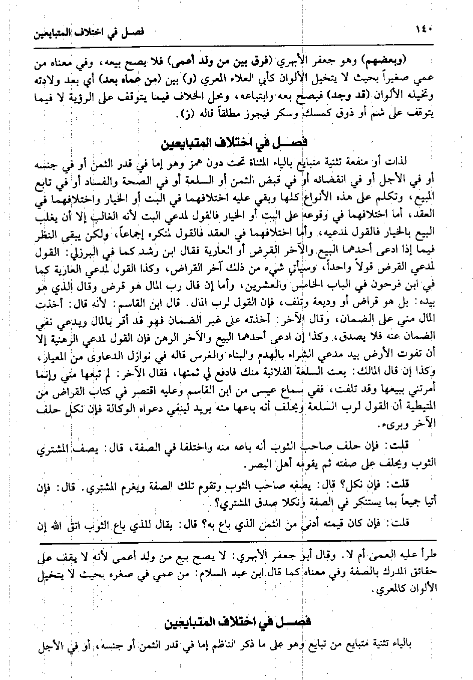لذات أَو مَنْفَعَة تَثْنِيَة متبايع بِالْيَاءِ الْمُثَنَّاة تَحت دون همز وَهُوَ إِمَّا فِي قدر الثّمن أَو فِي جنسه أَو فِي الْأَجَل أَو فِي انقضائه أَو فِي قبض الثّمن أَو السّلْعَة أَو فِي الصِّحَّة وَالْفساد أَو فِي تَابع الْمَبِيع، وَتكلم على هَذِه الْأَنْوَاع كلهَا وَبَقِي عَلَيْهِ اخْتِلَافهمَا فِي الْبَتّ أَو الْخِيَار واختلافهما فِي العقد، أما اخْتِلَافهمَا فِي وُقُوعه على الْبَتّ أَو الْخِيَار فَالْقَوْل لمُدعِي الْبَتّ لِأَنَّهُ الْغَالِب إِلَّا أَن يغلب البيع بِالْخِيَارِ فَالْقَوْل لمدعيه، وَأما اخْتِلَافهمَا فِي العقد فَالْقَوْل لمنكره إِجْمَاعًا، وَلَكِن يبْقى النّظر فِيمَا إِذا ادّعى أَحدهمَا البيع وَالْآخر الْقَرْض أَو الْعَارِية فَقَالَ ابْن رشد كَمَا فِي الْبُرْزُليّ: القَوْل لمُدعِي الْقَرْض قولا وَاحِدًا، وَسَيَأْتِي شَيْء من ذَلِك آخر الْقَرَاض، وَكَذَا القَوْل لمُدعِي الْعَارِية كَمَا فِي ابْن فَرِحُونَ فِي الْبَاب الْخَامِس وَالْعِشْرين، وَأما إِن قَالَ رب المَال هُوَ قرض وَقَالَ الَّذِي هُوَ بِيَدِهِ: بل هُوَ قِرَاض أَو وَدِيعَة وَتلف، فَإِن القَوْل لرب المَال. قَالَ ابْن الْقَاسِم: لِأَنَّهُ قَالَ: أخذت المَال مني على الضَّمَان، وَقَالَ الآخر: أَخَذته على غير الضَّمَان فَهُوَ قد أقرّ بِالْمَالِ وَيَدعِي نفي الضَّمَان عَنهُ فَلَا يصدق، وَكَذَا إِن ادّعى أَحدهمَا البيع وَالْآخر الرَّهْن فَإِن القَوْل لمُدعِي الرهنية إِلَّا أَن تفوت الأَرْض بيد مدعي الشِّرَاء بالهدم وَالْبناء وَالْغَرْس قَالَه فِي نَوَازِل الدَّعَاوَى من المعيار، وَكَذَا إِن قَالَ الْمَالِك: بِعْت السّلْعَة الْفُلَانِيَّة مِنْك فادفع لي ثمنهَا، فَقَالَ الآخر: لم تبعها مني وَإِنَّمَا أَمرتنِي بِبَيْعِهَا وَقد تلفت، فَفِي سَماع عِيسَى من ابْن الْقَاسِم وَعَلِيهِ اقْتصر فِي كتاب الْقَرَاض من الْمُتَيْطِيَّة أَن القَوْل لرب السّلْعَة وَيحلف أَنه بَاعهَا مِنْهُ يُرِيد لينفي دَعْوَاهُ الْوكَالَة فَإِن نكل حلف الآخر وبرىء. قلت: فَإِن حلف صَاحب الثَّوْب أَنه بَاعه مِنْهُ وَاخْتلفَا فِي الصّفة، قَالَ: يصف المُشْتَرِي الثَّوْب وَيحلف على صفته ثمَّ يقومه أهل الْبَصَر. قلت: فَإِن نكل؟ قَالَ: يصفه صَاحب الثَّوْب وَتقوم تِلْكَ الصّفة وَيغرم المُشْتَرِي. قَالَ: فَإِن أَتَيَا جَمِيعًا بِمَا يستنكر فِي الصّفة ونكلا صدق المُشْتَرِي؟ قلت: فَإِن كَانَ قِيمَته أدنى من الثّمن الَّذِي بَاعَ بِهِ؟ قَالَ: يُقَال للَّذي بَاعَ الثَّوْب اتَّقِ الله إِن