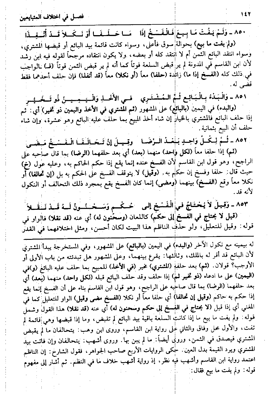 وَلَمْ يَفُتْ مَا بِيعَ فَالْفَسْخُ إذَا مَا حَلَفَا أَوْ نَكَلاَ قَدْ أُنْفِذَا (وَلم يفت مَا بيع) بحوالة سوق فأعلى، وَسَوَاء كَانَت قَائِمَة بيد البَائِع أَو قبضهَا المُشْتَرِي، وَسَوَاء انتقد البَائِع الثّمن أم لَا انتقد كُله أَو بعضه، وَلَا يكون انتقاده مرجحاً لقَوْله فِيهِ ابْن رشد لِأَن ابْن الْقَاسِم فِي الْمُدَوَّنَة لم ير قبض السّلْعَة فوتاً كَمَا أَنه لم ير قبض الثّمن قوتاً (ف) الْوَاجِب فِي ذَلِك كُله (الْفَسْخ إِذا مَا) زَائِدَة (حلفا) مَعًا (أَو نكلا) مَعًا (قد أنفذا) فَإِن حلف أَحدهمَا فَقَط قضى لَهُ. وَالْبَدْءُ بِالْبَائِع ثُمَّ المُشْتَرِي فِي الأَخْذِ وَالْيَمِينُ ذُو تَخَيُّرِ (والبدء) فِي الْيَمين (بالبائع) على الْمَشْهُور (ثمَّ المُشْتَرِي فِي الْأَخْذ وَالْيَمِين ذُو تخير) أَي: ثمَّ إِذا حلف البَائِع فَالْمُشْتَرِي بِالْخِيَارِ إِن شَاءَ أَخذ الْمَبِيع بِمَا حلف عَلَيْهِ البَائِع وَهُوَ عشرَة، وَإِن شَاءَ حلف أَن البيع بِثمَانِيَة. ثُمَّ لِكُلِّ وَاحِدٍ بَعْدُ الرِّضَا وقِيلَ إنْ تَحَالَفَا الْفَسْخُ مَضَى (ثمَّ) إِذا حلفا مَعًا (لكل وَاحِد) مِنْهُمَا (بعد) أَي بعد حلفهما (الرِّضَا) بِمَا قَالَ صَاحبه على الرَّاجِح، وَهُوَ قَول ابْن الْقَاسِم لِأَن الْفَسْخ عِنْده إِنَّمَا يَقع إِذا حكم الْحَاكِم بِهِ، وَعَلِيهِ عول (خَ) حَيْثُ قَالَ: حلفا وَفسخ إِن حكم بِهِ. (وَقيل) لَا يتَوَقَّف الْفَسْخ على الحكم بِهِ بل (إِن تحَالفا) أَو نكلا مَعًا وَقع (الْفَسْخ) بَينهمَا (وَمضى) إِنَّمَا كَانَ الْفَسْخ يَقع بِمُجَرَّد ذَلِك التَّحَالُف أَو النّكُول لِأَنَّهُ قد. وَقِيلَ لاَ يُحْتَاجُ فِي الْفَسْخِ إِلَى حُكْمٍ وَسَحْنُونٌ لَهُ قَدْ نَقَلاَ (قيل لَا يحْتَاج فِي الْفَسْخ إِلَى حكم) كاللعان (وَسَحْنُون لَهُ) أَي عَنهُ (قد نقلا) فالواو فِي قَوْله: وَقيل للتَّعْلِيل، وَلَو حذف النَّاظِم هَذَا الْبَيْت لَكَانَ أحسن، وَمثل اخْتِلَافهمَا فِي الْقدر
