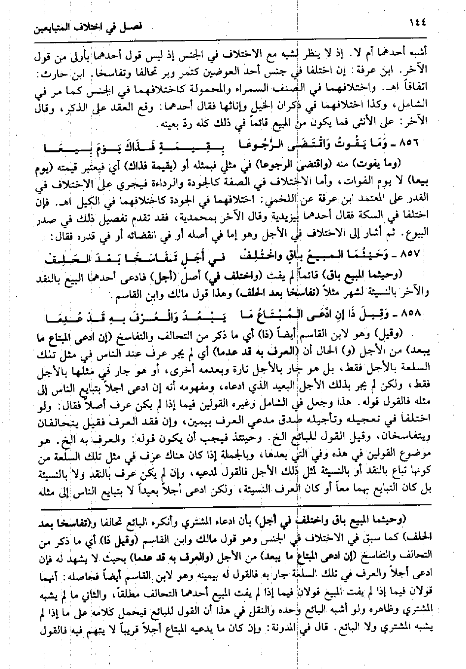 أشبه أَحدهمَا أم لَا. إِذْ لَا ينظر لشبه مَعَ الِاخْتِلَاف فِي الْجِنْس إِذْ لَيْسَ قَول أَحدهمَا بِأولى من قَول الآخر. ابْن عَرَفَة: إِن اخْتلفَا فِي جنس أحد الْعِوَضَيْنِ كتمر وبر تحَالفا وتفاسخا. ابْن حَارِث: اتِّفَاقًا اه. واختلافهما فِي الصِّنْف السمراء والمحمولة كاختلافهما فِي الْجِنْس كَمَا مر فِي الشَّامِل، وَكَذَا اخْتِلَافهمَا فِي ذكران الْخَيل وإناثها فَقَالَ أَحدهمَا: وَقع العقد على الذّكر، وَقَالَ الآخر: على الْأُنْثَى فَمَا يكون من الْمَبِيع قَائِما فِي ذَلِك كُله ردّ بِعَيْنِه. وَمَا يَفُوتُ وَاقْتَضَى الرُّجُوعَا بِقِيمَةٍ فَذَاكَ يَوْمَ بِيعَا (وَمَا يفوت) مِنْهُ (وَاقْتضى الرجوعا) فِي مثلي فبمثله أَو (بِقِيمَة فَذَاك) أَي فَيعْتَبر قِيمَته (يَوْم بيعا) لَا يَوْم الْفَوات، وَأما الِاخْتِلَاف فِي الصّفة كالجودة والرداءة فَيجْرِي على الِاخْتِلَاف فِي الْقدر على الْمُعْتَمد ابْن عَرَفَة عَن اللَّخْمِيّ: اخْتِلَافهمَا فِي الْجَوْدَة كاختلافهما فِي الْكَيْل اه. فَإِن اخْتلفَا فِي السِّكَّة فَقَالَ أَحدهمَا بيزيدية وَقَالَ الآخر بمحمدية، فقد تقدم تَفْصِيل ذَلِك فِي صدر الْبيُوع. ثمَّ أَشَارَ إِلَى الِاخْتِلَاف فِي الْأَجَل وَهُوَ إِمَّا فِي أَصله أَو فِي انقضائه أَو فِي قدره فَقَالَ: وَحَيْثُمَا المبيعُ باقٍ واخْتُلِفْ فِي أَجَلٍ تَفَاسَخَا بَعْدَ الحَلِفْ (وحيثما الْمَبِيع بَاقٍ) قَائِما لم يفت (وَاخْتلف فِي) أصل (أجل) فَادّعى أَحدهمَا البيع بِالنَّقْدِ وَالْآخر بِالنَّسِيئَةِ لشهر مثلا (تفاسخا بعد الْحلف) وَهَذَا قَول مَالك وَابْن الْقَاسِم. وَقِيلَ ذَا إنِ ادَّعَى المُبْتَاعُ مَا يَبْعُدُ وَالْعُرْفَ بهِ قَدْ عُدِمَا (وَقيل) وَهُوَ لِابْنِ الْقَاسِم أَيْضا (ذَا) أَي مَا ذكر من التَّحَالُف والتفاسخ (إِن ادّعى الْمُبْتَاع مَا يبعد) من الْأَجَل (و) الْحَال أَن (الْعرف بِهِ قد عدما) أَي لم يجر عرف عِنْد النَّاس فِي مثل تِلْكَ السّلْعَة بالأجل فَقَط، بل هُوَ جَار بالأجل تَارَة وبعدمه أُخْرَى، أَو هُوَ جَار فِي مثلهَا بالأجل فَقَط، وَلَكِن لم يجر بذلك الْأَجَل الْبعيد الَّذِي ادَّعَاهُ، وَمَفْهُومه أَنه إِن ادّعى اجلاً بتبايع النَّاس إِلَى مثله فَالْقَوْل قَوْله. هَذَا وَجعل فِي الشَّامِل وَغَيره الْقَوْلَيْنِ فِيمَا إِذا لم يكن عرف أصلا فَقَالَ: وَلَو اخْتلفَا فِي تَعْجِيله وتأجيله صدق مدعي الْعرف بِيَمِين، وَإِن فقد الْعرف فَقيل يَتَحَالَفَانِ ويتفاسخان، وَقيل القَوْل للْبَائِع الخ. وَحِينَئِذٍ فَيجب أَن يكون قَوْله: وَالْعرْف بِهِ الخ. هُوَ مَوْضُوع الْقَوْلَيْنِ فِي هَذِه وَفِي الَّتِي بعْدهَا وَبِالْجُمْلَةِ إِذا كَانَ هُنَاكَ عرف فِي مثل تِلْكَ السّلْعَة من كَونهَا تبَاع بِالنَّقْدِ أَو بِالنَّسِيئَةِ لمثل ذَلِك الْأَجَل فَالْقَوْل لمدعيه، وَإِن لم يكن عرف بِالنَّقْدِ وَلَا بِالنَّسِيئَةِ بل كَانَ التبايع بهما مَعًا أَو كَانَ الْعرف النَّسِيئَة، وَلَكِن ادّعى أَََجَلًا بَعيدا لَا بتبايع النَّاس إِلَى مثله