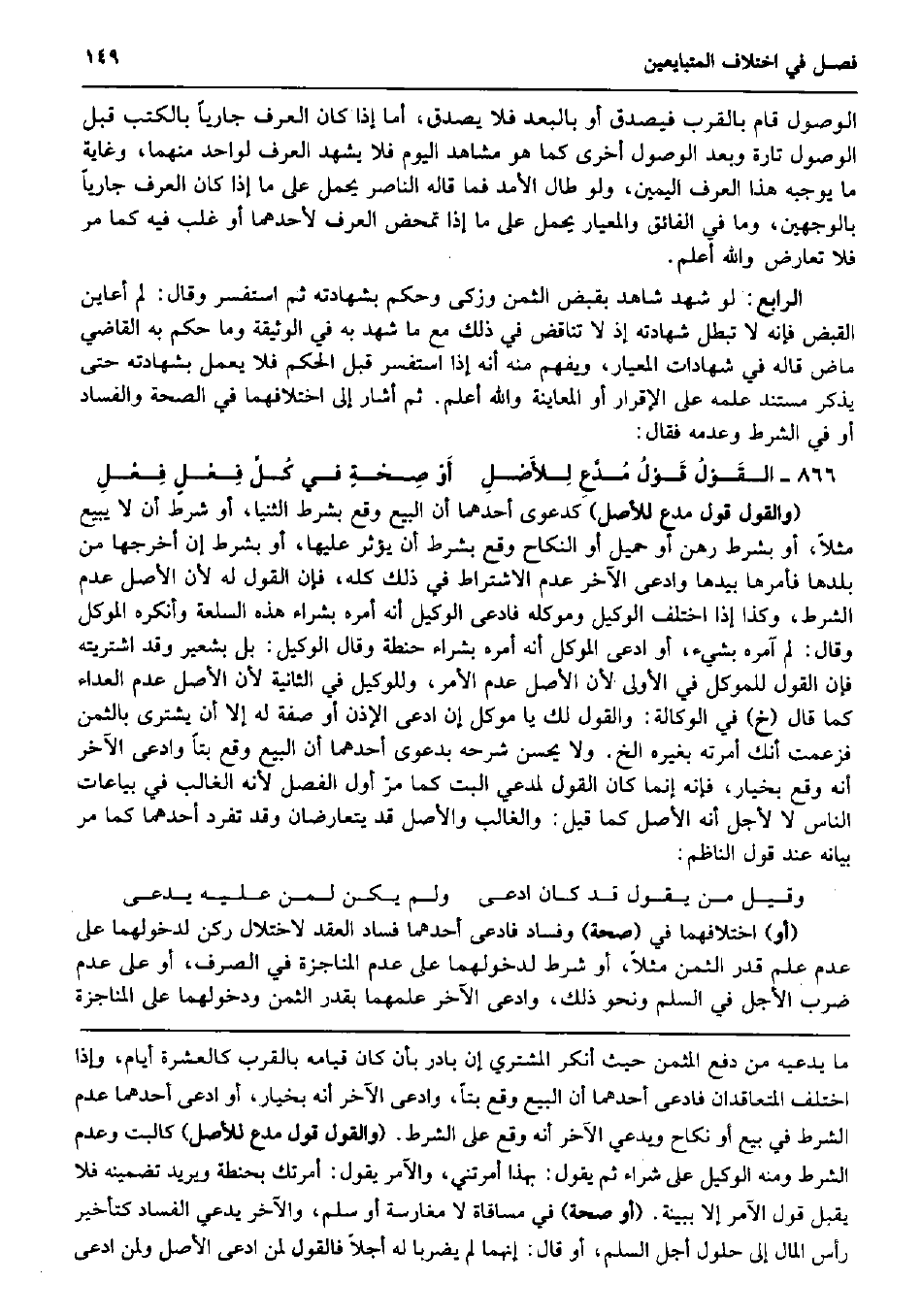 الْوُصُول قَامَ بِالْقربِ فَيصدق أَو بالبعد فَلَا يصدق، أما إِذا كَانَ الْعرف جَارِيا بالكتب قبل الْوُصُول تَارَة وَبعد الْوُصُول أُخْرَى كَمَا هُوَ مشَاهد الْيَوْم فَلَا يشْهد الْعرف لوَاحِد مِنْهُمَا وَغَايَة مَا يُوجِبهُ هَذَا الْعرف الْيَمين، وَلَو طَال الأمد فَمَا قَالَه النَّاصِر يحمل على مَا إِذا كَانَ الْعرف جَارِيا بِالْوَجْهَيْنِ، وَمَا فِي الْفَائِق والمعيار يحمل على مَا إِذا تمحض الْعرف لأَحَدهمَا أَو غلب فِيهِ كَمَا مر فَلَا تعَارض وَالله أعلم. الرَّابِع: لَو شهد شَاهد بِقَبض الثّمن وزكى وَحكم بِشَهَادَتِهِ ثمَّ استفسر وَقَالَ: لم أعاين الْقَبْض فَإِنَّهُ لَا تبطل شَهَادَته إِذْ لَا تنَاقض فِي ذَلِك مَعَ مَا شهد بِهِ فِي الْوَثِيقَة وَمَا حكم بِهِ القَاضِي مَاض قَالَه فِي شَهَادَات المعيار، وَيفهم مِنْهُ أَنه إِذا استفسر قبل الحكم فَلَا يعْمل بِشَهَادَتِهِ حَتَّى يذكر مُسْتَند علمه على الْإِقْرَار أَو المعاينة وَالله أعلم. ثمَّ أَشَارَ إِلَى اخْتِلَافهمَا فِي الصِّحَّة وَالْفساد أَو فِي الشَّرْط وَعَدَمه فَقَالَ: القَوْلُ قَوْلُ مُدَّعِ لِلأَصْلِ أَوْ صِحْةٍ فِي كُلِّ فِعْلٍ فِعْلِ (وَالْقَوْل قَول مُدع للْأَصْل) كدعوى أَحدهمَا أَن البيع وَقع بِشَرْط الثنيا، أَو شَرط أَن لَا يَبِيع مثلا، أَو بِشَرْط رهن أَو حميل أَو النِّكَاح وَقع بِشَرْط أَن يُؤثر عَلَيْهَا، أَو بِشَرْط إِن أخرجهَا من بَلَدهَا فَأمرهَا بِيَدِهَا وَادّعى الآخر عدم الِاشْتِرَاط فِي ذَلِك كُله، فَإِن القَوْل لَهُ لِأَن الأَصْل عدم الشَّرْط، وَكَذَا إِذا اخْتلف الْوَكِيل وموكله فَادّعى الْوَكِيل أَنه أمره بشرَاء هَذِه السّلْعَة وَأنْكرهُ الْمُوكل وَقَالَ: لم آمره بِشَيْء، أَو ادّعى الْمُوكل أَنه أمره بشرَاء حِنْطَة وَقَالَ الْوَكِيل: بل بشعير وَقد اشْتَرَيْته فَإِن القَوْل للْمُوكل فِي الأولى لِأَن الأَصْل عدم الْأَمر، وللوكيل فِي الثَّانِيَة لِأَن الأَصْل عدم العداء كَمَا قَالَ (خَ) فِي الْوكَالَة: وَالْقَوْل لَك يَا مُوكل إِن ادّعى الْإِذْن أَو صفة لَهُ إِلَّا أَن يشترى بِالثّمن فَزَعَمت أَنَّك أَمرته بِغَيْرِهِ الخ. وَلَا يحسن شَرحه بِدَعْوَى أَحدهمَا أَن البيع وَقع بتاً وَادّعى الآخر أَنه وَقع بِخِيَار، فَإِنَّهُ إِنَّمَا كَانَ القَوْل لمُدعِي الْبَتّ كَمَا مرّ أول الْفَصْل لِأَنَّهُ الْغَالِب فِي بياعات النَّاس لَا لأجل أَنه الأَصْل كَمَا قيل: وَالْغَالِب وَالْأَصْل قد يتعارضان وَقد تفرد أَحدهمَا كَمَا مر بَيَانه عِنْد قَول النَّاظِم: وَقيل من يَقُول قد كَانَ ادّعى وَلم يكن لمن عَلَيْهِ يدعى (أَو) اخْتِلَافهمَا فِي (صِحَة) وَفَسَاد فَادّعى أَحدهمَا فَسَاد العقد لاختلال ركن لدخولهما على عدم علم قدر الثّمن مثلا، أَو شَرط لدخولهما على عدم المناجزة فِي الصّرْف، أَو على عدم ضرب الْأَجَل فِي السّلم وَنَحْو ذَلِك، وَادّعى الآخر علمهما بِقدر الثّمن ودخولهما على المناجزة
