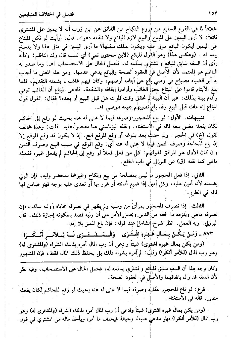 خلافًا لما فِي الْفَرْع السَّابِع من فروع النِّكَاح من الْفَائِق عَن ابْن زرب أَنه لَا يَمِين على المُشْتَرِي قَائِلا: لَا أرى الْيَمين على الْمُبْتَاع وَالْبيع لَازم للْبَائِع وَلَا تَنْفَعهُ دَعْوَاهُ. قَالَ: أَرَأَيْت لَو نكل الْمُبْتَاع عَن الْيَمين أَيكُون البَائِع مولى عَلَيْهِ وَيكون بذلك سَفِيها؟ مَا أرى الْيَمين فِي مثل هَذَا وَلَا يفْسخ بَيْعه اه. (وَعكس هَذَا) وَهُوَ القَوْل للْبَائِع (لِابْنِ سَحْنُون نمي) أَي نسب قَالَ ولد النَّاظِم: وَكَأَنَّهُ رأى أَن السَّفه سَابق للْبَائِع وَالْمُشْتَرِي يُسلمهُ لَهُ، فَحمل الْحَال على الِاسْتِصْحَاب اه. وَمَا صدر بِهِ النَّاظِم هُوَ الْمُعْتَمد لِأَن الأَصْل فِي الْعُقُود الصِّحَّة وَالْبَائِع يَدعِي عدمهَا، وَمن هَذَا الْمَعْنى مَا أجَاب بِهِ أَبُو الضياء مِصْبَاح فِي وَصِيّ بَاعَ على أيتامه أَرضهم، وَكَانَ فيهم غَائِب لم يَشْمَلهُ التَّقْدِيم، فَلَمَّا بلغ الْأَيْتَام قَامُوا على الْمُبْتَاع بِحَق الْغَائِب وَأَرَادُوا إيقافه وَالشُّفْعَة، فَادّعى الْمُبْتَاع أَن الْغَائِب توفّي وَأقَام بَيِّنَة بذلك، غير أَن الْبَيِّنَة لم تحقق وَقت الْمَوْت هَل قبل البيع أَو بعده؟ فَقَالَ: القَوْل قَول الْمُبْتَاع إِنَّه مَاتَ قبل البيع وَقد بَاعَ نصِيبهم جَمِيعه الْوَصِيّ اه. تَنْبِيهَات. الأول: لَو بَاعَ الْمَحْجُور وَصَرفه فِيمَا لَا غنى لَهُ عَنهُ بِحَيْثُ لَو رفع إِلَى الْحَاكِم لَكَانَ يَفْعَله مضى بَيْعه قَالَه فِي الِاسْتِغْنَاء. وَنَقله اليزناسني هُنَا مُقْتَصرا عَلَيْهِ. قلت: وَهَذَا مُخَالف لقَوْل (خَ) فِي الْحجر: وَلَو حنث بعد بُلُوغه أَو وَقع الْموقع الخ. إِذْ لَا يكون قد وَقع الْموقع إِلَّا إِذا بَاعَ للْحَاجة وَصرف الثّمن فِيمَا لَا غنى لَهُ عَنهُ أَي: وَقع الْموقع فِي سَبَب البيع وَصرف الثّمن وَإِن كَانَ الأول هُوَ الْمُوَافق لقَولهم: كل من فعل فعلا لَو رفع إِلَى الْحَاكِم لم يفعل غَيره فَفعله مَاض كَمَا نَقله (ق) عَن الْبُرْزُليّ فِي بَاب الْخلْع. الثَّانِي: إِذا فعل الْمَحْجُور مَا لَيْسَ بمصلحة من بيع وَنِكَاح وَغَيرهمَا بِمحضر وليه، فَإِن الْوَلِيّ يضمنهُ لِأَنَّهُ أَمِين عَلَيْهِ، وكل أَمِين إِذا ضيع أَمَانَته أَو غرر بهَا أَو تعدى عَلَيْهِ بِوَجْه فَهُوَ ضَامِن لَهَا قَالَه فِي الطرر. الثَّالِث: إِذا تصرف الْمَحْجُور بمرأى من وَصِيّه وَلم يظْهر فِي تصرفه مُحَابَاة ووليه سَاكِت فَإِن تصرفه مَاض وَيلْزمهُ مَا لحقه من الدّين وَيحمل الْأَمر على أَن وليه قصد بسكوته إجَازَة ذَلِك. قَالَ الْبُرْزُليّ: وَبِه الْعَمَل. انْظُر شرح الشَّامِل عِنْد قَوْله: فَإِن بَاعَ الْمُمَيز بِلَا إِذن. وَمَنْ يَكُنْ بِمَالِ غَيْرِهِ اشْتَرَى وَالْمُشْتَرَى لَهُ لِلأَمْرِ أَنْكَرَا (وَمن يكن بِمَال غَيره اشْترى) شَيْئا وَادّعى أَن رب المَال أمره بذلك الشِّرَاء (والمشترى لَهُ) وَهُوَ رب المَال (لِلْأَمْرِ أنكرا) وَقَالَ: لم آمره بشرَاء ذَلِك بل بِحِفْظ ذَلِك المَال فَقَط، فَإِن الْمَشْهُور