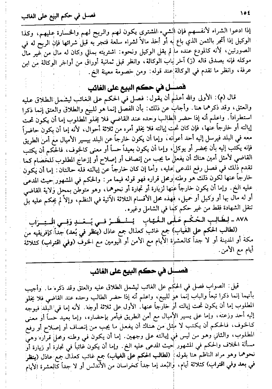 قَالَ (م) : الأولى وَالله أعلم أَن يَقُول: فصل فِي الحكم على الْغَائِب ليشْمل الطَّلَاق عَلَيْهِ وَالْعِتْق، وَقد ذكرهمَا هُنَا. وَأجَاب عَن ذَلِك: بِأَن الْفَصْل إِنَّمَا هُوَ للْبيع وَالطَّلَاق وَالْعِتْق إِنَّمَا ذكرا اسْتِطْرَادًا. وَاعْلَم أَنه إِذا حضر الطَّالِب وَحده عِنْد القَاضِي فَلَا يَخْلُو الْمَطْلُوب إِمَّا أَن يكون تَحت إيالته أَو خَارِجا عَنْهَا، فَإِن كَانَ تَحت إيالته فَلَا يَخْلُو أمره من ثَلَاثَة أَحْوَال، لِأَنَّهُ إِمَّا أَن يكون حَاضرا مَعَه فِي الْبَلَد فَيُرْسل إِلَيْهِ أحد أعوانه، وَإِمَّا أَن يكون خَارِجا عَن الْبَلَد بِيَسِير الأميال مَعَ أَمن الطَّرِيق فَإِنَّهُ يكْتب إِلَيْهِ بِأَن يحضر أَو يُوكل، وَإِمَّا أَن يكون بَعيدا حسا أَو معنى كالخوف، فَالْحكم أَن يكْتب القَاضِي لأمثل أَمِين هُنَاكَ أَن يفعل مَا يجب من إنصاف أَو إصْلَاح أَو إزعاج الْمَطْلُوب للخصام كَمَا تقدم ذَلِك فِي فصل رفع الْمُدعى عَلَيْهِ، وَأما إِن كَانَ خَارِجا عَن إيالته فَلهُ حالتان: إِمَّا أَن يكون خَارِجا عَنْهَا لكَون ذَلِك هُوَ وَطنه وَمحل قراره فَهُوَ قَوْله فِيمَا مر: وَالْحكم فِي الْمَشْهُور حَيْثُ الْمُدعى عَلَيْهِ الخ. وَإِمَّا أَن يكون خَارِجا عَنْهَا لزيارة أَو تِجَارَة أَو نَحْوهمَا، وَهُوَ متوطن بِمحل ولَايَة القَاضِي أَو لَهُ مَال بهَا أَو وَكيل أَو حميل، فَهَذِهِ مَحل الْأَقْسَام الثَّلَاثَة الْآتِيَة فِي النّظم، وإلاَّ لم يحكم عَلَيْهِ بل تنقل الشَّهَادَة فَقَط من غير حكم كَمَا فِي الشَّامِل وَغَيره. لِطَالِبِ الحُكْمِ عَلَى الغُيَّابِ يُنْظَرُ فِي بُعْدٍ وَفِي اقْتِرَاب (لطَالب الحكم على الغياب) جمع غَائِب كعذال جمع عاذل (ينظر فِي بُعد) جدا كإفريقيه من مَكَّة أَو الْمَدِينَة أَو لَا جدا كالعشرة الْأَيَّام مَعَ الْأَمْن أَو الْيَوْمَيْنِ مَعَ الْخَوْف (وَفِي اقتراب) كثلاثة أَيَّام مَعَ الْأَمْن.