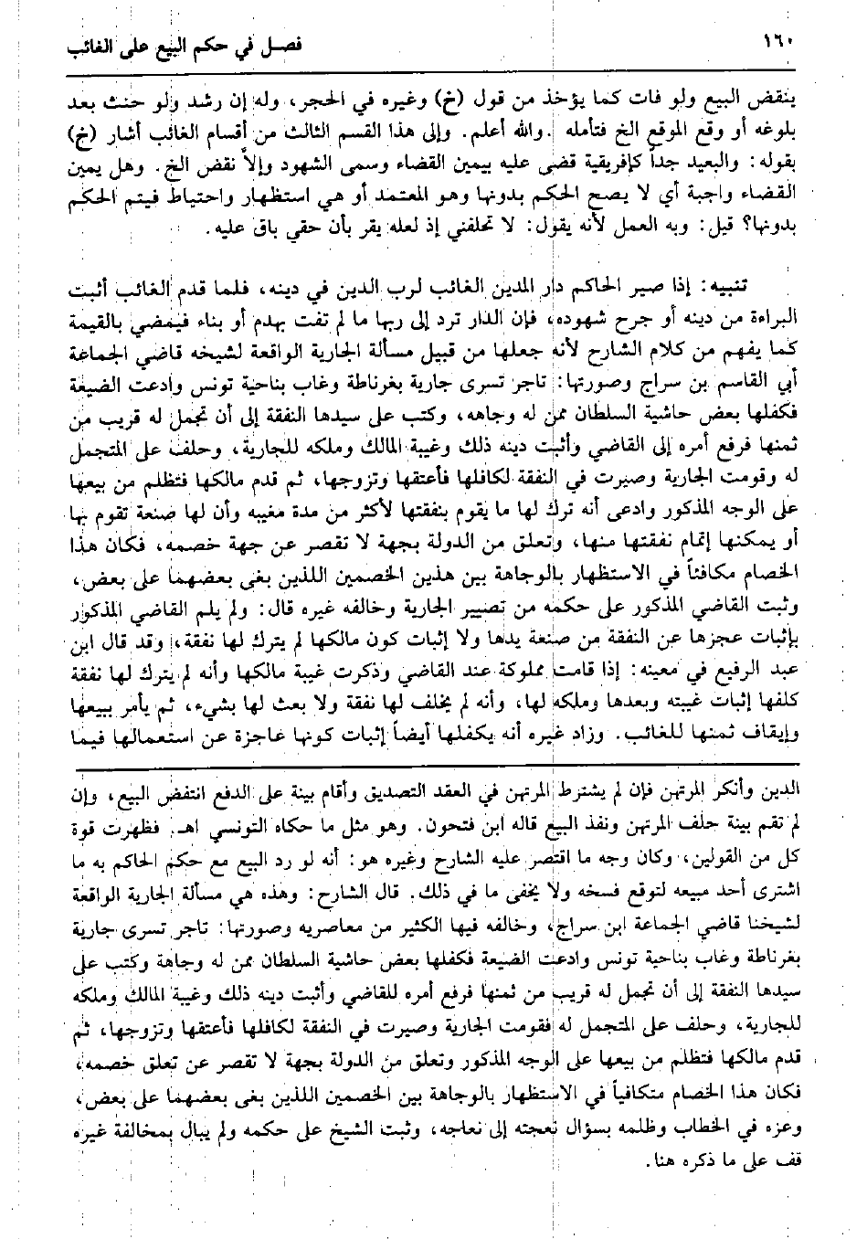 ينْقض البيع وَلَو فَاتَ كَمَا يُؤْخَذ من قَول (خَ) وَغَيره فِي الْحجر، وَله إِن رشد وَلَو حنث بعد بُلُوغه أَو وَقع الْموقع الخ فَتَأَمّله. وَالله أعلم. وَإِلَى هَذَا الْقسم الثَّالِث من أَقسَام الْغَائِب أَشَارَ (خَ) بقوله: والبعيد جدا كإفريقية قضى عَلَيْهِ بِيَمِين الْقَضَاء وسمى الشُّهُود وإلاَّ نقض الخ. وَهل يَمِين الْقَضَاء وَاجِبَة أَي لَا يَصح الحكم بِدُونِهَا وَهُوَ الْمُعْتَمد أَو هِيَ استظهار واحتياط فَيتم الحكم بِدُونِهَا؟ قيل: وَبِه الْعَمَل لِأَنَّهُ يَقُول: لَا تحلفني إِذْ لَعَلَّه يقر بِأَن حَقي بَاقٍ عَلَيْهِ. تَنْبِيه: إِذا صير الْحَاكِم دَار الْمَدِين الْغَائِب لرب الدّين فِي دينه، فَلَمَّا قدم الْغَائِب أثبت الْبَرَاءَة من دينه أَو جرح شُهُوده، فَإِن الدَّار ترد إِلَى رَبهَا مَا لم تفت بهدم أَو بِنَاء فيمضي بِالْقيمَةِ كَمَا يفهم من كَلَام الشَّارِح لِأَنَّهُ جعلهَا من قبيل مَسْأَلَة الْجَارِيَة الْوَاقِعَة لشيخه قَاضِي الْجَمَاعَة أبي الْقَاسِم بن سراج وَصورتهَا: تَاجر تسرى جَارِيَة بغرناطة وَغَابَ بِنَاحِيَة تونس وَادعت الضَّيْعَة فكفلها بعض حَاشِيَة السُّلْطَان مِمَّن لَهُ وجاهه، وَكتب على سَيِّدهَا النَّفَقَة إِلَى أَن تجمل لَهُ قريب من ثمنهَا فَرفع أمره إِلَى القَاضِي وَأثبت دينه ذَلِك وغيبة الْمَالِك وَملكه لِلْجَارِيَةِ، وَحلف على المتجمل لَهُ وقومت الْجَارِيَة وصيرت فِي النَّفَقَة لكافلها فَأعْتقهَا وَتَزَوجهَا، ثمَّ قدم مَالِكهَا فتظلم من بيعهَا على الْوَجْه الْمَذْكُور وَادّعى أَنه ترك لَهَا مَا يقوم بنفقتها لأكْثر من مُدَّة مغيبه وَأَن لَهَا صَنْعَة تقوم بهَا أَو يُمكنهَا إتْمَام نَفَقَتهَا مِنْهَا، وَتعلق من الدولة بِجِهَة لَا تقصر عَن جِهَة خَصمه، فَكَانَ هَذَا الْخِصَام مكافئاً فِي الِاسْتِظْهَار بالوجاهة بَين هذَيْن الْخَصْمَيْنِ اللَّذين بغى بعضهما على بعض، وَثَبت القَاضِي الْمَذْكُور على حكمه من تصيير الْجَارِيَة وَخَالفهُ غَيره قَالَ: وَلم يلم القَاضِي الْمَذْكُور بِإِثْبَات عجزها عَن النَّفَقَة من صَنْعَة يَدهَا وَلَا إِثْبَات كَون مَالِكهَا لم يتْرك لَهَا نَفَقَة، وَقد قَالَ ابْن عبد الرفيع فِي معينه: إِذا قَامَت مَمْلُوكَة عِنْد القَاضِي وَذكرت غيبَة مَالِكهَا وَأَنه لم يتْرك لَهَا نَفَقَة كلفها إِثْبَات غيبته وَبعدهَا وَملكه لَهَا، وَأَنه لم يخلف لَهَا نَفَقَة وَلَا بعث لَهَا بِشَيْء، ثمَّ يَأْمر بِبَيْعِهَا وإيقاف ثمنهَا للْغَائِب. وَزَاد غَيره أَنه يكفلها أَيْضا إِثْبَات كَونهَا عاجزة عَن اسْتِعْمَالهَا فِيمَا