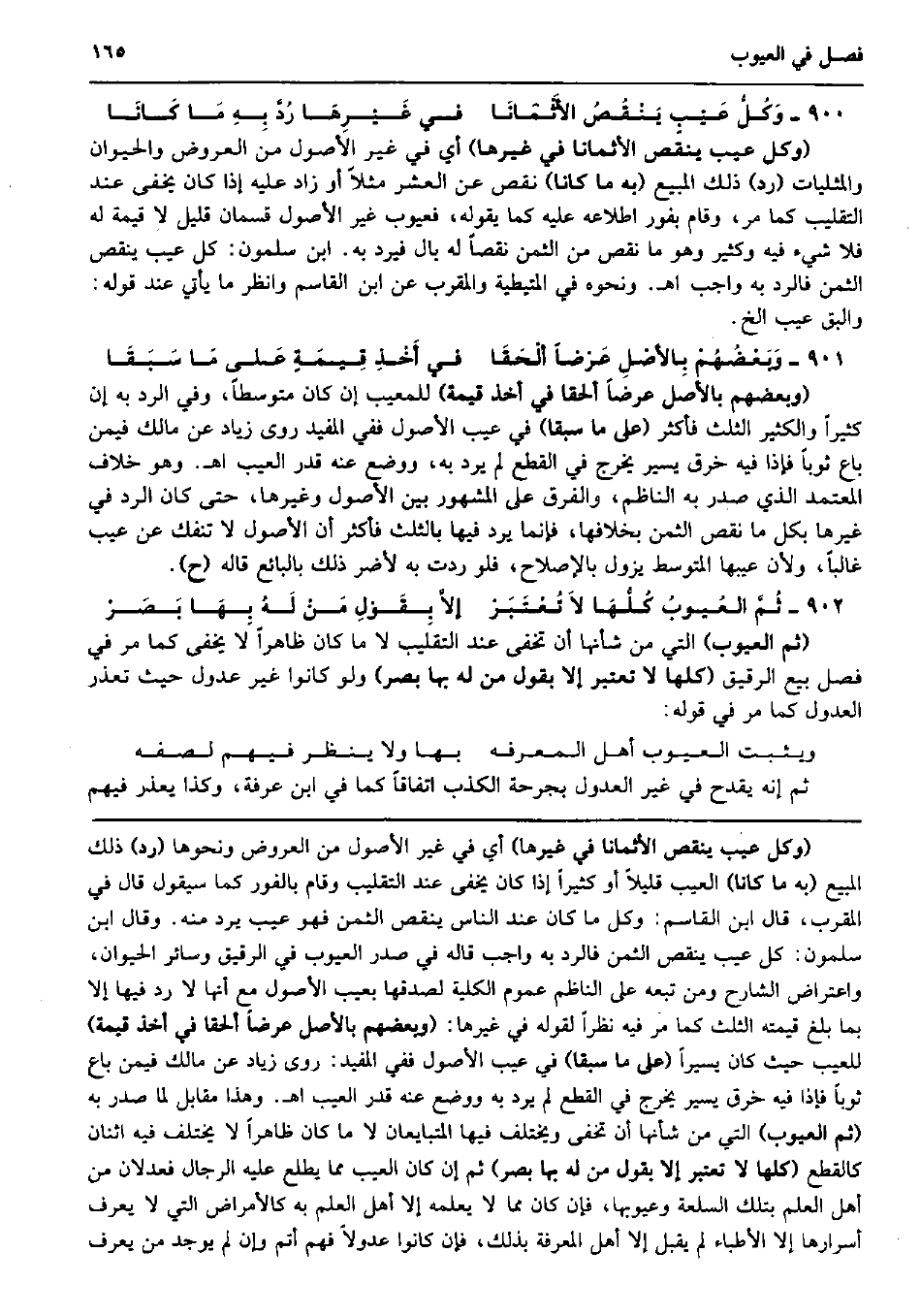 وَكُلُّ عَيْبٍ يَنْقُصُ الأَثْمَانَا فِي غَيْرِهَا رُدَّ بِهِ مَا كَانَا (وكل عيب ينقص الأثمانا فِي غَيرهَا) أَي فِي غير الْأُصُول من الْعرُوض وَالْحَيَوَان والمثليات (رد) ذَلِك الْمَبِيع (بِهِ مَا كَانَا) نقص عَن الْعشْر مثلا أَو زَاد عَلَيْهِ إِذا كَانَ يخفى عِنْد التقليب كَمَا مر، وَقَامَ بفور اطِّلَاعه عَلَيْهِ كَمَا يَقُوله، فعيوب غير الْأُصُول قِسْمَانِ قَلِيل لَا قيمَة لَهُ فَلَا شَيْء فِيهِ وَكثير وَهُوَ مَا نقص من الثّمن نقصا لَهُ بَال فَيرد بِهِ. ابْن سَلمُون: كل عيب ينقص الثّمن فالرد بِهِ وَاجِب اه. وَنَحْوه فِي الْمُتَيْطِيَّة والمقرب عَن ابْن الْقَاسِم وَانْظُر مَا يَأْتِي عِنْد قَوْله: والبق عيب الخ. وَبَعْضُهُمْ بِالأصْلِ عَرْضاً ألْحَقَا فِي أَخْذِ قِيمَةٍ عَلى مَا سَبَقَا (وَبَعْضهمْ بِالْأَصْلِ عرضا ألحقا فِي أَخذ قيمَة) للمعيب إِن كَانَ متوسطاً، وَفِي الرَّد بِهِ إِن كثيرا وَالْكثير الثُّلُث فَأكْثر (على مَا سبقا) فِي عيب الْأُصُول فَفِي الْمُفِيد روى زِيَاد عَن مَالك فِيمَن بَاعَ ثوبا فَإِذا فِيهِ خرق يسير يخرج فِي الْقطع لم يرد بِهِ، وَوضع عَنهُ قدر الْعَيْب اه. وَهُوَ خلاف الْمُعْتَمد الَّذِي صدر بِهِ النَّاظِم، وَالْفرق على الْمَشْهُور بَين الْأُصُول وَغَيرهَا، حَتَّى كَانَ الرَّد فِي غَيرهَا بِكُل مَا نقص الثّمن بِخِلَافِهَا، فَإِنَّمَا يرد فِيهَا بِالثُّلثِ فَأكْثر أَن الْأُصُول لَا تنفك عَن عيب غَالِبا، وَلِأَن عيبها الْمُتَوَسّط يَزُول بالإصلاح، فَلَو ردَّتْ بِهِ لأضر ذَلِك بالبائع قَالَه (ح) . ثُمَّ العُيوبُ كُلُّهَا لاَ تُعْتَبَرْ إلاَّ بِقَوْلِ مَنْ لَهُ بِهَا بَصَرْ (ثمَّ الْعُيُوب) الَّتِي من شَأْنهَا أَن تخفى عِنْد التقليب لَا مَا كَانَ ظَاهرا لَا يخفى كَمَا مر فِي فصل بيع الرَّقِيق (كلهَا لَا تعْتَبر إِلَّا بقول من لَهُ بهَا بصر) وَلَو كَانُوا غير عدُول حَيْثُ تعذر الْعُدُول كَمَا مر فِي قَوْله: وَيثبت الْعُيُوب أهل المعرفه بهَا وَلَا ينظر فيهم لصفه ثمَّ إِنَّه يقْدَح فِي غير الْعُدُول بجرحة الْكَذِب اتِّفَاقًا كَمَا فِي ابْن عَرَفَة، وَكَذَا يعْذر فيهم