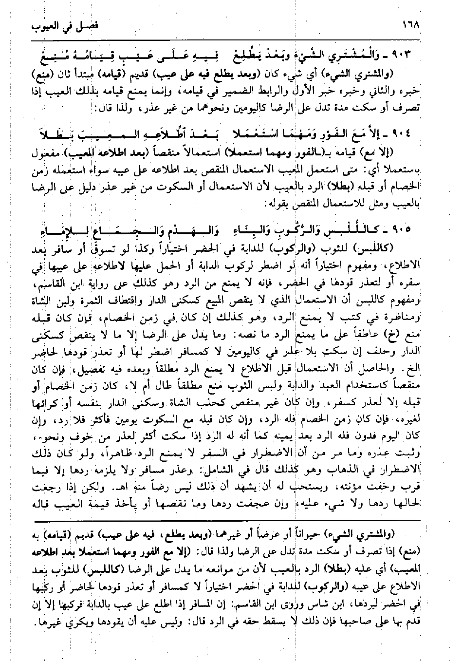 وَالْمُشْتَرِي الشَّيْءَ وبَعْدُ يَطَّلِعْ فِيهِ عَلَى عَيْبٍ قِيَامُهُ مُنِعْ (وَالْمُشْتَرِي الشَّيْء) أَي شَيْء كَانَ (وَبعد يطلع فِيهِ على عيب) قديم (قِيَامه) مُبْتَدأ ثَان (منع) خَبره وَالثَّانِي وَخَبره خبر الأول والرابط الضَّمِير فِي قِيَامه، وَإِنَّمَا يمْنَع قِيَامه بذلك الْعَيْب إِذا تصرف أَو سكت مُدَّة تدل على الرِّضَا كاليومين وَنَحْوهمَا من غير عذر، وَلذَا قَالَ: إلاَّ مَعَ الفَوْرِ وَمَهْمَا اسْتَعْمَلا بَعْدَ اطِّلاَعِهِ المعِيبَ بَطَلاَ (إِلَّا مَعَ) قِيَامه ب (الْفَوْر وَمهما استعملا) اسْتِعْمَالا منقصاً (بعد اطِّلَاعه الْمَعِيب) مفعول باستعملا أَي: مَتى اسْتعْمل الْمَعِيب الِاسْتِعْمَال المنقص بعد اطِّلَاعه على عَيبه سَوَاء اسْتَعْملهُ زمن الْخِصَام أَو قبله (بطلا) الرَّد بِالْعَيْبِ لِأَن الِاسْتِعْمَال أَو السُّكُوت من غير عذر دَلِيل على الرِّضَا بِالْعَيْبِ وَمثل للاستعمال المنقص بقوله: كاللُّلْبسِ وَالرُّكُوبِ وَالبِنَاءِ وَالهَدْمِ وَالجِمَاعِ لِلإِمَاءِ (كاللبس) للثوب (وَالرُّكُوب) للدابة فِي الْحَضَر اخْتِيَارا وَكَذَا لَو تَسوق أَو سَافر بعد الِاطِّلَاع، وَمَفْهُوم اخْتِيَارا أَنه لَو اضْطر لركوب الدَّابَّة أَو الْحمل عَلَيْهَا لاطلاعه على عيبها فِي سَفَره أَو لتعذر قودها فِي الْحَضَر، فَإِنَّهُ لَا يمْنَع من الرَّد وَهُوَ كَذَلِك على رِوَايَة ابْن الْقَاسِم، وَمَفْهُوم كاللبس أَن الِاسْتِعْمَال الَّذِي لَا ينقص الْمَبِيع كسكنى الدَّار واقتطاف الثَّمَرَة وَلبن الشَّاة ومناظرة فِي كتب لَا يمْنَع الرَّد، وَهُوَ كَذَلِك إِن كَانَ فِي زمن الْخِصَام، فَإِن كَانَ قبله منع (خَ) عاطفاً على مَا يمْنَع الرَّد مَا نَصه: وَمَا يدل على الرِّضَا إِلَّا مَا لَا ينقص كسكنى الدَّار وَحلف إِن سكت بِلَا عذر فِي كاليومين لَا كمسافر اضْطر لَهَا أَو تعذر قودها لحاضر الخ. وَالْحَاصِل أَن الِاسْتِعْمَال قبل الِاطِّلَاع لَا يمْنَع الرَّد مُطلقًا وَبعده فِيهِ تَفْصِيل، فَإِن كَانَ منقصاً كاستخدام العَبْد وَالدَّابَّة وَلبس الثَّوْب منع مُطلقًا طَال أم لَا، كَانَ زمن الْخِصَام أَو قبله إِلَّا لعذر كسفر، وَإِن كَانَ غير منقص كحلب الشَّاة وسكنى الدَّار بِنَفسِهِ أَو كرائها لغيره، فَإِن كَانَ زمن الْخِصَام فَلهُ الرَّد، وَإِن كَانَ قبله مَعَ السُّكُوت يَوْمَيْنِ فَأكْثر فَلَا رد، وَإِن كَانَ الْيَوْم فدون فَلهُ الرَّد بعد يَمِينه كَمَا أَنه لَهُ الرَّد إِذا سكت أَكثر لعذر من خوف وَنَحْوه وَثَبت عذره وَمَا مر من أَن الِاضْطِرَار فِي السّفر لَا يمْنَع الرَّد ظَاهرا، وَلَو كَانَ ذَلِك الِاضْطِرَار فِي الذّهاب وَهُوَ كَذَلِك قَالَ فِي الشَّامِل: وَعذر مُسَافر وَلَا يلْزمه ردهَا إِلَّا فِيمَا قرب وَخفت مُؤْنَته، وَيسْتَحب لَهُ أَن يشْهد أَن ذَلِك لَيْسَ رضَا مِنْهُ اه. وَلَكِن إِذا رجعت لحالها ردهَا وَلَا شَيْء عَلَيْهِ، وَإِن عجفت ردهَا وَمَا نَقصهَا أَو يَأْخُذ قيمَة الْعَيْب قَالَه