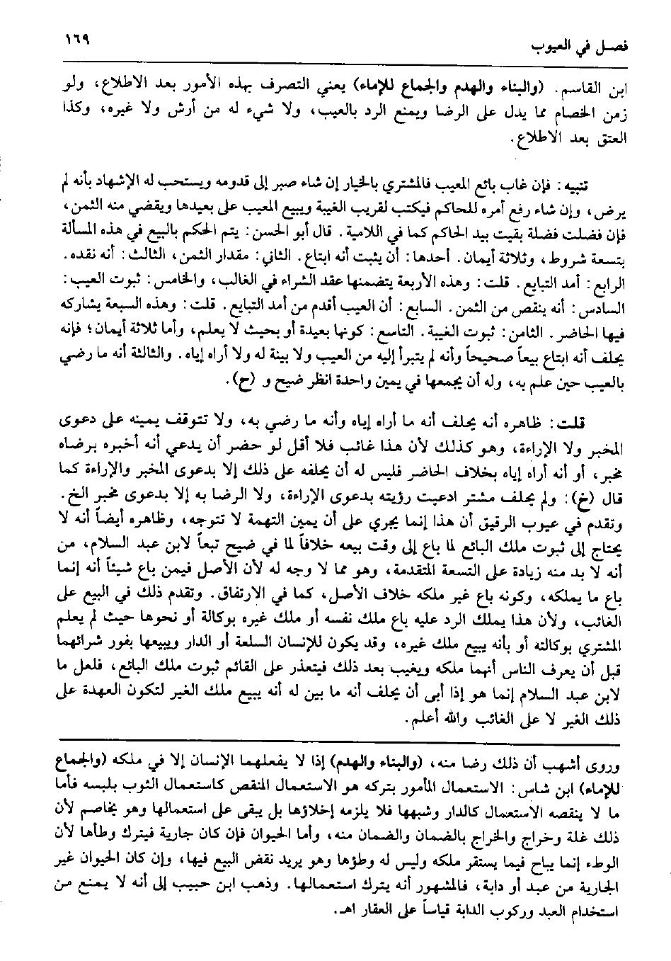 ابْن الْقَاسِم. (وَالْبناء وَالْهدم وَالْجِمَاع للإماء) يَعْنِي التَّصَرُّف بِهَذِهِ الْأُمُور بعد الِاطِّلَاع، وَلَو زمن الْخِصَام مِمَّا يدل على الرِّضَا وَيمْنَع الرَّد بِالْعَيْبِ، وَلَا شَيْء لَهُ من أرش وَلَا غَيره، وَكَذَا الْعتْق بعد الِاطِّلَاع. تَنْبِيه: فَإِن غَابَ بَائِع الْمَعِيب فَالْمُشْتَرِي بِالْخِيَارِ إِن شَاءَ صَبر إِلَى قدومه وَيسْتَحب لَهُ الْإِشْهَاد بِأَنَّهُ لم يرض، وَإِن شَاءَ رفع أمره للْحَاكِم فَيكْتب لقريب الْغَيْبَة وَيبِيع الْمَعِيب على بعيدها وَيَقْضِي مِنْهُ الثّمن، فَإِن فضلت فضلَة بقيت بيد الْحَاكِم كَمَا فِي اللامية. قَالَ أَبُو الْحسن: يتم الحكم بِالْبيعِ فِي هَذِه الْمَسْأَلَة بِتِسْعَة شُرُوط، وَثَلَاثَة أَيْمَان. أَحدهَا: أَن يثبت أَنه ابْتَاعَ. الثَّانِي: مِقْدَار الثّمن، الثَّالِث: أَنه نَقده. الرَّابِع: أمد التبايع. قلت: وَهَذِه الْأَرْبَعَة يتضمنها عقد الشِّرَاء فِي الْغَالِب، وَالْخَامِس: ثُبُوت الْعَيْب: السَّادِس: أَنه ينقص من الثّمن. السَّابِع: أَن الْعَيْب أقدم من أمد التبايع. قلت: وَهَذِه السَّبْعَة يُشَارِكهُ فِيهَا الْحَاضِر. الثَّامِن: ثُبُوت الْغَيْبَة. التَّاسِع: كَونهَا بعيدَة أَو بِحَيْثُ لَا يعلم، وَأما ثَلَاثَة أَيْمَان؛ فَإِنَّهُ يحلف أَنه ابْتَاعَ بيعا صَحِيحا وَأَنه لم يتبرأ إِلَيْهِ من الْعَيْب وَلَا بَيِّنَة لَهُ وَلَا أرَاهُ إِيَّاه. وَالثَّالِثَة أَنه مَا رَضِي بِالْعَيْبِ حِين علم بِهِ، وَله أَن يجمعها فِي يَمِين وَاحِدَة انْظُر ضيح و (ح) . قلت: ظَاهره أَنه يحلف أَنه مَا أرَاهُ إِيَّاه وَأَنه مَا رَضِي بِهِ، وَلَا تتَوَقَّف يَمِينه على دَعْوَى الْمخبر وَلَا الإراءة، وَهُوَ كَذَلِك لِأَن هَذَا غَائِب فَلَا أقل لَو حضر أَن يَدعِي أَنه أخبرهُ بِرِضَاهُ مخبر، أَو أَنه أرَاهُ إِيَّاه بِخِلَاف الْحَاضِر فَلَيْسَ لَهُ أَن يحلفهُ على ذَلِك إِلَّا بِدَعْوَى الْمخبر والإراءة كَمَا قَالَ (خَ) : وَلم يحلف مُشْتَر ادعيت رُؤْيَته بِدَعْوَى الإراءة، وَلَا الرِّضَا بِهِ إِلَّا بِدَعْوَى مخبر الخ. وَتقدم فِي عُيُوب الرَّقِيق أَن هَذَا إِنَّمَا يجْرِي على أَن يَمِين التُّهْمَة لَا تتَوَجَّه، وَظَاهره أَيْضا أَنه لَا يحْتَاج إِلَى ثُبُوت ملك البَائِع لما بَاعَ إِلَى وَقت بَيْعه خلافًا لما فِي ضيح تبعا لِابْنِ عبد السَّلَام، من أَنه لَا بُد مِنْهُ زِيَادَة على التِّسْعَة الْمُتَقَدّمَة، وَهُوَ مِمَّا لَا وَجه لَهُ لِأَن الأَصْل فِيمَن بَاعَ شَيْئا أَنه إِنَّمَا بَاعَ مَا يملكهُ، وَكَونه بَاعَ غير ملكه خلاف الأَصْل، كَمَا فِي الارتفاق. وَتقدم ذَلِك فِي البيع على الْغَائِب، وَلِأَن هَذَا يملك الرَّد عَلَيْهِ بَاعَ ملك نَفسه أَو ملك غَيره بوكالة أَو نَحْوهَا حَيْثُ لم يعلم المُشْتَرِي بوكالته أَو بِأَنَّهُ يَبِيع ملك غَيره، وَقد يكون للْإنْسَان السّلْعَة أَو الدَّار ويبيعها بفور شرائهما قبل أَن يعرف النَّاس أَنَّهُمَا ملكه ويغيب بعد ذَلِك فيتعذر على الْقَائِم ثُبُوت ملك البَائِع، فَلَعَلَّ مَا لِابْنِ عبد السَّلَام إِنَّمَا هُوَ إِذا أَبى أَن يحلف أَنه مَا بَين لَهُ أَنه يَبِيع ملك الْغَيْر لتَكون الْعهْدَة على ذَلِك الْغَيْر لَا على الْغَائِب وَالله أعلم.
