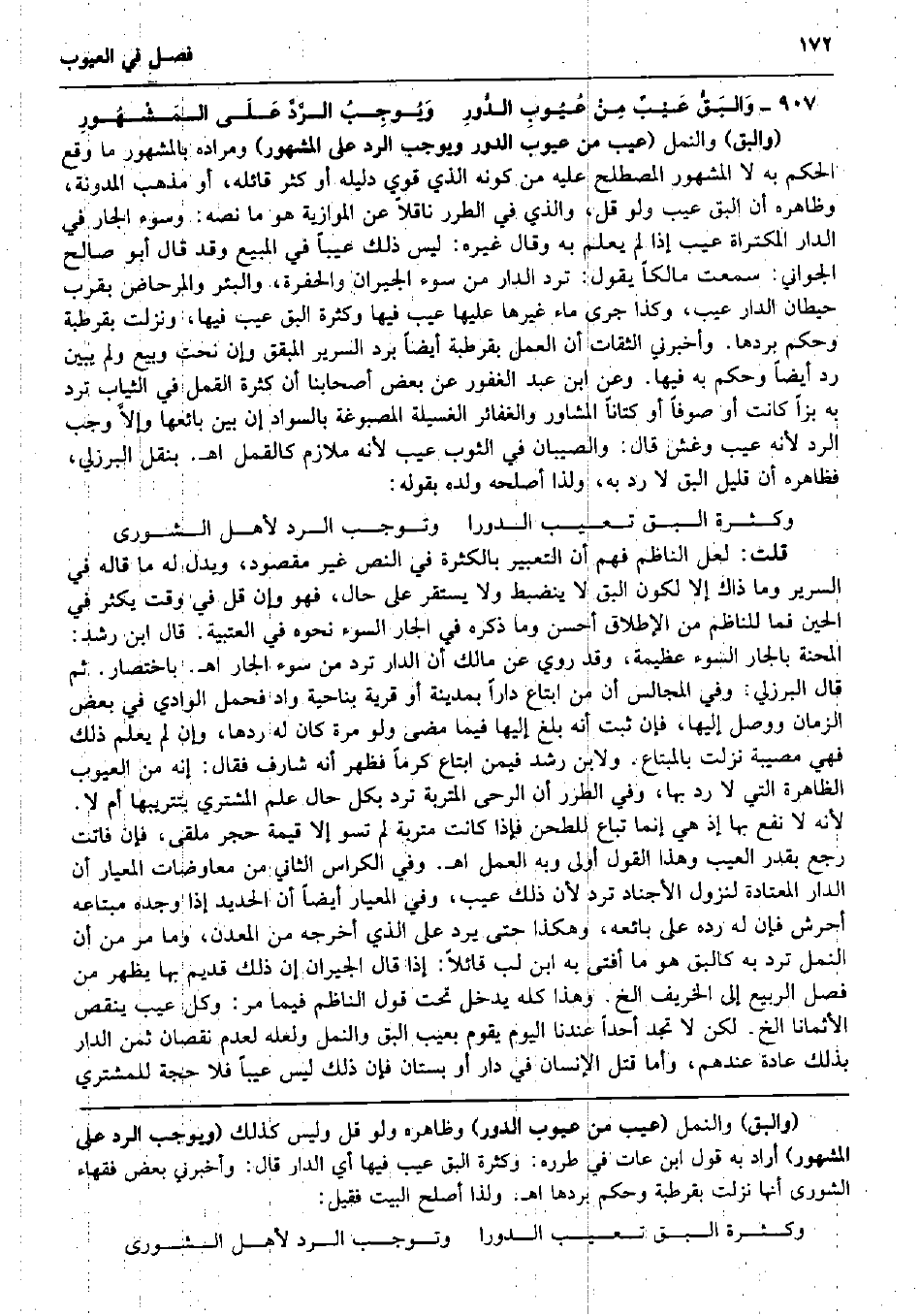 وَالبَقُّ عَيْبٌ مِنْ عُيُوبِ الدُّورِ وَيُوجِبُ الرَّدَّ عَلَى المَشْهُورِ (والبق) والنمل (عيب من عُيُوب الدّور وَيُوجب الرَّد على الْمَشْهُور) وَمرَاده بالمشهور مَا وَقع الحكم بِهِ لَا الْمَشْهُور المصطلح عَلَيْهِ من كَونه الَّذِي قوي دَلِيله أَو كثر قَائِله أَو مَذْهَب الْمُدَوَّنَة، وَظَاهره أَن البق عيب وَلَو قل، وَالَّذِي فِي الطرر نَاقِلا عَن الْمُوازِية هُوَ مَا نَصه: وَسُوء الْجَار فِي الدَّار المكتراة عيب إِذا لم يعلم بِهِ وَقَالَ غَيره: لَيْسَ ذَلِك عَيْبا فِي الْمَبِيع وَقد قَالَ أَبُو صَالح الجواني: سَمِعت مَالِكًا يَقُول: ترد الدَّار من سوء الْجِيرَان والحفرة، والبئر والمرحاض بِقرب حيطان الدَّار عيب، وَكَذَا جرى مَاء غَيرهَا عَلَيْهَا عيب فِيهَا وَكَثْرَة البق عيب فِيهَا، وَنزلت بقرطبة وَحكم بردهَا. وَأَخْبرنِي الثِّقَات أَن الْعَمَل بقرطبة أَيْضا برد السرير المبقق وَإِن نحت وَبيع وَلم يبين رد أَيْضا وَحكم بِهِ فِيهَا. وَعَن ابْن عبد الغفور عَن بعض أَصْحَابنَا أَن كَثْرَة الْقمل فِي الثِّيَاب ترد بِهِ بزاً كَانَت أَو صُوفًا أَو كتاناً المشاور والغفائر الغسيلة المصبوغة بِالسَّوَادِ إِن بَين بَائِعهَا وإلاَّ وَجب الرَّد لِأَنَّهُ عيب وغش قَالَ: والصيبان فِي الثَّوْب عيب لِأَنَّهُ ملازم كالقمل اه. بِنَقْل الْبُرْزُليّ، فَظَاهره أَن قَلِيل البق لَا رد بِهِ، وَلذَا أصلحه وَلَده بقوله: وَكَثْرَة البق تعيب الدورا وتوجب الرَّد لأهل الشورى قلت: لَعَلَّ النَّاظِم فهم أَن التَّعْبِير بِالْكَثْرَةِ فِي النَّص غير مَقْصُود، وَيدل لَهُ مَا قَالَه فِي السرير وَمَا ذَاك إِلَّا لكَون البق لَا يَنْضَبِط وَلَا يسْتَقرّ على حَال، فَهُوَ وَإِن قل فِي وَقت يكثر فِي الْحِين فَمَا للناظم من الْإِطْلَاق أحسن وَمَا ذكره فِي الْجَار السوء نَحوه فِي الْعُتْبِيَّة. قَالَ ابْن رشد: المحنة بالجار السوء عَظِيمَة، وَقد رُوِيَ عَن مَالك أَن الدَّار ترد من سوء الْجَار اه. بِاخْتِصَار. ثمَّ قَالَ الْبُرْزُليّ: وَفِي الْمجَالِس أَن من ابْتَاعَ دَارا بِمَدِينَة أَو قَرْيَة بِنَاحِيَة وَاد فَحمل الْوَادي فِي بعض الزَّمَان وَوصل إِلَيْهَا، فَإِن ثَبت أَنه بلغ إِلَيْهَا فِيمَا مضى وَلَو مرّة كَانَ لَهُ ردهَا، وَإِن لم يعلم ذَلِك فَهِيَ مُصِيبَة نزلت بالمبتاع. وَلابْن رشد فِيمَن ابْتَاعَ كرماً فَظهر أَنه شَارف فَقَالَ: إِنَّه من الْعُيُوب الظَّاهِرَة الَّتِي لَا رد بهَا، وَفِي الطرر أَن الرَّحَى المتربة ترد بِكُل حَال علم المُشْتَرِي بتتريبها أم لَا. لِأَنَّهُ لَا نفع بهَا إِذْ هِيَ إِنَّمَا تبَاع للطحن فَإِذا كَانَت مَتْرَبَة لم تسو إِلَّا قيمَة حجر ملقى، فَإِن فَاتَت رَجَعَ بِقدر الْعَيْب وَهَذَا القَوْل أولى وَبِه الْعَمَل اه. وَفِي الكراس الثَّانِي من معاوضات المعيار أَن الدَّار الْمُعْتَادَة لنزول الأجناد ترد لِأَن ذَلِك عيب، وَفِي المعيار أَيْضا أَن الْحَدِيد إِذا وجده مبتاعه أحرش فَإِن لَهُ رده على بَائِعه، وَهَكَذَا حَتَّى يرد على الَّذِي أخرجه من الْمَعْدن، وَمَا مر من أَن النَّمْل ترد بِهِ كالبق هُوَ مَا أفتى بِهِ ابْن لب قَائِلا: إِذا قَالَ الْجِيرَان إِن ذَلِك قديم بهَا يظْهر من فصل الرّبيع إِلَى الخريف الخ. وَهَذَا كُله يدْخل تَحت قَول النَّاظِم فِيمَا مر: وكل عيب ينقص الأثمانا الخ. لَكِن لَا تَجِد أحدا عندنَا الْيَوْم يقوم بِعَيْب البق والنمل وَلَعَلَّه لعدم نُقْصَان ثمن الدَّار بذلك عَادَة عِنْدهم، وَأما قتل الْإِنْسَان فِي دَار أَو بُسْتَان فَإِن ذَلِك لَيْسَ عَيْبا فَلَا حجَّة للْمُشْتَرِي