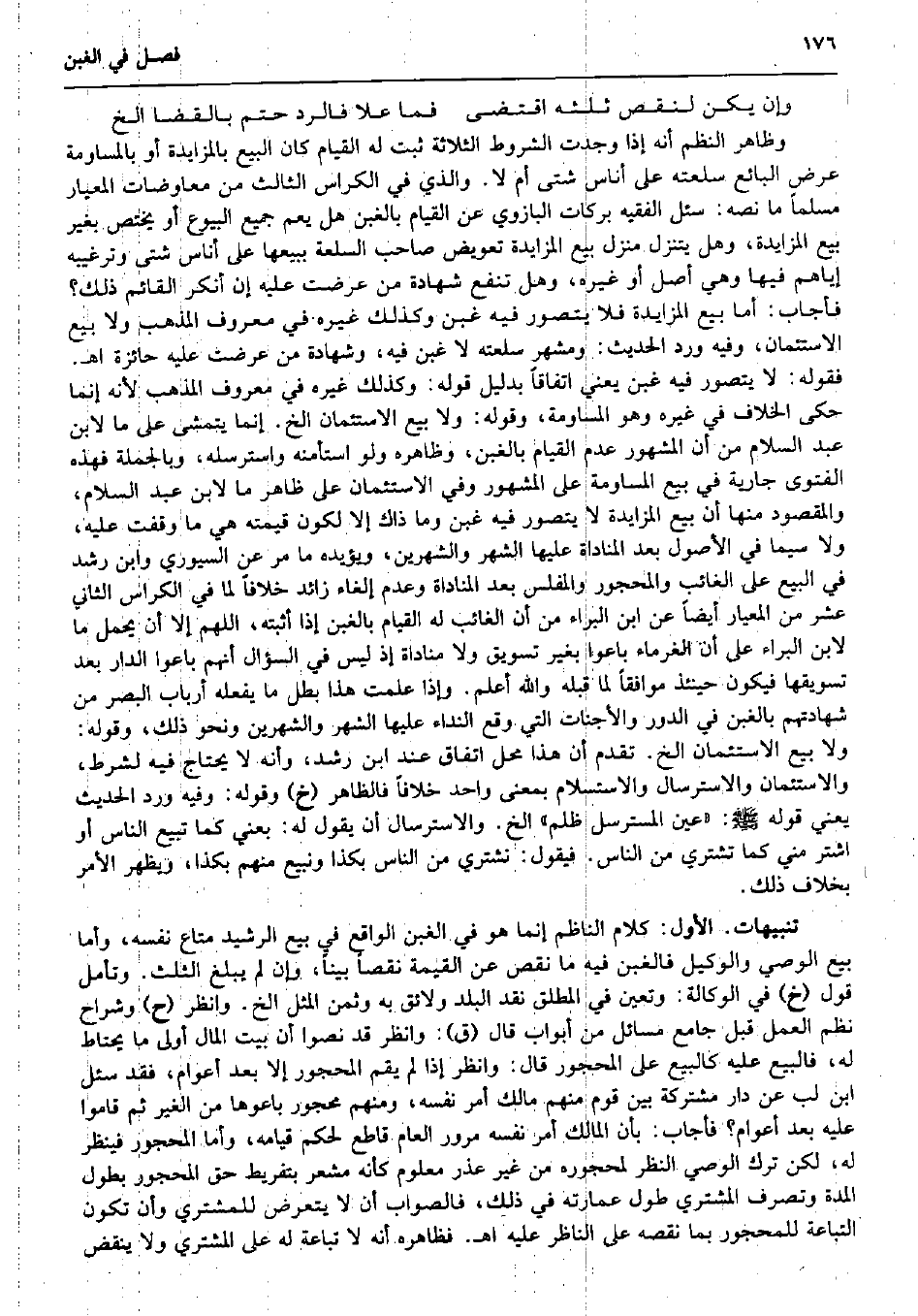 وَإِن يكن لنَقص ثلثه اقْتضى فَمَا علا فالرد حتم بالقضا الخ وَظَاهر النّظم أَنه إِذا وجدت الشُّرُوط الثَّلَاثَة ثَبت لَهُ الْقيام كَانَ البيع بالمزايدة أَو بالمساومة عرض البَائِع سلْعَته على أنَاس شَتَّى أم لَا. وَالَّذِي فِي الكراس الثَّالِث من معاوضات المعيار مُسلما مَا نَصه: سُئِلَ الْفَقِيه بَرَكَات البازوي عَن الْقيام بِالْغبنِ هَل يعم جَمِيع الْبيُوع أَو يخْتَص بِغَيْر بيع المزايدة، وَهل يتنزل منزل بيع المزايدة تعويض صَاحب السّلْعَة بِبَيْعِهَا على أنَاس شَتَّى وترغيبه إيَّاهُم فِيهَا وَهِي أصل أَو غَيره، وَهل تَنْفَع شَهَادَة من عرضت عَلَيْهِ إِن أنكر الْقَائِم ذَلِك؟ فَأجَاب: أما بيع المزايدة فَلَا يتَصَوَّر فِيهِ غبن وَكَذَلِكَ غَيره فِي مَعْرُوف الْمَذْهَب وَلَا بيع الاستئمان، وَفِيه ورد الحَدِيث: ومشهر سلْعَته لَا غبن فِيهِ، وَشَهَادَة من عرضت عَلَيْهِ حائزة اه. فَقَوله: لَا يتَصَوَّر فِيهِ غبن يَعْنِي اتِّفَاقًا بِدَلِيل قَوْله: وَكَذَلِكَ غَيره فِي مَعْرُوف الْمَذْهَب لِأَنَّهُ إِنَّمَا حكى الْخلاف فِي غَيره وَهُوَ المساومة، وَقَوله: وَلَا بيع الاستئمان الخ. إِنَّمَا يتمشى على مَا لِابْنِ عبد السَّلَام من أَن الْمَشْهُور عدم الْقيام بِالْغبنِ، وَظَاهره وَلَو استأمنه واسترسله، وَبِالْجُمْلَةِ فَهَذِهِ الْفَتْوَى جَارِيَة فِي بيع المساومة على الْمَشْهُور وَفِي الاستئمان على ظَاهر مَا لِابْنِ عبد السَّلَام، وَالْمَقْصُود مِنْهَا أَن بيع المزايدة لَا يتَصَوَّر فِيهِ غبن وَمَا ذَاك إِلَّا لكَون قِيمَته هِيَ مَا وقفت عَلَيْهِ، وَلَا سِيمَا فِي الْأُصُول بعد المناداة عَلَيْهَا الشَّهْر والشهرين، وَيُؤَيِّدهُ مَا مر عَن السيوري وَابْن رشد فِي البيع على الْغَائِب والمحجور والمفلس بعد المناداة وَعدم إِلْغَاء زَائِد خلافًا لما فِي الكراس الثَّانِي عشر من المعيار أَيْضا عَن ابْن الْبَراء من أَن الْغَائِب لَهُ الْقيام بِالْغبنِ إِذا أثْبته اللَّهُمَّ إِلَّا أَن يحمل مَا لِابْنِ الْبَراء على أَن الْغُرَمَاء باعوا بِغَيْر تسويق وَلَا مناداة إِذْ لَيْسَ فِي السُّؤَال أَنهم باعوا الدَّار بعد تسويقها فَيكون حِينَئِذٍ مُوَافقا لما قبله وَالله أعلم. وَإِذا علمت هَذَا بَطل مَا يَفْعَله أَرْبَاب الْبَصَر من شَهَادَتهم بِالْغبنِ فِي الدّور والأجنات الَّتِي وَقع النداء عَلَيْهَا الشَّهْر والشهرين وَنَحْو ذَلِك، وَقَوله: وَلَا بيع الاستئمان الخ. تقدم أَن هَذَا مَحل اتِّفَاق عِنْد ابْن رشد، وَأَنه لَا يحْتَاج فِيهِ لشرط، والاستئمان والاسترسال والاستسلام بِمَعْنى وَاحِد خلافًا فَالظَّاهِر (خَ) وَقَوله: وَفِيه ورد الحَدِيث يَعْنِي قَوْله صلى الله عَلَيْهِ وَسلم: (عين المسترسل ظلم) الخ. والاسترسال أَن يَقُول لَهُ: بِعني كَمَا تبيع النَّاس أَو اشْتَرِ مني كَمَا تشتري من النَّاس. فَيَقُول: نشتري من النَّاس بِكَذَا ونبيع مِنْهُم بِكَذَا، وَيظْهر الْأَمر بِخِلَاف ذَلِك. تَنْبِيهَات. الأول: كَلَام النَّاظِم إِنَّمَا هُوَ فِي الْغبن الْوَاقِع فِي بيع الرشيد مَتَاع نَفسه، وَأما بيع الْوَصِيّ وَالْوَكِيل فالغبن فِيهِ مَا نقص عَن الْقيمَة نقصا بَينا، وَإِن لم يبلغ الثُّلُث. وَتَأمل قَول (خَ) فِي الْوكَالَة: وَتعين فِي الْمُطلق نقد الْبَلَد ولائق بِهِ وَثمن الْمثل الخ. وَانْظُر (ح) وشراح نظم الْعَمَل قبل جَامع مسَائِل من أَبْوَاب قَالَ (ق) : وَانْظُر قد نصوا أَن بَيت المَال أولى مَا يحْتَاط لَهُ، فَالْبيع عَلَيْهِ كَالْبيع على الْمَحْجُور قَالَ: وَانْظُر إِذا لم يقم الْمَحْجُور إِلَّا بعد أَعْوَام، فقد سُئِلَ ابْن لب عَن دَار مُشْتَركَة بَين قوم مِنْهُم مَالك أَمر نَفسه، وَمِنْهُم مَحْجُور باعوها من الْغَيْر ثمَّ قَامُوا عَلَيْهِ بعد أَعْوَام؟ فَأجَاب: بِأَن الْمَالِك أَمر نَفسه مُرُور الْعَام قَاطع لحكم قِيَامه، وَأما الْمَحْ