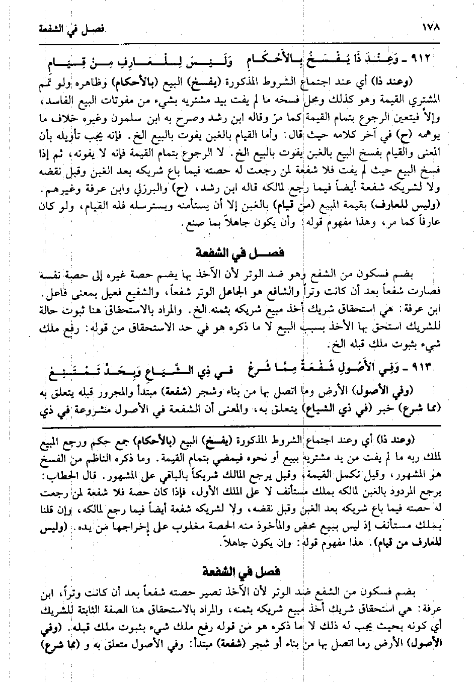بِضَم فَسُكُون من الشفع وَهُوَ ضد الْوتر لِأَن الْآخِذ بهَا يضم حِصَّة غَيره إِلَى حِصَّة نَفسه فَصَارَت شفعاً بعد أَن كَانَت وترا والشافع هُوَ الْجَاعِل الْوتر شفعاً، وَالشَّفِيع فعيل بِمَعْنى فَاعل. ابْن عَرَفَة: هِيَ اسْتِحْقَاق شريك أَخذ مَبِيع شَرِيكه بِثمنِهِ الخ. وَالْمرَاد بِالِاسْتِحْقَاقِ هُنَا ثُبُوت حَالَة للشَّرِيك اسْتحق بهَا الْأَخْذ بِسَبَب البيع لَا مَا ذكره هُوَ فِي حد الِاسْتِحْقَاق من قَوْله: رفع ملك شَيْء بِثُبُوت ملك قبله الخ. وَفِي الأَصُولِ شُفْعَةٌ مِمَّا شُرعْ فِي ذِي الشَّيَاعِ وَبِحَدَ تَمْتَنِعْ (وَفِي الْأُصُول) الأَرْض وَمَا اتَّصل بهَا من بِنَاء وَشَجر (شُفْعَة) مُبْتَدأ وَالْمَجْرُور قبله يتَعَلَّق بِهِ (مِمَّا شرع) خبر (فِي ذِي الشياع) يتَعَلَّق بِهِ، وَالْمعْنَى أَن الشُّفْعَة فِي الْأُصُول مَشْرُوعَة فِي ذِي