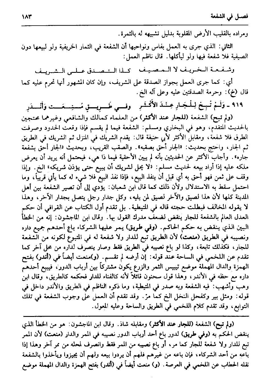 وَمرَاده بالقليب الأَرْض المقلوبة بِدَلِيل تشبيهه لَهُ بالثمرة. الثَّانِي: الَّذِي جرى بِهِ الْعَمَل بفاس ونواحيها أَن الشُّفْعَة فِي الثِّمَار الخريفية وَلَو لبيعها دون الصيفية فَلَا شُفْعَة فِيهَا وَلَو ليأكلها. قَالَ ناظم الْعَمَل: وشفعة الخريف لَا المصيف كَذَا التَّصَدُّق على الشريف أَي: كَمَا جرى الْعَمَل بِجَوَاز الصَّدَقَة على الشريف، وَإِن كَانَ الْمَشْهُور أَنَّهَا تحرم عَلَيْهِ كَمَا قَالَ (خَ) : وَحُرْمَة الصدقتين عَلَيْهِ وعَلى آله الخ. وَلَمْ تُبِحْ لِلْجَارِ عِنْدَ الأَكْثَرِ وَفِي طَرِيقٍ مُنِعَت وَأَنْدَرِ (وَلم تبح) الشُّفْعَة (للْجَار عِنْد الْأَكْثَر) من الْعلمَاء كمالك وَالشَّافِعِيّ وَغَيرهمَا محتجين بِالْحَدِيثِ الْمُتَقَدّم، وَهُوَ فِي البُخَارِيّ وَمُسلم: الشُّفْعَة فِيمَا لم يقسم فَإِذا وَقعت الْحُدُود وصرفت الطّرق فَلَا شُفْعَة، وَمُقَابل الْأَكْثَر لأبي حنيفَة قَالَ: يقدم الشَّرِيك فِي الْمنزل ثمَّ الشَّرِيك فِي الطَّرِيق ثمَّ الْجَار، وَاحْتج بِحَدِيث: (الْجَار أَحَق بصقبه) . والصقب الْقَرِيب، وَبِحَدِيث (الْجَار أَحَق بشفعة جَاره) . وَأجَاب الْأَكْثَر عَن الْحَدِيثين بِأَنَّهُ لم يبين الأحقية فِيمَا ذَا هِيَ، فَيحْتَمل أَنه يُرِيد أَن يعرض ملكه عَلَيْهِ إِذا أَرَادَ بَيْعه لحَدِيث مُسلم: (لَا يحل لِشَرِيك أَن يَبِيع حَتَّى يُؤذن شَرِيكه) الخ. وَإِذا وقف على ثمن فَهُوَ أَحَق بِهِ أَي قبل أَن ينفذ البيع، فَإِذا نفذ البيع فَلَا شَيْء لَهُ كَمَا يَأْتِي قَرِيبا، وَمَا احْتمل سقط بِهِ الِاسْتِدْلَال وَلِأَن ذَلِك كَمَا قَالَ ابْن شعْبَان: يُؤَدِّي إِلَى أَن تصير الشُّفْعَة بَين أهل الْمَدِينَة كلهَا لِأَن هَذَا لصيق وَالْآخر لصيق لمن يَلِيهِ، وكل جِدَار رجل يتَّصل بجدار الآخر، وَهَذَا لَا يَقُوله الْمُخَالف فبطلت حجَّته قَالَه فِي الْمُتَيْطِيَّة. بل تقدم أول الْكتاب عَن الْقَرَافِيّ أَن حكم الْعدْل الْعَالم بِالشُّفْعَة للْجَار ينْقض لضعف مدرك القَوْل بهَا. وَقَالَ ابْن الْمَاجشون: إِنَّه من الْخَطَأ الْبَين الَّذِي ينْقض بِهِ حكم الْحَاكِم. (وَفِي طَرِيق) يمر عَلَيْهَا الشُّرَكَاء بَاعَ أحدهم جَمِيع دَاره ونصيبه فِي الطَّرِيق (منعت) لِأَن الطَّرِيق تبع للدَّار وَلَا شُفْعَة لَهُ فِي الْمَتْبُوع لكَونه من الشُّفْعَة للْجَار، فَكَذَلِك تَابِعَة، وَكَذَا لَو بَاعَ نصِيبه فِي الطَّرِيق فَقَط وَصَارَ ينْصَرف لداره من مَحل آخر كَمَا تقدم عَن اللَّخْمِيّ فِي الساحة عِنْد قَوْله: إِن أرضه لم تقسم. (و) منعت أَيْضا فِي (أندر) بِفَتْح الْهمزَة وَالدَّال الْمُهْملَة مَوضِع تيبيس الثَّمر وَالزَّرْع يكون مُشْتَركا بَين أَرْبَاب الدّور، فيبيع أحدهم دَاره مَعَ حَظه فِي الأندر، وَهَذَا قَول سَحْنُون قَائِلا لِأَنَّهُ كالفناء للدَّار فَحكمه كالطريق، وَقَالَ ابْن وهب وَأَشْهَب: فِيهِ الشُّفْعَة وَبِه صدر فِي الْمُتَيْطِيَّة، وَمَا ذكره النَّاظِم فِي الطَّرِيق والأندر دَاخل فِي قَوْله: وَمثل بير وكفحل النّخل الخ كَمَا مرّ. وَقد تقدم أَن الْعَمَل على وجوب الشُّفْعَة فِي تِلْكَ التوابع، وَقد تقدم كَلَام اللَّخْمِيّ فِي الطَّرِيق والساحة وَعَلِيهِ الْمعول.