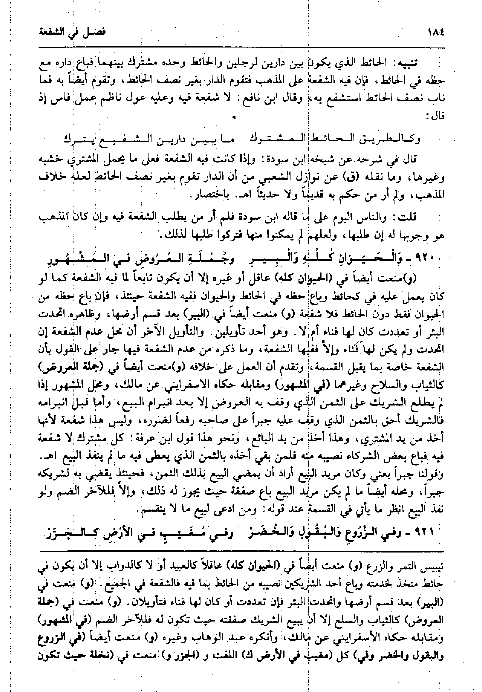 تَنْبِيه: الْحَائِط الَّذِي يكون بَين دارين لِرجلَيْنِ والحائط وَحده مُشْتَرك بَينهمَا فَبَاعَ دَاره مَعَ حَظه فِي الْحَائِط، فَإِن فِيهِ الشُّفْعَة على الْمَذْهَب فتقوم الدَّار بِغَيْر نصف الْحَائِط، وَتقوم أَيْضا بِهِ فَمَا نَاب نصف الْحَائِط استشفع بِهِ، وَقَالَ ابْن نَافِع: لَا شُفْعَة فِيهِ وَعَلِيهِ عول ناظم عمل فاس إِذْ قَالَ: وكالطريق الْحَائِط الْمُشْتَرك مَا بَين دارين الشَّفِيع يتْرك قَالَ فِي شَرحه عَن شَيْخه ابْن سَوْدَة: وَإِذا كَانَت فِيهِ الشُّفْعَة فعلى مَا يحمل المُشْتَرِي خشبه وَغَيرهَا، وَمَا نَقله (ق) عَن نَوَازِل الشّعبِيّ من أَن الدَّار تقوم بِغَيْر نصف الْحَائِط لَعَلَّه خلاف الْمَذْهَب، وَلم أر من حكم بِهِ قَدِيما وَلَا حَدِيثا اه. بِاخْتِصَار. قلت: وَالنَّاس الْيَوْم على مَا قَالَه ابْن سَوْدَة فَلم أر من يطْلب الشُّفْعَة فِيهِ وَإِن كَانَ الْمَذْهَب هُوَ وُجُوبهَا لَهُ إِن طلبَهَا، ولعلهم لم يمكنوا مِنْهَا فتركوا طلبَهَا لذَلِك. وَالْحَيَوَانِ كُلِّهِ وَالْبِيرِ وجُمْلَةِ العُرُوضِ فِي المَشْهُورِ (و) منعت أَيْضا فِي (الْحَيَوَان كُله) عَاقل أَو غَيره إِلَّا أَن يكون تَابعا لما فِيهِ الشُّفْعَة كَمَا لَو كَانَ يعْمل عَلَيْهِ فِي كحائط وَبَاعَ حَظه فِي الْحَائِط وَالْحَيَوَان فَفِيهِ الشُّفْعَة حِينَئِذٍ، فَإِن بَاعَ حَظه من الْحَيَوَان فَقَط دون الْحَائِط فَلَا شُفْعَة (و) منعت أَيْضا فِي (البير) بعد قسم أرْضهَا، وَظَاهره اتّحدت الْبِئْر أَو تعدّدت كَانَ لَهَا فنَاء أم لَا. وَهُوَ أحد تأويلين. والتأويل الآخر أَن مَحل عدم الشُّفْعَة إِن اتّحدت وَلم يكن لَهَا فنَاء وإلاَّ فَفِيهَا الشُّفْعَة، وَمَا ذكره من عدم الشُّفْعَة فِيهَا جَار على القَوْل بِأَن الشُّفْعَة خَاصَّة بِمَا يقبل الْقِسْمَة، وَتقدم أَن الْعَمَل على خِلَافه (و) منعت أَيْضا فِي (جملَة الْعرُوض) كالثياب وَالسِّلَاح وَغَيرهمَا (فِي الْمَشْهُور) وَمُقَابِله حَكَاهُ الاسفرايني عَن مَالك، وَمحل الْمَشْهُور إِذا لم يطلع الشَّرِيك على الثّمن الَّذِي وقف بِهِ الْعرُوض إِلَّا بعد انبرام البيع، وَأما قبل انبرامه فالشريك أَحَق بِالثّمن الَّذِي وقف عَلَيْهِ جبرا على صَاحبه رفعا لضرره، وَلَيْسَ هَذَا شُفْعَة لِأَنَّهَا أَخذ من يَد المُشْتَرِي، وَهَذَا أَخذ من يَد البَائِع، وَنَحْو هَذَا قَول ابْن عَرَفَة: كل مُشْتَرك لَا شُفْعَة فِيهِ فَبَاعَ بعض الشُّرَكَاء نصِيبه مِنْهُ فَلِمَنْ بَقِي أَخذه بِالثّمن الَّذِي يعْطى فِيهِ مَا لم ينفذ البيع اه. وَقَوْلنَا جبرا يَعْنِي وَكَانَ مُرِيد البيع أَرَادَ أَن يمْضِي البيع بذلك الثّمن، فَحِينَئِذٍ يقْضِي بِهِ لشَرِيكه جبرا، وَمحله أَيْضا مَا لم يكن مُرِيد البيع بَاعَ صَفْقَة حَيْثُ يجوز لَهُ ذَلِك، وإلاَّ فللآخر الضَّم وَلَو نفذ البيع انْظُر مَا يَأْتِي فِي الْقِسْمَة عِنْد قَوْله: وَمن ادّعى لبيع مَا لَا يَنْقَسِم. وَفِي الزُّرُوعِ وَالبُقُولِ وَالخُضَرْ وَفِي مُغَيّبٍ فِي الأرْضِ كالجَزَرْ
