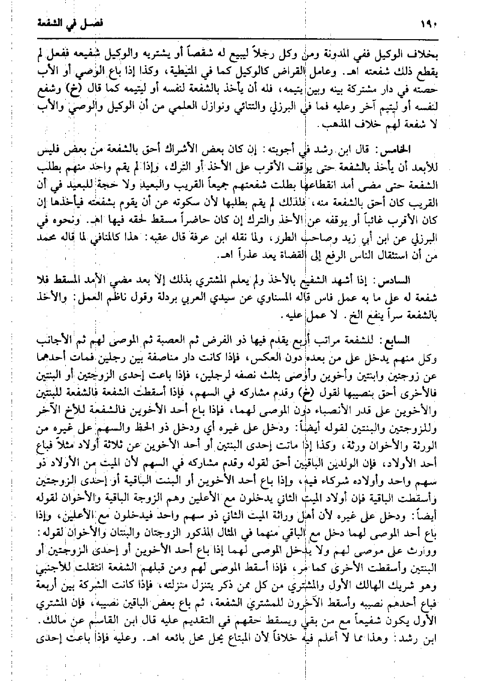 بِخِلَاف الْوَكِيل فَفِي الْمُدَوَّنَة وَمن وكل رجلا ليبيع لَهُ شِقْصا أَو يَشْتَرِيهِ وَالْوَكِيل شفيعه فَفعل لم يقطع ذَلِك شفعته اه. وعامل الْقَرَاض كَالْوَكِيلِ كَمَا فِي الْمُتَيْطِيَّة، وَكَذَا إِذا بَاعَ الْوَصِيّ أَو الْأَب حِصَّته فِي دَار مُشْتَركَة بَينه وَبَين يتيمه، فَلهُ أَن يَأْخُذ بِالشُّفْعَة لنَفسِهِ أَو ليتيمه كَمَا قَالَ (خَ) وشفع لنَفسِهِ أَو ليتيم آخر وَعَلِيهِ فَمَا فِي الْبُرْزُليّ والتتائي ونوازل العلمي من أَن الْوَكِيل وَالْوَصِيّ وَالْأَب لَا شُفْعَة لَهُم خلاف الْمَذْهَب. الْخَامِس: قَالَ ابْن رشد فِي أجوبته: إِن كَانَ بعض الأشراك أَحَق بِالشُّفْعَة من بعض فَلَيْسَ للأبعد أَن يَأْخُذ بِالشُّفْعَة حَتَّى يُوقف الْأَقْرَب على الْأَخْذ أَو التّرْك، وَإِذا لم يقم وَاحِد مِنْهُم بِطَلَب الشُّفْعَة حَتَّى مضى أمد انقطاعها بطلت شفعتهم جَمِيعًا الْقَرِيب والبعيد وَلَا حجَّة للبعيد فِي أَن الْقَرِيب كَانَ أَحَق بِالشُّفْعَة مِنْهُ، فَلذَلِك لم يقم بطلبها لِأَن سُكُوته عَن أَن يقوم بشفعته فيأخذها إِن كَانَ الْأَقْرَب غَائِبا أَو يوقفه عَن الْأَخْذ وَالتّرْك إِن كَانَ حَاضرا مسْقط لحقه فِيهَا اه. وَنَحْوه فِي الْبُرْزُليّ عَن ابْن أبي زيد وَصَاحب الطرر، وَلما نَقله ابْن عَرَفَة قَالَ عقبه: هَذَا كالمنافي لما قَالَه مُحَمَّد من أَن استثقال النَّاس الرّفْع إِلَى الْقُضَاة يعد عذرا اه. السَّادِس: إِذا أشهد الشَّفِيع بِالْأَخْذِ وَلم يعلم المُشْتَرِي بذلك إِلَّا بعد مُضِيّ الأمد الْمسْقط فَلَا شُفْعَة لَهُ على مَا بِهِ عمل فاس قَالَه المسناوي عَن سَيِّدي الْعَرَبِيّ بردلة وَقَول ناظم الْعَمَل: وَالْأَخْذ بِالشُّفْعَة سرا ينفع الخ. لَا عمل عَلَيْهِ. السَّابِع: للشفعة مَرَاتِب أَربع يقدم فِيهَا ذُو الْفَرْض ثمَّ الْعصبَة ثمَّ الْمُوصى لَهُم ثمَّ الْأَجَانِب وكل مِنْهُم يدْخل على من بعده دون الْعَكْس، فَإِذا كَانَت دَار مُنَاصَفَة بَين رجلَيْنِ فَمَاتَ أَحدهمَا عَن زَوْجَتَيْنِ وابنتين وأخوين وَأوصى بِثلث نصفه لِرجلَيْنِ، فَإِذا باعت إِحْدَى الزوجتين أَو البنتين فالأخرى أَحَق بنصيبها لقَوْل (خَ) وَقدم مشاركه فِي السهْم، فَإِذا أسقطت الشُّفْعَة فَالشُّفْعَة للبنتين والأخوين على قدر الْأَنْصِبَاء دون الْمُوصى لَهما، فَإِذا بَاعَ أحد الْأَخَوَيْنِ فَالشُّفْعَة للْأَخ الآخر وللزوجتين والبنتين لقَوْله أَيْضا: وَدخل على غَيره أَي وَدخل ذُو الْحَظ والسهم على غَيره من الْوَرَثَة والأخوان وَرَثَة، وَكَذَا إِذا مَاتَت إِحْدَى البنتين أَو أحد الْأَخَوَيْنِ عَن ثَلَاثَة أَوْلَاد مثلا فَبَاعَ أحد الْأَوْلَاد، فَإِن الْوَلَدَيْنِ الباقيين أَحَق لقَوْله وَقدم مشاركه فِي السهْم لِأَن الْمَيِّت من الْأَوْلَاد ذُو سهم وَاحِد وَأَوْلَاده شُرَكَاء فِيهِ، وَإِذا بَاعَ أحد الْأَخَوَيْنِ أَو الْبِنْت الْبَاقِيَة أَو إِحْدَى الزوجتين وأسقطت الْبَاقِيَة فَإِن أَوْلَاد الْمَيِّت الثَّانِي يدْخلُونَ مَعَ الأعلين وهم الزَّوْجَة الْبَاقِيَة والأخوان لقَوْله أَيْضا: وَدخل على غَيره لِأَن أهل وراثة الْمَيِّت الثَّانِي ذُو سهم وَاحِد فَيدْخلُونَ مَعَ الأعلين، وَإِذا بَاعَ أحد الْمُوصى لَهما دخل مَعَ الْبَاقِي مِنْهُمَا فِي الْمِثَال الْمَذْكُور الزوجتان والبنتان والأخوان لقَوْله: ووارث على موصى لَهُم وَلَا يدْخل الْمُوصى لَهما إِذا بَاعَ أحد الْأَخَوَيْنِ أَو إِحْدَى الزوجتين أَو البنتين وأسقطت الْأُخْرَى كَمَا مر، فَإِذا أسقط الْمُوصى لَهُم وَمن قبلهم الشُّفْعَة انْتَقَلت للْأَجْنَبِيّ وَهُوَ شريك الْهَالِك الأول وَالْمُشْتَرِي من كل مِمَّن ذكر يتنزل مَنْزِلَته، فَإِذا كَانَت الشّركَة بَين أَرْبَعَة فَبَاعَ أحدهم نصِيبه وَأسْقط الْآخرُونَ للْمُشْتَرِي الشُّفْعَة، ثمَّ بَاعَ بعض البَاقِينَ نصِيبه، فَإِ