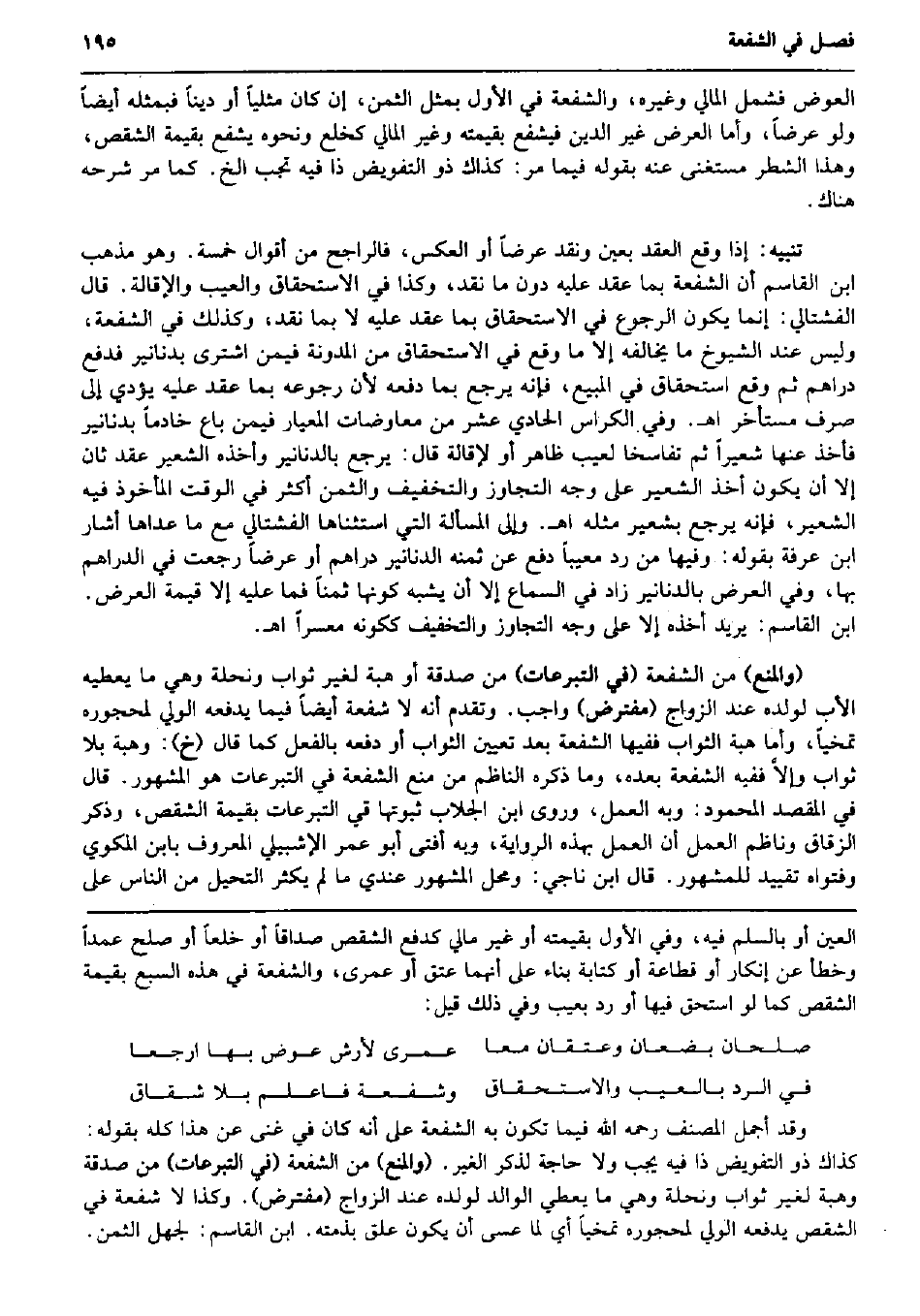 الْعِوَض فَشَمَلَ المالي وَغَيره، وَالشُّفْعَة فِي الأول بِمثل الثّمن، إِن كَانَ مثلِيا أَو دينا فبمثله أَيْضا وَلَو عرضا، وَأما الْعرض غير الدّين فَيشفع بِقِيمَتِه وَغير المالي كخلع وَنَحْوه يشفع بِقِيمَة الشّقص، وَهَذَا الشّطْر مُسْتَغْنى عَنهُ بقوله فِيمَا مر: كَذَاك ذُو التَّفْوِيض ذَا فِيهِ تجب الخ. كَمَا مر شَرحه هُنَاكَ. تَنْبِيه: إِذا وَقع العقد بِعَين وَنقد عرضا أَو الْعَكْس، فالراجح من أَقْوَال خَمْسَة. وَهُوَ مَذْهَب ابْن الْقَاسِم أَن الشُّفْعَة بِمَا عقد عَلَيْهِ دون مَا نقد، وَكَذَا فِي الِاسْتِحْقَاق وَالْعَيْب وَالْإِقَالَة. قَالَ الفشتالي: إِنَّمَا يكون الرُّجُوع فِي الِاسْتِحْقَاق بِمَا عقد عَلَيْهِ لَا بِمَا نقد، وَكَذَلِكَ فِي الشُّفْعَة، وَلَيْسَ عِنْد الشُّيُوخ مَا يُخَالِفهُ إِلَّا مَا وَقع فِي الِاسْتِحْقَاق من الْمُدَوَّنَة فِيمَن اشْترى بِدَنَانِير فَدفع دَرَاهِم ثمَّ وَقع اسْتِحْقَاق فِي الْمَبِيع، فَإِنَّهُ يرجع بِمَا دَفعه لِأَن رُجُوعه بِمَا عقد عَلَيْهِ يُؤَدِّي إِلَى صرف مستأخر اه. وَفِي الكراس الْحَادِي عشر من معاوضات المعيار فِيمَن بَاعَ خَادِمًا بِدَنَانِير فَأخذ عَنْهَا شَعِيرًا ثمَّ تفاسخا لعيب ظَاهر أَو لإقالة قَالَ: يرجع بِالدَّنَانِيرِ وَأَخذه الشّعير عقد ثَان إِلَّا أَن يكون أَخذ الشّعير على وَجه التجاوز وَالتَّخْفِيف وَالثمن أَكثر فِي الْوَقْت الْمَأْخُوذ فِيهِ الشّعير، فَإِنَّهُ يرجع بشعير مثله اه. وَإِلَى الْمَسْأَلَة الَّتِي استثناها الفشتالي مَعَ مَا عَداهَا أَشَارَ ابْن عَرَفَة بقوله: وفيهَا من رد معيبا دفع عَن ثمنه الدَّنَانِير دَرَاهِم أَو عرضا رجعت فِي الدَّرَاهِم بهَا، وَفِي الْعرض بِالدَّنَانِيرِ زَاد فِي السماع إِلَّا أَن يشبه كَونهَا ثمنا فَمَا عَلَيْهِ إِلَّا قيمَة الْعرض. ابْن الْقَاسِم: يُرِيد أَخذه إِلَّا على وَجه التجاوز وَالتَّخْفِيف كَكَوْنِهِ مُعسرا اه. (وَالْمَنْع) من الشُّفْعَة (فِي التَّبَرُّعَات) من صَدَقَة أَو هبة لغير ثَوَاب ونحلة وَهِي مَا يُعْطِيهِ الْأَب لوَلَده عِنْد الزواج (مفترض) وَاجِب. وَتقدم أَنه لَا شُفْعَة أَيْضا فِيمَا يَدْفَعهُ الْوَلِيّ لمحجوره تمخياً، وَأما هبة الثَّوَاب فَفِيهَا الشُّفْعَة بعد تعْيين الثَّوَاب أَو دَفعه بِالْفِعْلِ كَمَا قَالَ (خَ) : وَهبة بِلَا ثَوَاب وإلاَّ فَفِيهِ الشُّفْعَة بعده، وَمَا ذكره النَّاظِم من منع الشُّفْعَة فِي التَّبَرُّعَات هُوَ الْمَشْهُور. قَالَ فِي الْمَقْصد الْمَحْمُود: وَبِه الْعَمَل، وروى ابْن الْجلاب ثُبُوتهَا قي التَّبَرُّعَات بِقِيمَة الشّقص، وَذكر الزقاق وناظم الْعَمَل أَن الْعَمَل بِهَذِهِ الرِّوَايَة، وَبِه أفتى أَبُو عمر الإشبيلي الْمَعْرُوف بِابْن المكوي وفتواه تَقْيِيد للمشهور. قَالَ ابْن نَاجِي: وَمحل الْمَشْهُور عِنْدِي مَا لم يكثر التحيل من النَّاس على
