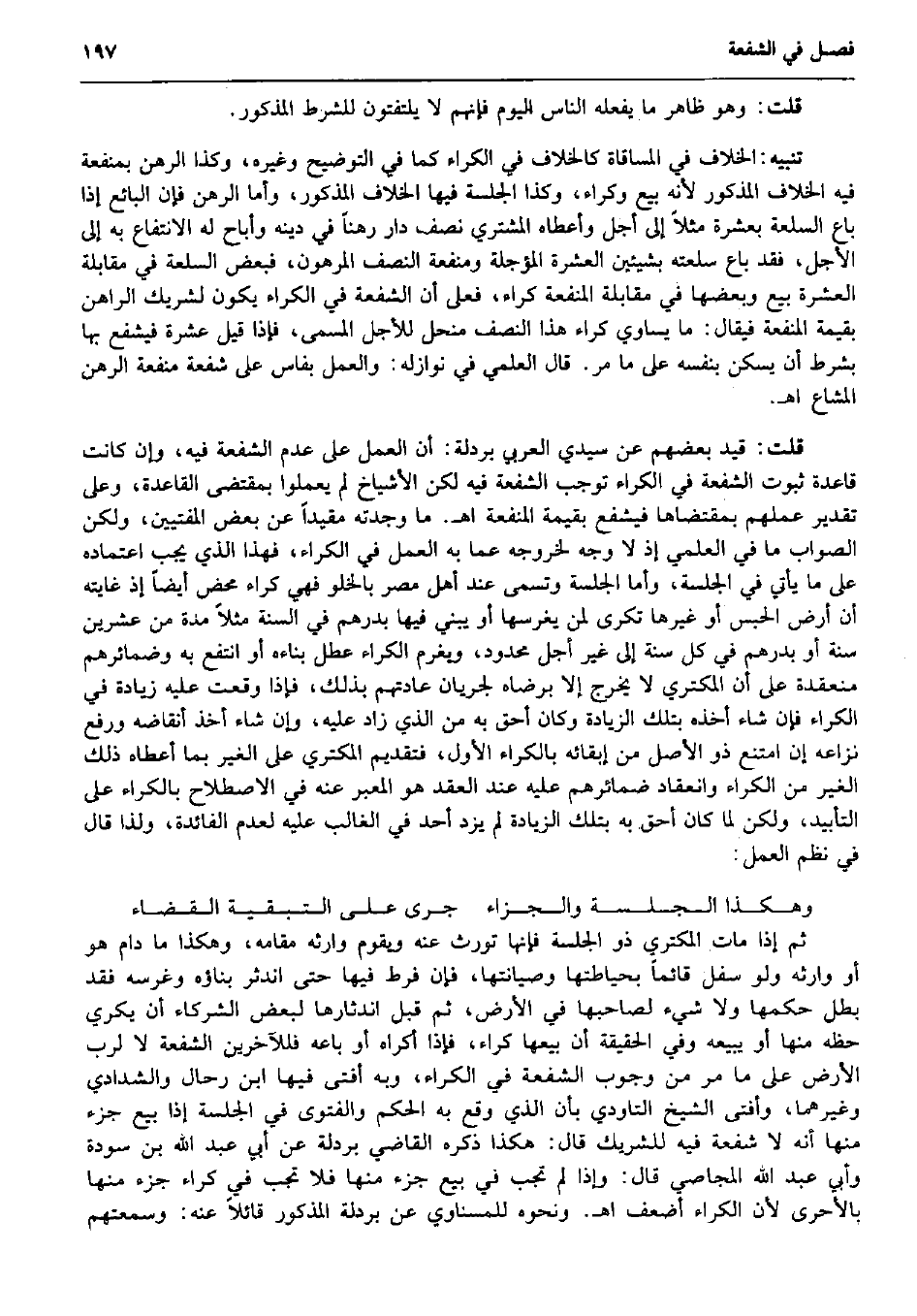 قلت: وَهُوَ ظَاهر مَا يَفْعَله النَّاس الْيَوْم فَإِنَّهُم لَا يلتفتون للشّرط الْمَذْكُور. تَنْبِيه: الْخلاف فِي الْمُسَاقَاة كالخلاف فِي الْكِرَاء كَمَا فِي التَّوْضِيح وَغَيره، وَكَذَا الرَّهْن بِمَنْفَعَة فِيهِ الْخلاف الْمَذْكُور لِأَنَّهُ بيع وكراء، وَكَذَا الجلسة فِيهَا الْخلاف الْمَذْكُور، وَأما الرَّهْن فَإِن البَائِع إِذا بَاعَ السّلْعَة بِعشْرَة مثلا إِلَى أجل وَأَعْطَاهُ المُشْتَرِي نصف دَار رهنا فِي دينه وأباح لَهُ الِانْتِفَاع بِهِ إِلَى الْأَجَل، فقد بَاعَ سلْعَته بشيئين الْعشْرَة المؤجلة وَمَنْفَعَة النّصْف الْمَرْهُون، فبعض السّلْعَة فِي مُقَابلَة الْعشْرَة بيع وَبَعضهَا فِي مُقَابلَة الْمَنْفَعَة كِرَاء، فعلى أَن الشُّفْعَة فِي الْكِرَاء يكون لِشَرِيك الرَّاهِن بِقِيمَة الْمَنْفَعَة فَيُقَال: مَا يُسَاوِي كِرَاء هَذَا النّصْف منحل للأجل الْمُسَمّى، فَإِذا قيل عشرَة فَيشفع بهَا بِشَرْط أَن يسكن بِنَفسِهِ على مَا مر. قَالَ العلمي فِي نوازله: وَالْعَمَل بفاس على شُفْعَة مَنْفَعَة الرَّهْن الْمشَاع اه. قلت: قيد بَعضهم عَن سَيِّدي الْعَرَبِيّ بردلة: أَن الْعَمَل على عدم الشُّفْعَة فِيهِ، وَإِن كَانَت قَاعِدَة ثُبُوت الشُّفْعَة فِي الْكِرَاء توجب الشُّفْعَة فِيهِ لَكِن الْأَشْيَاخ لم يعملوا بِمُقْتَضى الْقَاعِدَة وعَلى تَقْدِير عَمَلهم بمقتضاها فَيشفع بِقِيمَة الْمَنْفَعَة اه. مَا وجدته مُقَيّدا عَن بعض المفتيين، وَلَكِن الصَّوَاب مَا فِي العلمي إِذْ لَا وَجه لِخُرُوجِهِ عَمَّا بِهِ الْعَمَل فِي الْكِرَاء، فَهَذَا الَّذِي يجب اعْتِمَاده على مَا يَأْتِي فِي الجلسة، وَأما الجلسة وَتسَمى عِنْد أهل مصر بالخلو فَهِيَ كِرَاء مَحْض أَيْضا إِذْ غَايَته أَن أَرض الْحَبْس أَو غَيرهَا تكرى لمن يغرسها أَو يَبْنِي فِيهَا بدرهم فِي السّنة مثلا مُدَّة من عشْرين سنة أَو بدرهم فِي كل سنة إِلَى غير أجل مَحْدُود، وَيغرم الْكِرَاء عطل بناءه أَو انْتفع بِهِ وضمائرهم منعقدة على أَن الْمُكْتَرِي لَا يخرج إِلَّا بِرِضَاهُ لجَرَيَان عَادَتهم بذلك، فَإِذا وَقعت عَلَيْهِ زِيَادَة فِي الْكِرَاء فَإِن شَاءَ أَخذه بِتِلْكَ الزِّيَادَة وَكَانَ أَحَق بِهِ من الَّذِي زَاد عَلَيْهِ، وَإِن شَاءَ أَخذ أنقاضه وَرفع نزاعه إِن امْتنع ذُو الأَصْل من إبقائه بالكراء الأول، فتقديم الْمُكْتَرِي على الْغَيْر بِمَا أعطَاهُ ذَلِك الْغَيْر من الْكِرَاء وانعقاد ضمائرهم عَلَيْهِ عِنْد العقد هُوَ الْمعبر عَنهُ فِي الِاصْطِلَاح بالكراء على التَّأْبِيد، وَلَكِن لما كَانَ أَحَق بِهِ بِتِلْكَ الزِّيَادَة لم يزدْ أحد فِي الْغَالِب عَلَيْهِ لعدم الْفَائِدَة، وَلذَا قَالَ فِي نظم الْعَمَل: