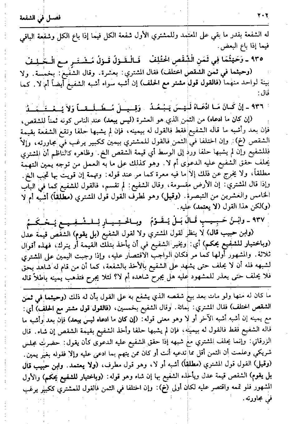 لَهُ الشُّفْعَة بِقدر مَا بَقِي على الْمُعْتَمد وَللْمُشْتَرِي الأول شُفْعَة الْكل فِيمَا إِذا بَاعَ الْكل وشفعة الْبَاقِي فِيمَا إِذا بَاعَ الْبَعْض. وَحَيْثُمَا فِي ثَمَنِ الْشَّقْصِ اخْتُلِفْ فَالْقَوْلُ قَوْلُ مُشْتَرٍ مَعَ الْحَلِفْ (وحيثما فِي ثمن الشّقص اخْتلف) فَقَالَ المُشْتَرِي: بِعشْرَة. وَقَالَ الشَّفِيع: بِخَمْسَة. وَلَا بَيِّنَة لوَاحِد مِنْهُمَا (فَالْقَوْل قَول مُشْتَر مَعَ الْحلف) إِن أشبه سَوَاء أشبه الشَّفِيع أَيْضا أم لَا. كَمَا قَالَ: إنْ كَانَ مَا ادَّعَاهُ لَيْسَ يَبْعُدُ وَقِيلَ مُطَلَقاً وَلاَ يُعْتَمَدُ (إِن كَانَ مَا ادَّعَاهُ) من الثّمن الَّذِي هُوَ الْعشْرَة (لَيْسَ يبعد) عِنْد النَّاس كَونه ثمنا للشقص فَإِن بعد وأشبه مَا قَالَه الشَّفِيع فَقَط فَالْقَوْل لَهُ بِيَمِينِهِ، فَإِن لم يشبها حلفا وَتَقَع الشُّفْعَة بِقِيمَة الشّقص (خَ) : وَإِن اخْتلفَا فِي الثّمن فَالْقَوْل للْمُشْتَرِي بِيَمِين ككبير يرغب فِي مجاورته، وإلاَّ فَللشَّفِيع وَإِن لم يشبها حلفا ورد إِلَى الْوسط أَي قيمَة الشّقص الخ. وَظَاهره كالناظم أَن المُشْتَرِي يحلف حقق الشَّفِيع عَلَيْهِ الدَّعْوَى أم لَا. وَهُوَ كَذَلِك على مَا بِهِ الْعَمَل من توجه يَمِين التُّهْمَة مُطلقًا، وَلَا يخرج عَن ذَلِك إِلَّا مَا فِيهِ معرة كَمَا مر عِنْد قَوْله: وتهمة إِن قويت بهَا تجب الخ. وَإِذا قَالَ المُشْتَرِي: إِن الأَرْض مقسومة، وَقَالَ الشَّفِيع: لم تقسم، فَالْقَوْل للشَّفِيع كَمَا فِي الْبَاب الْخَامِس وَالْعِشْرين من التَّبْصِرَة. (وَقيل) وَهُوَ لمطرف القَوْل قَول المُشْتَرِي (مُطلقًا) أشبه أم لَا (و) لَكِن هَذَا القَوْل (لَا يعْتَمد) عَلَيْهِ. وابْنُ حَبِيبٍ قَالَ بَلْ يُقَوِّمُ وباخْتِيارٍ لِلشَّفِيعِ يُحْكَمُ (وَابْن حبيب قَالَ) لَا ينظر لقَوْل المُشْتَرِي وَلَا لقَوْل الشَّفِيع (بل يقوم) الشّقص قيمَة عدل (وباختيار للشَّفِيع يحكم) أَي: وَيُخَير الشَّفِيع فِي أَن يَأْخُذ بِتِلْكَ الْقيمَة أَو يتْرك، فَهَذِهِ أَقْوَال ثَلَاثَة. وَالْمَشْهُور أَولهَا كَمَا مر فَكَانَ الْوَاجِب الِاقْتِصَار عَلَيْهِ، وَإِذا وَجَبت الْيَمين على المُشْتَرِي لشبهه فَلهُ أَن لَا يحلف حَتَّى يشْهد على الشَّفِيع بِالْأَخْذِ بِالشُّفْعَة، كَمَا أَن من قَامَ لَهُ شَاهد بِحَق فَلَا يحلف حَتَّى يعْذر للْمَشْهُود عَلَيْهِ هَل يجرح شَاهده أم لَا؟ لِئَلَّا يجرح فتذهب يَمِينه بَاطِلا قَالَه