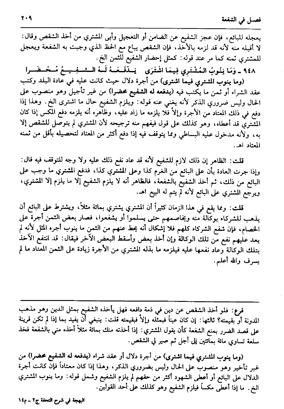 يعجله للْبَائِع، فَإِن عجز الشَّفِيع عَن الضَّامِن أَو التَّعْجِيل وأبى المُشْتَرِي من أَخذ الشّقص وَقَالَ: لَا أقبله مِنْهُ لِأَنَّهُ قد لزمَه بِالْأَخْذِ، فَإِن الشّقص يُبَاع مَعَ الْحَظ الَّذِي وَجَبت بِهِ الشُّفْعَة ويعجل للْمُشْتَرِي ثمنه كَمَا مر عِنْد قَوْله: كَمثل إِحْضَار الشَّفِيع للثّمن الخ. وَمَا يَنُوبُ المُشْتَرِي فِيمَا اشْتَرَى يَدْفَعَهُ لَهُ الشفِيعُ مُحْضَرا (وَمَا يَنُوب المُشْتَرِي فِيمَا اشْترى) من أُجْرَة دلال حَيْثُ كَانَت عَلَيْهِ فِي عَادَة الْبَلَد وَكتب عقد الشِّرَاء أَو ثمن مَا يكْتب فِيهِ (يَدْفَعهُ لَهُ الشَّفِيع محضرا) من غير تَأْجِيل وَهُوَ مَنْصُوب على الْحَال وَلَيْسَ ضَرُورِيّ الذّكر لِأَنَّهُ يُغني عَنهُ قَوْله: وَيلْزم الشَّفِيع حَال مَا اشْترى الخ. وَهَذَا إِذا دفع فِي ذَلِك الْمُعْتَاد من الْأُجْرَة وإلاَّ فَلَا يلْزمه مَا زَاد عَلَيْهِ، وَظَاهره أَنه يلْزمه دفع المكس إِذا كَانَ المُشْتَرِي قد أعطَاهُ، وَهُوَ كَذَلِك على قَول فيفهم مِنْهُ تَرْجِيحه لِأَن المُشْتَرِي لم يتَوَصَّل للشقص إِلَّا بِهِ، وَلِأَنَّهُ مَدْخُول عَلَيْهِ الْبِسَاطِيّ وَمِمَّا يتَوَقَّف فِيهِ إِذا دفع أَكثر من الْمُعْتَاد لتحصيله بِأَقَلّ من ثمنه الْمُعْتَاد اه. قلت: الظَّاهِر إِن ذَلِك لَازم للشَّفِيع لِأَنَّهُ قد عَاد نفع ذَلِك عَلَيْهِ وَلَا وَجه للتوقف فِيهِ قَالَ: وَإِذا جرت الْعَادة بِأَن على البَائِع من الْغرم كَذَا وعَلى المُشْتَرِي كَذَا، فَدفع المُشْتَرِي مَا وَجب على البَائِع من ذَلِك، ثمَّ أَخذ الشَّفِيع بِالشُّفْعَة، فَالظَّاهِر أَنه لَا يلْزم الشَّفِيع إِلَّا مَا يلْزم إِلَّا المُشْتَرِي، وَيرجع المُشْتَرِي على البَائِع لِأَنَّهُ لم يتم لَهُ البيع اه. قلت: وَمِمَّا يَقع فِي هَذَا الزَّمَان كثيرا أَن المُشْتَرِي يَشْتَرِي بِمِائَة مثلا، وَيشْتَرط على البَائِع أَن يذهب للشركاء بوكالة مِنْهُ ويخاصمهم حَتَّى يسلمُوا أَو يشفعوا، فَصَارَ بعض الثّمن أُجْرَة على الْخِصَام، فَإِن شفع الشُّرَكَاء كلهم فَلَا إِشْكَال أَنه يحط عَنْهُم من الثّمن مَا يَنُوب أجره الْمثل لِأَنَّهُ لم يعد عَلَيْهِم نفع من تِلْكَ الْوكَالَة وَإِن أَخذ بعض وَأسْقط الْبَعْض الآخر فَيُقَال: قد انْتفع الْآخِذ بِتِلْكَ الْوكَالَة وَعَاد نَفعهَا عَلَيْهِ فَيلْزمهُ مَا بذله المُشْتَرِي من الْأُجْرَة زِيَادَة على الثّمن الْمُعْتَاد مَا لم يسرف وَالله أعلم.