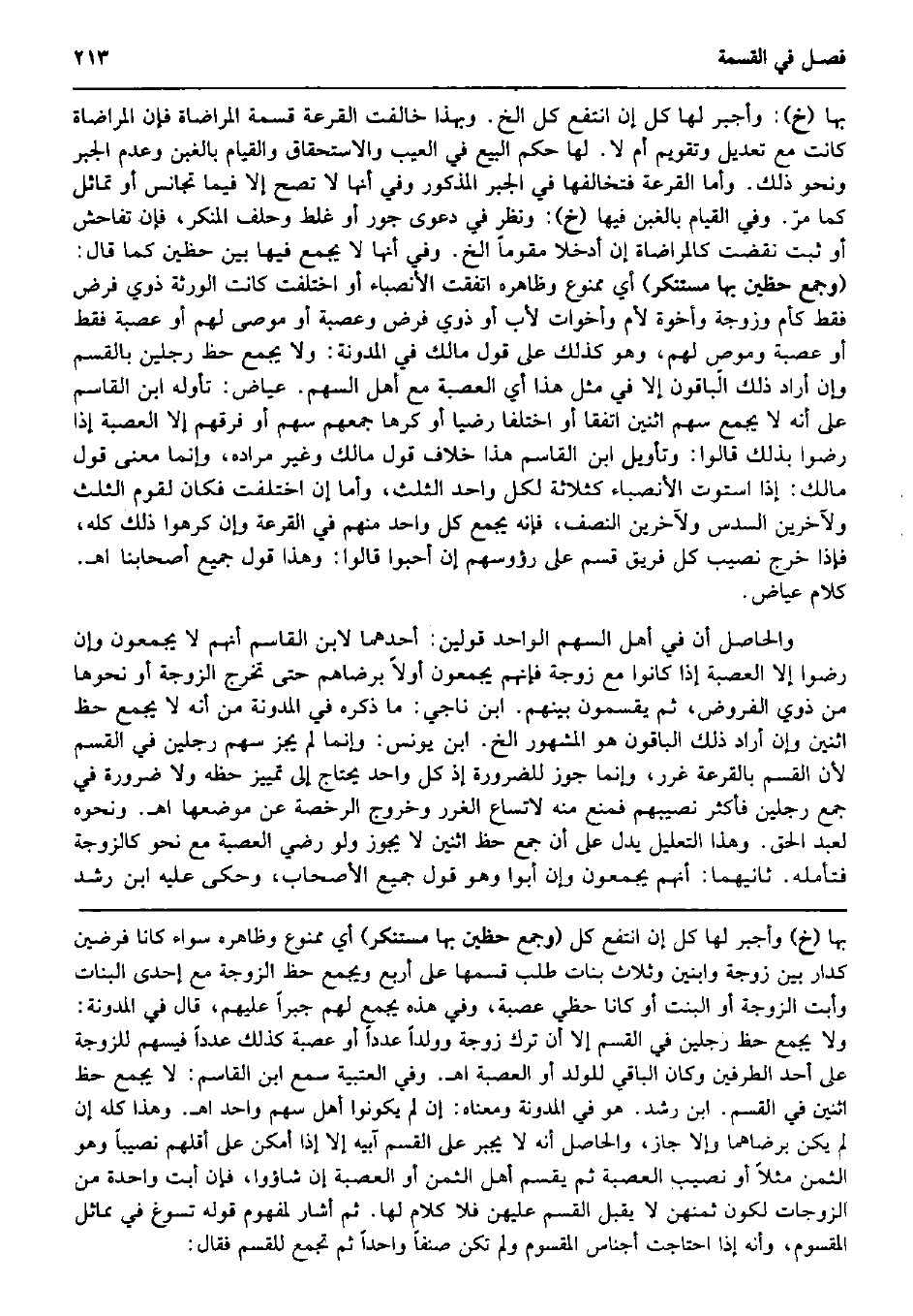 بهَا (خَ) : وأجبر لَهَا كل إِن انْتفع كل الخ. وَبِهَذَا خَالَفت الْقرعَة قسْمَة المراضاة فَإِن المراضاة كَانَت مَعَ تَعْدِيل وتقويم أم لَا. لَهَا حكم البيع فِي الْعَيْب والاستحقاق وَالْقِيَام بِالْغبنِ وَعدم الْجَبْر وَنَحْو ذَلِك. وَأما الْقرعَة فتخالفها فِي الْجَبْر الْمَذْكُور وَفِي أَنَّهَا لَا تصح إِلَّا فِيمَا تجانس أَو تماثل كَمَا مرّ. وَفِي الْقيام بِالْغبنِ فِيهَا (خَ) : وَنظر فِي دَعْوَى جور أَو غلط وَحلف الْمُنكر، فَإِن تفاحش أَو ثَبت نقضت كالمراضاة إِن أدخلا مُقَومًا الخ. وَفِي أَنَّهَا لَا يجمع فِيهَا بَين حظين كَمَا قَالَ: (وَجمع حظين بهَا مستنكر) أَي مَمْنُوع وَظَاهره اتّفقت الْأَنْصِبَاء أَو اخْتلفت كَانَت الْوَرَثَة ذَوي فرض فَقَط كَأُمّ وَزَوْجَة وأخوة لأم وأخوات لأَب أَو ذَوي فرض وعصبة أَو موصى لَهُم أَو عصبَة فَقَط أَو عصبَة وموصٍ لَهُم، وَهُوَ كَذَلِك على قَول مَالك فِي الْمُدَوَّنَة: وَلَا يجمع حَظّ رجلَيْنِ بالقسم وَإِن أَرَادَ ذَلِك الْبَاقُونَ إِلَّا فِي مثل هَذَا أَي الْعصبَة مَعَ أهل السهْم. عِيَاض: تَأَوَّلَه ابْن الْقَاسِم على أَنه لَا يجمع سهم اثْنَيْنِ اتفقَا أَو اخْتلفَا رَضِيا أَو كرها جمعهم سهم أَو فرقهم إِلَّا الْعصبَة إِذا رَضوا بذلك قَالُوا: وَتَأْويل ابْن الْقَاسِم هَذَا خلاف قَول مَالك وَغير مُرَاده، وَإِنَّمَا معنى قَول مَالك: إِذا اسْتَوَت الْأَنْصِبَاء كثلاثة لكل وَاحِد الثُّلُث، وَأما إِن اخْتلفت فَكَانَ لقوم الثُّلُث ولآخرين السُّدس ولآخرين النّصْف، فَإِنَّهُ يجمع كل وَاحِد مِنْهُم فِي الْقرعَة وَإِن كَرهُوا ذَلِك كُله، فَإِذا خرج نصيب كل فريق قسم على رؤوسهم إِن أَحبُّوا قَالُوا: وَهَذَا قَول جَمِيع أَصْحَابنَا اه. كَلَام عِيَاض. وَالْحَاصِل أَن فِي أهل السهْم الْوَاحِد قَوْلَيْنِ: أَحدهمَا لِابْنِ الْقَاسِم أَنهم لَا يجمعُونَ وَإِن رَضوا إِلَّا الْعصبَة إِذا كَانُوا مَعَ زَوْجَة فَإِنَّهُم يجمعُونَ أَولا برضاهم حَتَّى تخرج الزَّوْجَة أَو نَحْوهَا من ذَوي الْفُرُوض، ثمَّ يقسمون بَينهم. ابْن نَاجِي: مَا ذكره فِي الْمُدَوَّنَة من أَنه لَا يجمع حَظّ اثْنَيْنِ وَإِن أَرَادَ ذَلِك الْبَاقُونَ هُوَ الْمَشْهُور الخ. ابْن يُونُس: وَإِنَّمَا لم يجز سهم رجلَيْنِ فِي الْقسم لِأَن الْقسم بِالْقُرْعَةِ غرر، وَإِنَّمَا جوز للضَّرُورَة إِذْ كل وَاحِد يحْتَاج إِلَى تَمْيِيز حَظه وَلَا ضَرُورَة فِي جمع رجلَيْنِ فَأكْثر نصِيبهم فَمنع مِنْهُ لاتساع الْغرَر وَخُرُوج الرُّخْصَة عَن موضعهَا اه. وَنَحْوه لعبد الْحق. وَهَذَا التَّعْلِيل يدل على أَن جمع حَظّ اثْنَيْنِ لَا يجوز وَلَو رَضِي الْعصبَة مَعَ نَحْو كَالزَّوْجَةِ فَتَأَمّله. ثَانِيهمَا: أَنهم يجمعُونَ وَإِن أَبَوا وَهُوَ قَول جَمِيع الْأَصْحَاب، وَحكى عَلَيْهِ ابْن رشد