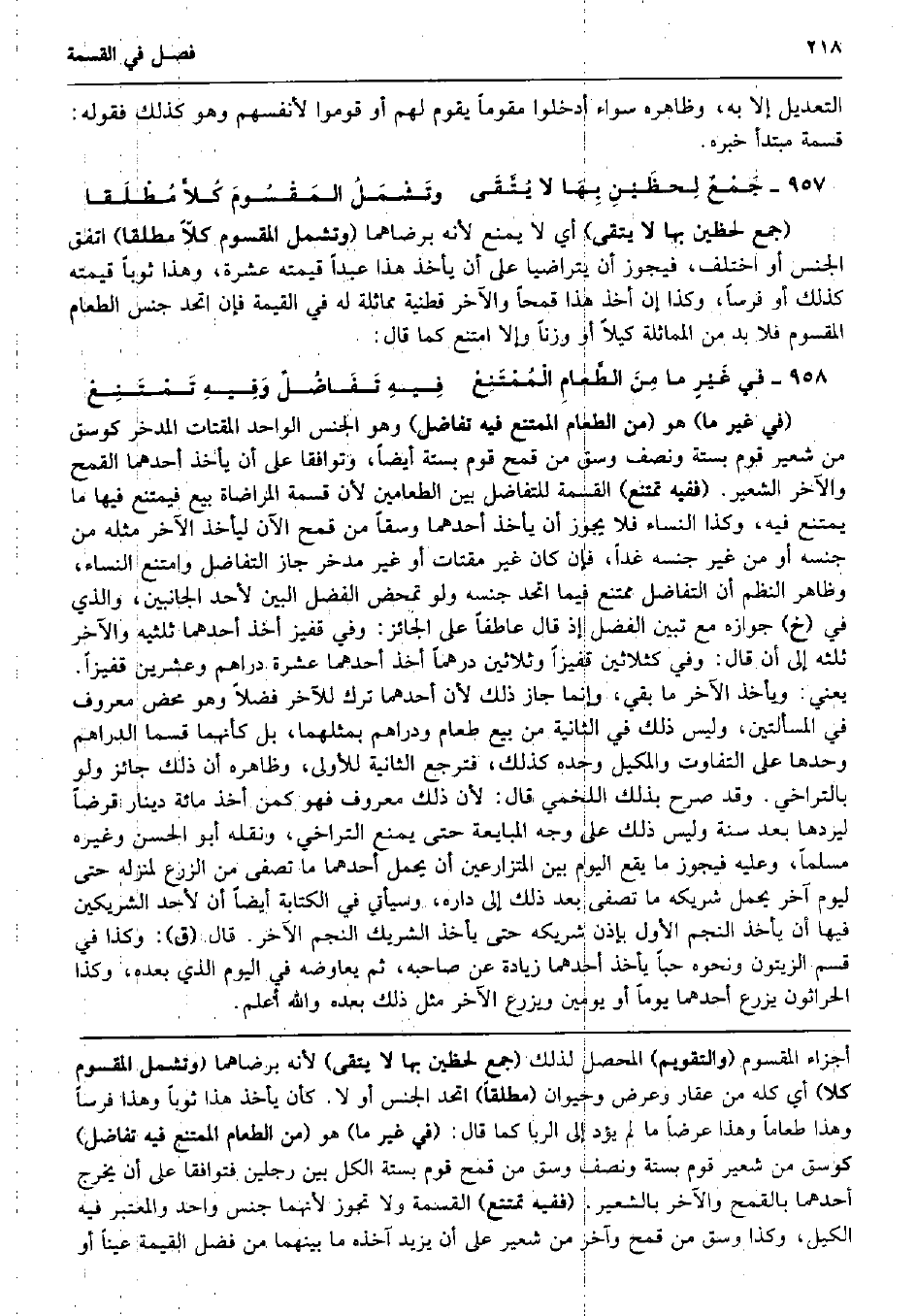 التَّعْدِيل إِلَّا بِهِ، وَظَاهره سَوَاء أدخلُوا مُقَومًا يقوم لَهُم أَو قومُوا لأَنْفُسِهِمْ وَهُوَ كَذَلِك فَقَوله: قسْمَة مُبْتَدأ خَبره. جَمْعٌ لِحظَيْنِ بِهَا لَا يُتَّقَى وتَشْمَلُ المَقْسُومَ كُلاًّ مُطْلَقا (جمع لحظين بهَا لَا يتقى) أَي لَا يمْنَع لِأَنَّهُ برضاهما (وتشمل الْمَقْسُوم كلا مُطلقًا) اتّفق الْجِنْس أَو اخْتلف، فَيجوز أَن يتراضيا على أَن يَأْخُذ هَذَا عبدا قِيمَته عشرَة، وَهَذَا ثوبا قِيمَته كَذَلِك أَو فرسا، وَكَذَا إِن أَخذ هَذَا قمحاً وَالْآخر قطنية مماثلة لَهُ فِي الْقيمَة فَإِن اتَّحد جنس الطَّعَام الْمَقْسُوم فَلَا بُد من الْمُمَاثلَة كَيْلا أَو وزنا وَإِلَّا امْتنع كَمَا قَالَ: فِي غَيْرٍ مَا مِنَ الطَّعامِ الْمُمْتَنِعْ فِيهِ تَفَاضُلٌ وَفِيهِ تَمْتَنِعْ (فِي غير مَا) هُوَ (من الطَّعَام الْمُمْتَنع فِيهِ تفاضل) وَهُوَ الْجِنْس الْوَاحِد المقتات المدخر كوسق من شعير قوم بِسِتَّة وَنصف وسق من قَمح قوم بِسِتَّة أَيْضا، وتوافقا على أَن يَأْخُذ أَحدهمَا الْقَمْح وَالْآخر الشّعير. (فَفِيهِ تمْتَنع) الْقِسْمَة للتفاضل بَين الطعامين لِأَن قسْمَة المراضاة بيع فَيمْتَنع فِيهَا مَا يمْتَنع فِيهِ، وَكَذَا النِّسَاء فَلَا يجوز أَن يَأْخُذ أَحدهمَا وسْقا من قَمح الْآن ليَأْخُذ الآخر مثله من جنسه أَو من غير جنسه غَدا، فَإِن كَانَ غير مقتات أَو غير مدخر جَازَ التَّفَاضُل وَامْتنع النِّسَاء، وَظَاهر النّظم أَن التَّفَاضُل مُمْتَنع فِيمَا اتَّحد جنسه وَلَو تمحض الْفضل الْبَين لأحد الْجَانِبَيْنِ، وَالَّذِي فِي (خَ) جَوَازه مَعَ تبين الْفضل إِذْ قَالَ عاطفاً على الْجَائِز: وَفِي قفيز أَخذ أَحدهمَا ثُلثَيْهِ وَالْآخر ثلثه إِلَى أَن قَالَ: وَفِي كثلاثين قَفِيزا وَثَلَاثِينَ درهما أَخذ أَحدهمَا عشرَة دَرَاهِم وَعشْرين قَفِيزا. يَعْنِي: وَيَأْخُذ الآخر مَا بَقِي، وَإِنَّمَا جَازَ ذَلِك لِأَن أَحدهمَا ترك للْآخر فضلا وَهُوَ مَحْض مَعْرُوف فِي الْمَسْأَلَتَيْنِ، وَلَيْسَ ذَلِك فِي الثَّانِيَة من بيع طَعَام ودراهم بمثلهما، بل كَأَنَّهُمَا قسما الدَّرَاهِم وَحدهَا على التَّفَاوُت والمكيل وَحده كَذَلِك، فترجع الثَّانِيَة للأولى، وَظَاهره أَن ذَلِك جَائِز وَلَو بالتراخي. وَقد صرح بذلك اللَّخْمِيّ قَالَ: لِأَن ذَلِك مَعْرُوف فَهُوَ كمن أَخذ مائَة دِينَار قرضا ليردها بعد سنة وَلَيْسَ ذَلِك على وَجه الْمُبَايعَة حَتَّى يمْنَع التَّرَاخِي، وَنَقله أَبُو الْحسن وَغَيره مُسلما، وَعَلِيهِ فَيجوز مَا يَقع الْيَوْم بَين المتزارعين أَن يحمل أَحدهمَا مَا تصفى من الزَّرْع لمنزله حَتَّى ليَوْم آخر يحمل شَرِيكه مَا تصفى بعد ذَلِك إِلَى دَاره، وَسَيَأْتِي فِي الْكِتَابَة أَيْضا أَن لأحد الشَّرِيكَيْنِ فِيهَا أَن يَأْخُذ النَّجْم الأول بِإِذن شَرِيكه حَتَّى يَأْخُذ الشَّرِيك النَّجْم الآخر. قَالَ (ق) : وَكَذَا فِي قسم الزَّيْتُون وَنَحْوه حبا يَأْخُذ أَحدهمَا زِيَادَة عَن صَاحبه، ثمَّ يعاوضه فِي الْيَوْم الَّذِي بعده، وَكَذَا الحراثون يزرع أَحدهمَا يَوْمًا أَو يَوْمَيْنِ ويزرع الآخر مثل ذَلِك بعده وَالله أعلم.