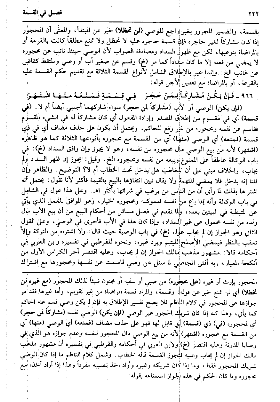 بقسمة، وَالضَّمِير الْمَجْرُور بِغَيْر رَاجع للْوَصِيّ (لن تحظلا) خبر عَن الْمُبْتَدَأ، وَالْمعْنَى أَن الْمَحْجُور إِذا كَانَ مشاركاً لغير حاجره فَإِن قسْمَة حاجره عَلَيْهِ لَا تحظل وَلَا تمنع مُطلقًا كَانَت بِالْقُرْعَةِ أَو بالمراضاة بنوعيها، لَكِن مَعَ ظُهُور السداد ومصادفة الصَّوَاب لِأَن الْوَصِيّ حِينَئِذٍ نَائِب عَن مَحْجُوره لَا يمْضِي من فعله إِلَّا مَا كَانَ سداداً كَمَا مر (خَ) وَقسم عَن صَغِير أَب أَو وَصِيّ وملتقط كقاض عَن غَائِب الخ. وَإِنَّمَا عبر بِالْإِطْلَاقِ الشَّامِل لأنواع الْقِسْمَة الثَّلَاثَة مَعَ تَقْدِيم حكم الْقِسْمَة عَلَيْهِ بِالْقُرْعَةِ، أَو بالمراضاة مَعَ تَعْدِيل لأجل قَوْله: فَإنْ يَكُنْ مُشَارِكَاً لِمَنْ حَجَرْ فِي قِسْمَةٍ فَمَنْعُهُ مِنْهَا اشْتَهَرْ (فَإِن يكن) الْوَصِيّ أَو الْأَب (مشاركاً لمن حجر) سَوَاء شاركهما أَجْنَبِي أَيْضا أم لَا. (فِي قسْمَة) أَي فِي مقسوم من إِطْلَاق الْمصدر وَإِرَادَة الْمَفْعُول أَي كَانَ مشاركاً لَهُ فِي الشَّيْء الْمَقْسُوم فقاسم عَن نَفسه ومحجوره من غير رفع للْحَاكِم، وَيحْتَمل أَن يكون على حذف مُضَاف أَي فِي ذِي قسْمَة (فَمَنعه) أَي الْوَصِيّ (مِنْهَا) أَي من الْقِسْمَة مَعَ مَحْجُوره بأنواعها الثَّلَاثَة كَمَا هُوَ ظَاهره (اشْتهر) لِأَنَّهُ من بيع الْوَصِيّ مَال مَحْجُوره من نَفسه، وَهُوَ لَا يجوز وَإِن وَافق السداد (خَ) : فِي بَاب الْوكَالَة عاطفاً على الْمَمْنُوع وَبيعه من نَفسه ومحجوره الخ. وَقيل: يجوز إِن ظهر السداد وَلم يُجَاب، وَالْخلاف مَبْنِيّ على أَن الْمُخَاطب هَل يدْخل تَحت الْخطاب أم لَا؟ التَّوْضِيح. وَالظَّاهِر وَإِن قُلْنَا إِنَّه يدْخل فَلَا يمْضِي للتُّهمَةِ وَلَا يُقَال تبين انتفاؤها بِالْبيعِ بِالْقيمَةِ فَأكْثر لأَنا نقُول: يحْتَمل أَنه اشْتَرَاهَا بذلك لما رأى أَن من النَّاس من يرغب فِي شِرَائهَا بِأَكْثَرَ اه. وعَلى هَذَا عول فِي الشَّامِل فِي بَاب الْوكَالَة وَأَنه إِذا بَاعَ من نَفسه فلموكله ومحجوره الْخِيَار، وَهُوَ الْمُوَافق للْعَمَل الَّذِي يَأْتِي عَن الْمُتَيْطِيَّة فِي الْبَيْتَيْنِ بعده، وَلما تقدم فِي فصل مسَائِل من أَحْكَام البيع من أَن بيع الْأَب مَال وَلَده من نَفسه مَحْمُول على غير السداد، وَإِذا كَانَ هَذَا فِي الْأَب فأحرى فِي الْوَصِيّ، وعَلى القَوْل الثَّانِي وَهُوَ الْجَوَاز إِن لم يُجَاب عول (خَ) فِي بَاب الْوَصِيَّة حَيْثُ قَالَ: وَلَا اشْتَرَاهُ من التَّرِكَة وإلاَّ تعقب بِالنّظرِ فيمضي الْأَصْلَح للْيَتِيم وَيرد غَيره وَنَحْوه للقرطبي فِي تَفْسِيره وَابْن الْعَرَبِيّ فِي أَحْكَامه قَالَا: مَشْهُور مَذْهَب مَالك الْجَوَاز إِن لم يحاب، وَعَلِيهِ اقْتصر آخر الكراس الأول من أنكحة المعيار، وَبِه أفتى المجاصي لما سُئِلَ عَن وَصِيّ قاسمت عَن نَفسهَا ومحجورها مَعَ اشْتِرَاك