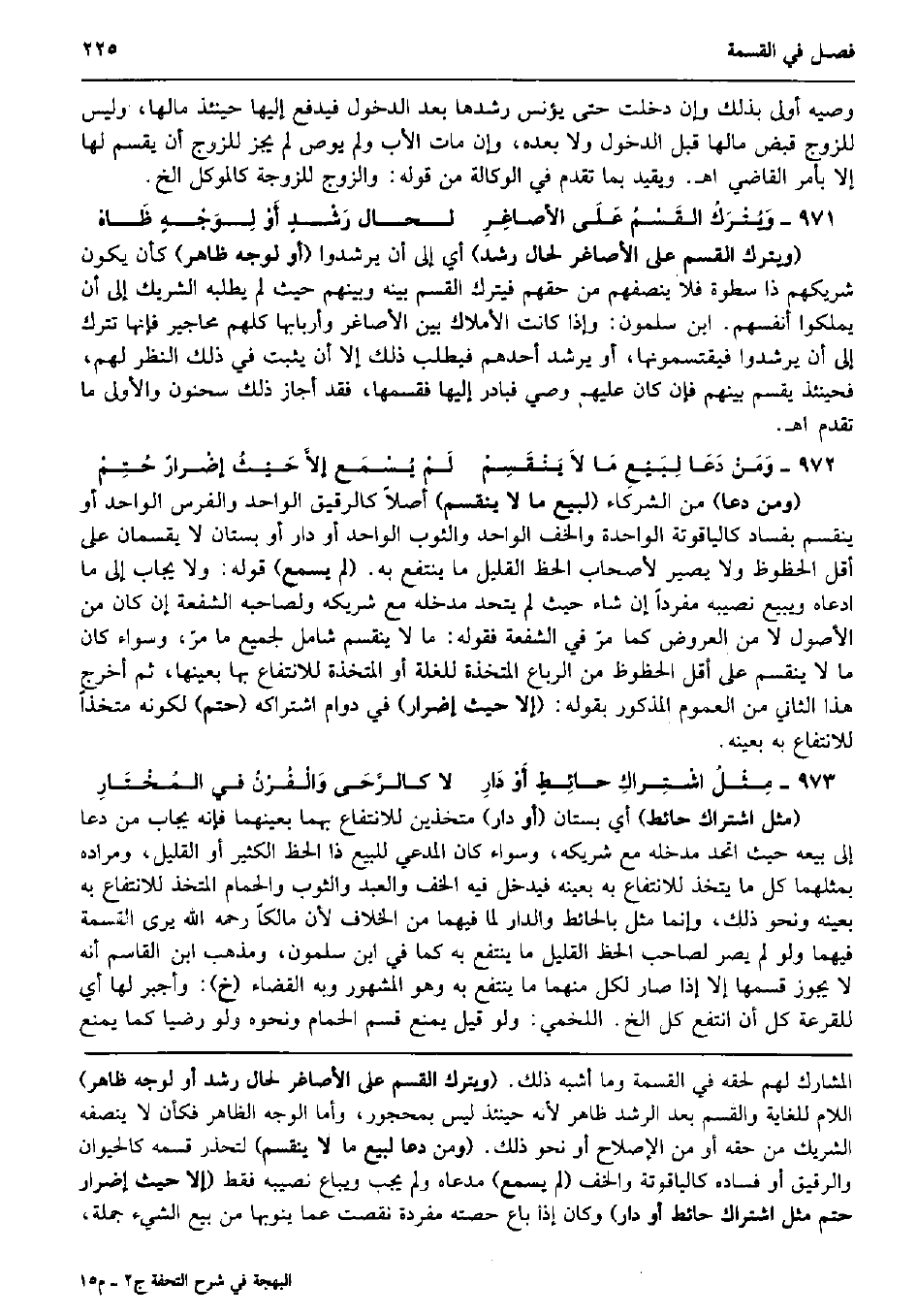 وَصِيّه أولى بذلك وَإِن دخلت حَتَّى يؤنس رشدها بعد الدُّخُول فَيدْفَع إِلَيْهَا حِينَئِذٍ مَالهَا، وَلَيْسَ للزَّوْج قبض مَالهَا قبل الدُّخُول وَلَا بعده، وَإِن مَاتَ الْأَب وَلم يوص لم يجز للزَّوْج أَن يقسم لَهَا إِلَّا بِأَمْر القَاضِي اه. ويقيد بِمَا تقدم فِي الْوكَالَة من قَوْله: وَالزَّوْج للزَّوْجَة كالموكل الخ. وَيُتْرَكُ القَسْمُ عَلَى الأصاغِرِ لحَال رَشْدٍ أَوْ لِوَجْهٍ ظَاهِ (وَيتْرك الْقسم على الأصاغر لحَال رشد) أَي إِلَى أَن يرشدوا (أَو لوجه ظَاهر) كَأَن يكون شريكهم ذَا سطوة فَلَا ينصفهم من حَقهم فَيتْرك الْقسم بَينه وَبينهمْ حَيْثُ لم يَطْلُبهُ الشَّرِيك إِلَى أَن يملكُوا أنفسهم. ابْن سَلمُون: وَإِذا كَانَت الْأَمْلَاك بَين الأصاغر وأربابها كلهم محاجير فَإِنَّهَا تتْرك إِلَى أَن يرشدوا فيقتسمونها، أَو يرشد أحدهم فيطلب ذَلِك إِلَّا أَن يثبت فِي ذَلِك النّظر لَهُم، فَحِينَئِذٍ يقسم بَينهم فَإِن كَانَ عَلَيْهِم وَصِيّ فبادر إِلَيْهَا فَقَسمهَا، فقد أجَاز ذَلِك سَحْنُون وَالْأولَى مَا تقدم اه. وَمَنْ دَعَا لِبَيْعِ مَا لاَ يَنْقَسِمْ لَمْ يُسْمَع إلاَّ حَيْثُ إضْرارٌ حُتِمْ (وَمن دَعَا) من الشُّرَكَاء (لبيع مَا لَا يَنْقَسِم) أصلا كالرقيق الْوَاحِد وَالْفرس الْوَاحِد أَو يَنْقَسِم بِفساد كالياقوتة الْوَاحِدَة والخف الْوَاحِد وَالثَّوْب الْوَاحِد أَو دَار أَو بُسْتَان لَا يقسمان على أقل الحظوظ وَلَا يصير لأَصْحَاب الْحَظ الْقَلِيل مَا ينْتَفع بِهِ. (لم يسمع) قَوْله: وَلَا يُجَاب إِلَى مَا ادَّعَاهُ وَيبِيع نصِيبه مُفردا إِن شَاءَ حَيْثُ لم يتحد مدخله مَعَ شَرِيكه ولصاحبه الشُّفْعَة إِن كَانَ من الْأُصُول لَا من الْعرُوض كَمَا مرّ فِي الشُّفْعَة فَقَوله: مَا لَا يَنْقَسِم شَامِل لجَمِيع مَا مرّ، وَسَوَاء كَانَ مَا لَا يَنْقَسِم على أقل الحظوظ من الرباع المتخذة للغلة أَو المتخذة للِانْتِفَاع بهَا بِعَينهَا، ثمَّ أخرج هَذَا الثَّانِي من الْعُمُوم الْمَذْكُور بقوله: (إِلَّا حَيْثُ إِضْرَار) فِي دوَام اشتراكه (حتم) لكَونه متخذاً للِانْتِفَاع بِهِ بِعَيْنِه. مِثْلُ اشْتِراكِ حائِطٍ أَوْ دَارِ لَا كالرَّحَى وَالْفُرْنُ فِي المُخْتَارِ (مثل اشْتِرَاك حَائِط) أَي بُسْتَان (أَو دَار) متخذين للِانْتِفَاع بهما بعينهما فَإِنَّهُ يُجَاب من دَعَا إِلَى بَيْعه حَيْثُ اتَّحد مدخله مَعَ شَرِيكه، وَسَوَاء كَانَ الْمُدَّعِي للْبيع ذَا الْحَظ الْكثير أَو الْقَلِيل، وَمرَاده بمثلهما كل مَا يتَّخذ للِانْتِفَاع بِهِ بِعَيْنِه فَيدْخل فِيهِ الْخُف وَالْعَبْد وَالثَّوْب وَالْحمام الْمُتَّخذ للِانْتِفَاع بِهِ بِعَيْنِه وَنَحْو ذَلِك، وَإِنَّمَا مثل بِالْحَائِطِ وَالدَّار لما فيهمَا من الْخلاف لِأَن مَالِكًا رَحمَه الله يرى الْقِسْمَة فيهمَا وَلَو لم يصر لصَاحب الْحَظ الْقَلِيل مَا ينْتَفع بِهِ كَمَا فِي ابْن سَلمُون، وَمذهب ابْن الْقَاسِم أَنه لَا يجوز قسمهَا إِلَّا إِذا صَار لكل مِنْهُمَا مَا ينْتَفع بِهِ وَهُوَ الْمَشْهُور وَبِه الْقَضَاء (خَ) : وأجبر لَهَا أَي للقرعة كل أَن انْتفع كل الخ. اللَّخْمِيّ: وَلَو قيل يمْنَع قسم الْحمام وَنَحْوه وَلَو رَضِيا كَمَا يمْنَع