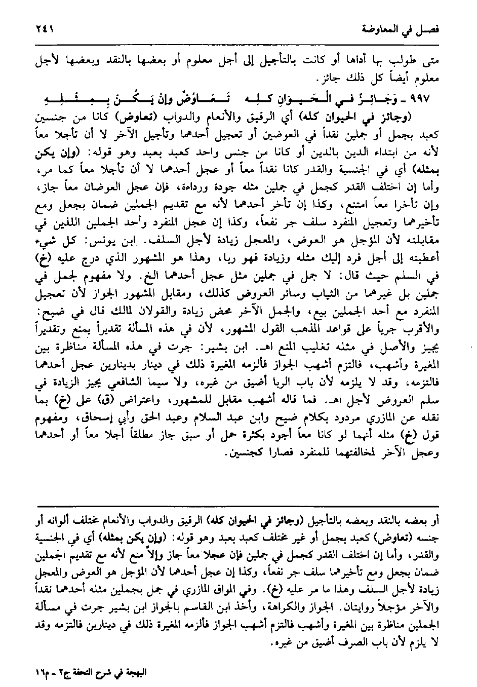 مَتى طُولِبَ بهَا أَدَّاهَا أَو كَانَت بالتأجيل إِلَى أجل مَعْلُوم أَو بَعْضهَا بِالنَّقْدِ وَبَعضهَا لأجل مَعْلُوم أَيْضا كل ذَلِك جَائِز. وَجَائِزٌ فِي الْحَيوَانِ كلِه تَعَاوُضٌ وإنْ يَكُنْ بِمِثْلِهِ (وَجَائِز فِي الْحَيَوَان كُله) أَي الرَّقِيق والأنعام وَالدَّوَاب (تعاوض) كَانَا من جِنْسَيْنِ كَعبد بجمل أَو جملين نَقْدا فِي الْعِوَضَيْنِ أَو تَعْجِيل أَحدهمَا وتأجيل الآخر لَا أَن تأجلا مَعًا لِأَنَّهُ من ابْتِدَاء الدّين بِالدّينِ أَو كَانَا من جنس وَاحِد كَعبد بِعَبْد وَهُوَ قَوْله: (وَإِن يكن بِمثلِهِ) أَي فِي الجنسية وَالْقدر كَانَا نَقْدا مَعًا أَو عجل أَحدهمَا لَا أَن تأجلا مَعًا كَمَا مر، وَأما إِن اخْتلف الْقدر كجمل فِي جملين مثله جودة ورداءة، فَإِن عجل العوضان مَعًا جَازَ، وَإِن تأخرا مَعًا امْتنع، وَكَذَا إِن تَأَخّر أَحدهمَا لِأَنَّهُ مَعَ تَقْدِيم الجملين ضَمَان بِجعْل وَمَعَ تأخيرهما وتعجيل الْمُنْفَرد سلف جر نفعا، وَكَذَا إِن عجل الْمُنْفَرد وَأحد الجملين اللَّذين فِي مُقَابلَته لِأَن الْمُؤَجل هُوَ الْعِوَض، والمعجل زِيَادَة لأجل السّلف. ابْن يُونُس: كل شَيْء أَعْطيته إِلَى أجل فَرد إِلَيْك مثله وَزِيَادَة فَهُوَ رَبًّا، وَهَذَا هُوَ الْمَشْهُور الَّذِي درج عَلَيْهِ (خَ) فِي السّلم حَيْثُ قَالَ: لَا جمل فِي جملين مثل عجل أَحدهمَا الخ. وَلَا مَفْهُوم لجمل فِي جملين بل غَيرهمَا من الثِّيَاب وَسَائِر الْعرُوض كَذَلِك، وَمُقَابل الْمَشْهُور الْجَوَاز لِأَن تَعْجِيل الْمُنْفَرد مَعَ أحد الجملين بيع، والجمل الآخر مَحْض زِيَادَة وَالْقَوْلَان لمَالِك قَالَ فِي ضيح: وَالْأَقْرَب جَريا على قَوَاعِد الْمَذْهَب القَوْل الْمَشْهُور، لِأَن فِي هَذِه الْمَسْأَلَة تَقْديرا يمْنَع وتقديراً يُجِيز وَالْأَصْل فِي مثله تَغْلِيب الْمَنْع اه. ابْن بشير: جرت فِي هَذِه الْمَسْأَلَة مناظرة بَين الْمُغيرَة وَأَشْهَب، فالتزم أَشهب الْجَوَاز فألزمه الْمُغيرَة ذَلِك فِي دِينَار بدينارين عجل أَحدهمَا فَالْتَزمهُ، وَقد لَا يلْزمه لِأَن بَاب الرِّبَا أضيق من غَيره، وَلَا سِيمَا الشَّافِعِي يُجِيز الزِّيَادَة فِي سلم الْعرُوض لأجل اه. فَمَا قَالَه أَشهب مُقَابل للمشهور، وَاعْتِرَاض (ق) على (خَ) بِمَا نَقله عَن الْمَازرِيّ مَرْدُود بِكَلَام ضيح وَابْن عبد السَّلَام وَعبد الْحق وَأبي إِسْحَاق، وَمَفْهُوم قَول (خَ) مثله أَنَّهُمَا لَو كَانَا مَعًا أَجود بِكَثْرَة حمل أَو سبق جَازَ مُطلقًا أَََجَلًا مَعًا أَو أَحدهمَا وَعجل الآخر لمخالفتهما للمنفرد فصارا كجنسين.