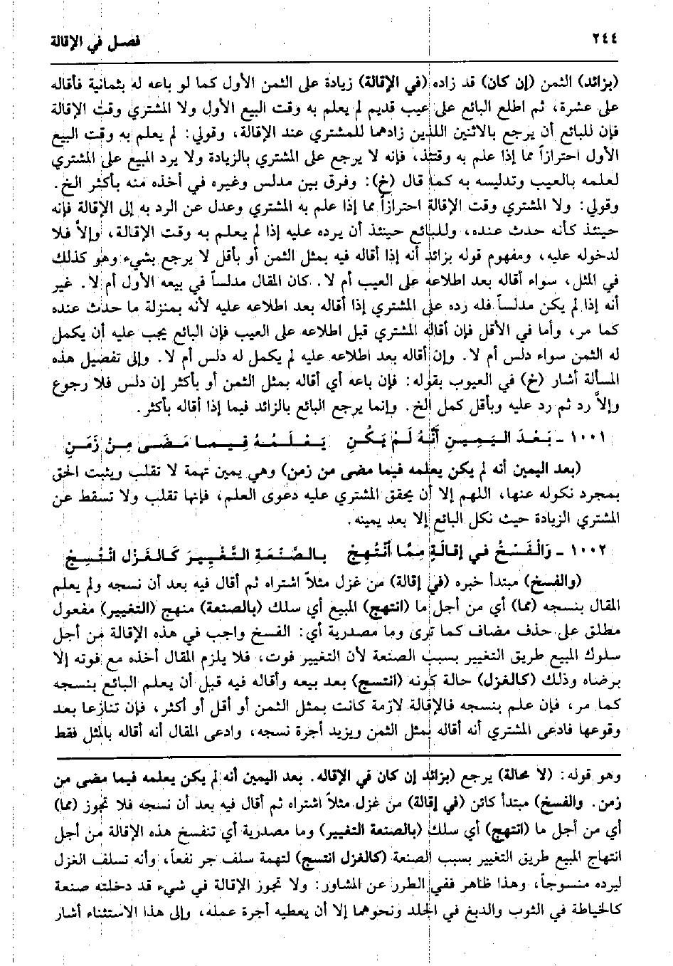 (بزائد) الثّمن (إِن كَانَ) قد زَاده (فِي الْإِقَالَة) زِيَادَة على الثّمن الأول كَمَا لَو بَاعه لَهُ بِثمَانِيَة فأقاله على عشرَة، ثمَّ اطلع البَائِع على عيب قديم لم يعلم بِهِ وَقت البيع الأول وَلَا المُشْتَرِي وَقت الْإِقَالَة فَإِن للْبَائِع أَن يرجع بالاثنين اللَّذين زادهما للْمُشْتَرِي عِنْد الْإِقَالَة، وَقَوْلِي: لم يعلم بِهِ وَقت البيع الأول احْتِرَازًا مِمَّا إِذا علم بِهِ وقتئذ، فَإِنَّهُ لَا يرجع على المُشْتَرِي بِالزِّيَادَةِ وَلَا يرد الْمَبِيع على المُشْتَرِي لعلمه بِالْعَيْبِ وتدليسه بِهِ كَمَا قَالَ (خَ) : وَفرق بَين مُدَلّس وَغَيره فِي أَخذه مِنْهُ بِأَكْثَرَ الخ. وَقَوْلِي: وَلَا المُشْتَرِي وَقت الْإِقَالَة احْتِرَازًا مِمَّا إِذا علم بِهِ المُشْتَرِي وَعدل عَن الرَّد بِهِ إِلَى الْإِقَالَة فَإِنَّهُ حِينَئِذٍ كَأَنَّهُ حدث عِنْده، وَللْبَائِع حِينَئِذٍ أَن يردهُ عَلَيْهِ إِذا لم يعلم بِهِ وَقت الْإِقَالَة، وإلاَّ فَلَا لدُخُوله عَلَيْهِ، وَمَفْهُوم قَوْله بزائد أَنه إِذا أقاله فِيهِ بِمثل الثّمن أَو بِأَقَلّ لَا يرجع بِشَيْء وَهُوَ كَذَلِك فِي الْمثل، سَوَاء أقاله بعد اطِّلَاعه على الْعَيْب أم لَا. كَانَ الْمقَال مدلساً فِي بَيْعه الأول أم لَا. غير أَنه إِذا لم يكن مدلساً فَلهُ رده على المُشْتَرِي إِذا أقاله بعد اطِّلَاعه عَلَيْهِ لِأَنَّهُ بِمَنْزِلَة مَا حدث عِنْده كَمَا مر، وَأما فِي الْأَقَل فَإِن أقاله المُشْتَرِي قبل اطِّلَاعه على الْعَيْب فَإِن البَائِع يجب عَلَيْهِ أَن يكمل لَهُ الثّمن سَوَاء دلّس أم لَا. وَإِن أقاله بعد اطِّلَاعه عَلَيْهِ لم يكمل لَهُ دلّس أم لَا. وَإِلَى تَفْصِيل هَذِه الْمَسْأَلَة أَشَارَ (خَ) فِي الْعُيُوب بقوله: فَإِن بَاعه أَي أقاله بِمثل الثّمن أَو بِأَكْثَرَ إِن دلّس فَلَا رُجُوع وإلاَّ رد ثمَّ رد عَلَيْهِ وبأقل كمل الخ. وَإِنَّمَا يرجع البَائِع بِالزَّائِدِ فِيمَا إِذا أقاله بِأَكْثَرَ. بَعْدَ اليَمِينِ أَنَّهُ لَمْ يَكُنِ يَعْلَمُهُ فِيما مَضَى مِنْ زَمَنِ (بعد الْيَمين أَنه لم يكن يُعلمهُ فِيمَا مضى من زمن) وَهِي يَمِين تُهْمَة لَا تقلب وَيثبت الْحق بِمُجَرَّد نُكُوله عَنْهَا، اللَّهُمَّ إِلَّا أَن يُحَقّق المُشْتَرِي عَلَيْهِ دَعْوَى الْعلم، فَإِنَّهَا تقلب وَلَا تسْقط عَن المُشْتَرِي الزِّيَادَة حَيْثُ نكل البَائِع إِلَّا بعد يَمِينه. وَالْفَسْخُ فِي إقالَةٍ مِمَّا انْتُهِجْ بالصَّنْعَةِ التَّغْيِيرَ كَالغَزْل انْتُسِجْ (وَالْفَسْخ) مُبْتَدأ خَبره (فِي إِقَالَة) من غزل مثلا اشْتَرَاهُ ثمَّ أقَال فِيهِ بعد أَن نسجه وَلم يعلم الْمقَال بنسجه (مِمَّا) أَي من أجل مَا (انتهج) الْمَبِيع أَي سلك (بالصنعة) مَنْهَج (التَّغْيِير) مفعول مُطلق على حذف مُضَاف كَمَا ترى وَمَا مَصْدَرِيَّة أَي: الْفَسْخ وَاجِب فِي هَذِه الْإِقَالَة من أجل سلوك الْمَبِيع طَرِيق التَّغْيِير بِسَبَب الصَّنْعَة لِأَن التَّغْيِير فَوت، فَلَا يلْزم الْمقَال أَخذه مَعَ فَوته إِلَّا بِرِضَاهُ وَذَلِكَ (كالغزل) حَالَة كَونه (انتسج) بعد بَيْعه وأقاله فِيهِ قبل أَن يعلم البَائِع بنسجه كَمَا مر، فَإِن علم بنسجه فالإقالة لَازِمَة كَانَت بِمثل الثّمن أَو أقل أَو أَكثر، فَإِن تنَازعا بعد وُقُوعهَا فَادّعى المُشْتَرِي أَنه أقاله بِمثل الثّمن وَيزِيد أُجْرَة نسجه، وَادّعى الْمقَال أَنه أقاله بِالْمثلِ فَقَط