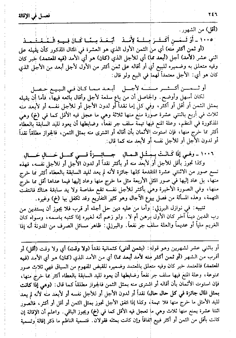 (أقل) من الشُّهُور. أَوْ ثَمَنٍ أَكْثَرَ مِنْهُ لأَمَدْ أبْعَدَ مِمَّا كَانَ فِيهِ الْمُعْتَمدْ (أَو ثمن أَكثر مِنْهُ) أَي من الثّمن الأول الَّذِي هُوَ الْعشْرَة فِي الْمِثَال الْمَذْكُور كَأَن يقيله على اثْنَي عشر (لأمد) أجل (أبعد مِمَّا) أَي للأجل الَّذِي (كَانَ) هُوَ أَي الأمد (فِيهِ الْمُعْتَمد) خبر كَانَ وَفِيه مُتَعَلق بِهِ وضميره للْبيع أَي أَو أقاله على ثمن أَكثر من الأول لأجل أبعد من الْأَجَل الَّذِي كَانَ هُوَ أَي: الْأَجَل مُعْتَمدًا لَهما فِي البيع وَلَو قَالَ: أَو ثمن أَكثر مِنْهُ لأجل أبعد مِمَّا كَانَ فِي البيع حصل لَكَانَ أسهل وأوضح. وَالْحَاصِل أَن من بَاعَ سلْعَة لأجل وأقال بَائِعه فِيهَا، فَأَما أَن يقيله بِمثل الثّمن أَو أقل أَو أَكثر، وَفِي كل إِمَّا نَقْدا أَو لدوّنَ الْأَجَل أَو للأجل نَفسه أَو لأبعد مِنْهُ ثَلَاث فِي أَربع باثنتي عشرَة صُورَة منع مِنْهَا ثَلَاثَة وَهِي مَا عجل فِيهِ الْأَقَل كَمَا فِي (خَ) وَهِي الْمَذْكُورَة فِي النّظم، وَعلة الْمَنْع فِيهَا تُهْمَة سلف جر نفعا وضابطها أَن يعود لليد السَّابِقَة بالعطاء أَكثر مِمَّا خرج مِنْهَا، فَإِن اسْتَوَت الْأَثْمَان بِأَن أقاله أَو اشْترى مِنْهُ بِمثل الثّمن، فالجواز مُطلقًا نَقْدا أَو لدوّنَ الْأَجَل أَو للأجل نَفسه أَو لأبعد مِنْهُ كَمَا قَالَ: وهْي إذَا كَانَتْ بِمِثْلِ المالِ جائِزةٌ فِي كل حَالٍ حَالِ وَكَذَا تجوز بِأَقَلّ للأجل أَو لأبعد مِنْهُ أَو بِأَكْثَرَ نَقْدا أَو لدوّنَ الْأَجَل أَو للأجل نَفسه، فَهَذِهِ تسع صور من الاثنتي عشرَة الْمُتَقَدّمَة كلهَا جَائِزَة لِأَنَّهُ لم يعد لليد السَّابِقَة بالعطاء أَكثر مِمَّا خرج مِنْهَا، بل عَاد إِلَيْهَا فِي صور الْمثل الْأَرْبَعَة مثل مَا خرج مِنْهَا وَعَاد إِلَيْهَا فِيمَا عَداهَا أقل مِمَّا خرج مِنْهَا، وَفِي الصُّورَة الْأَخِيرَة وَهِي بِأَكْثَرَ للأجل نَفسه تقع مقاصة وَلَا يَد سَابِقَة هُنَاكَ فانتفت التُّهْمَة، وَهَذِه الْمَسْأَلَة من فصل بُيُوع الْآجَال وَهُوَ كثير التفاريع وَقد تكفل بهَا (خَ) وَغَيره. تَنْبِيه: فِي نَوَازِل الْبُرْزُليّ: وَأما من عَلَيْهِ دين حل أَجله أَو قرب فَلَا يجوز أَن يستدين من رب الدّين دينا آخر كَانَ الأول برهن أم لَا. وَلَو زعم أَنه لغيره إِذا كتبه باسمه، وَسَوَاء كَانَ الْغَرِيم مَلِيًّا أَو عديماً وَالْعلَّة سلف جر نفعا. والبرزلي: ظَاهر مسَائِل الصّرْف من الْمُدَوَّنَة أَنه إِذا