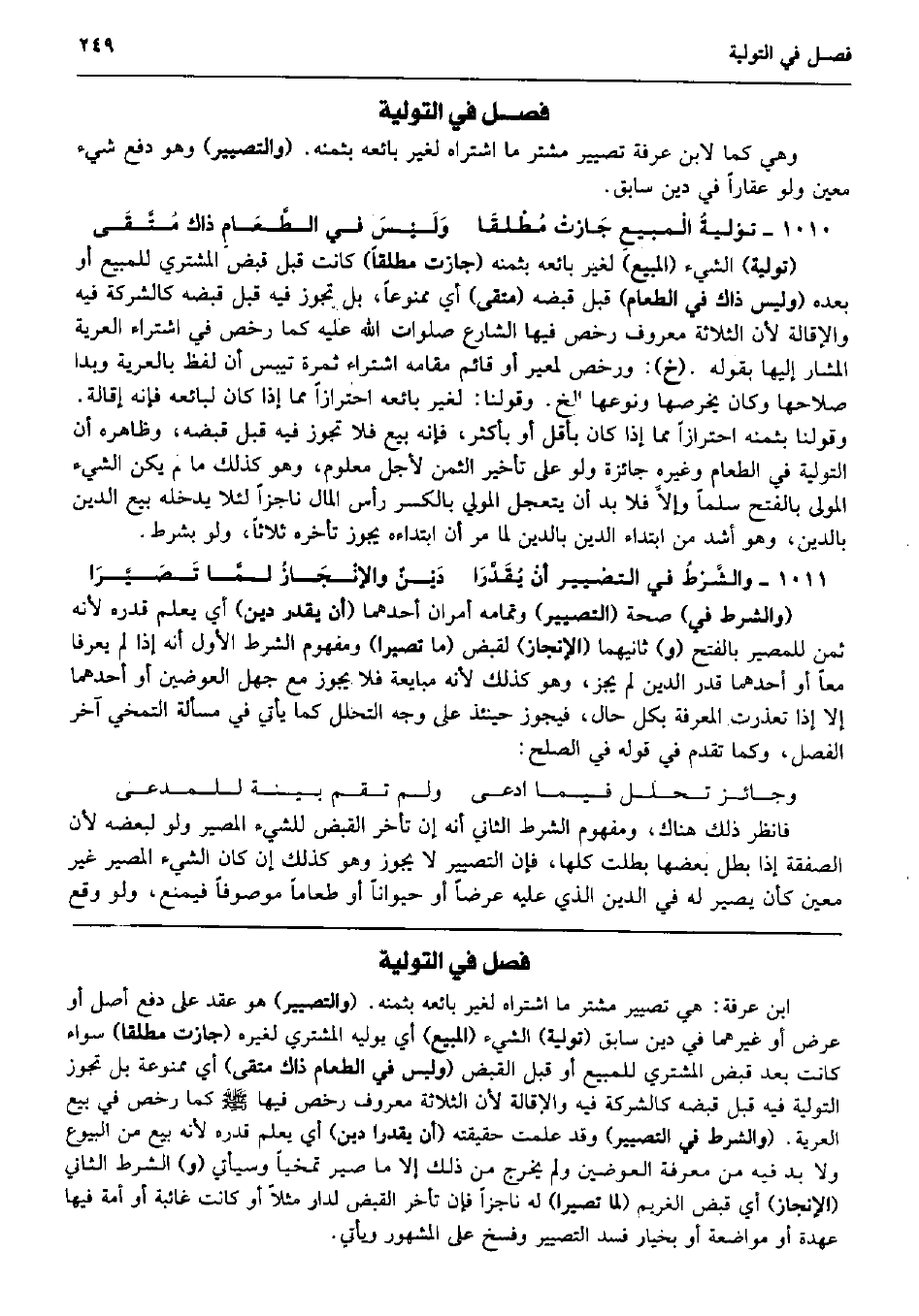 وَهِي كَمَا لِابْنِ عَرَفَة تصيير مُشْتَر مَا اشْتَرَاهُ لغير بَائِعه بِثمنِهِ. (والتصيير) وَهُوَ دفع شَيْء معِين وَلَو عقارا فِي دين سَابق. توْليةُ الْمبيعِ جَازتْ مُطْلقَا وَلَيْسَ فِي الطَّعَامِ ذَاك مُتَّقَى (تَوْلِيَة) الشَّيْء (الْمَبِيع) لغير بَائِعه بِثمنِهِ (جَازَت مُطلقًا) كَانَت قبل قبض المُشْتَرِي للْمَبِيع أَو بعده (وَلَيْسَ ذَاك فِي الطَّعَام) قبل قَبضه (متقى) أَي مَمْنُوعًا، بل تجوز فِيهِ قبل قَبضه كالشركة فِيهِ وَالْإِقَالَة لِأَن الثَّلَاثَة مَعْرُوف رخص فِيهَا الشَّارِع صلوَات الله عَلَيْهِ كَمَا رخص فِي اشْتِرَاء الْعرية الْمشَار إِلَيْهَا بقوله. (خَ) : وَرخّص لمعير أَو قَائِم مقَامه اشْتِرَاء ثَمَرَة تيبس أَن لفظ بالعرية وبدا صَلَاحهَا وَكَانَ يخرصها ونوعها الخ. وَقَوْلنَا: لغير بَائِعه احْتِرَازًا مِمَّا إِذا كَانَ لبَائِعه فَإِنَّهُ إِقَالَة. وَقَوْلنَا بِثمنِهِ احْتِرَازًا مِمَّا إِذا كَانَ بِأَقَلّ أَو بِأَكْثَرَ، فَإِنَّهُ بيع فَلَا تجوز فِيهِ قبل قَبضه، وَظَاهره أَن التَّوْلِيَة فِي الطَّعَام وَغَيره جَائِزَة وَلَو على تَأْخِير الثّمن لأجل مَعْلُوم، وَهُوَ كَذَلِك مَا لم يكن الشَّيْء الْمولى بِالْفَتْح سلما وإلاَّ فَلَا بُد أَن يتعجل الْمولي بِالْكَسْرِ رَأس المَال ناجزاً لِئَلَّا يدْخلهُ بيع الدّين بِالدّينِ، وَهُوَ أَشد من ابْتِدَاء الدّين بِالدّينِ لما مر أَن ابتداءه يجوز تَأَخره ثَلَاثًا، وَلَو بِشَرْط. والشَّرْطُ فِي التصْيير أنْ يُقَدَّرَا دَيْنٌ والإنْجَازُ لمَّا تَصَيَّرَا (وَالشّرط فِي) صِحَة (التصيير) وَتَمَامه أَمْرَانِ أَحدهمَا (أَن يقدر دين) أَي يعلم قدره لِأَنَّهُ ثمن للمصير بِالْفَتْح (و) ثَانِيهمَا (الإنجاز) لقبض (مَا تصيرا) وَمَفْهُوم الشَّرْط الأول أَنه إِذا لم يعرفا مَعًا أَو أَحدهمَا قدر الدّين لم يجز، وَهُوَ كَذَلِك لِأَنَّهُ مبايعة فَلَا يجوز مَعَ جهل الْعِوَضَيْنِ أَو أَحدهمَا إِلَّا إِذا تَعَذَّرَتْ الْمعرفَة بِكُل حَال، فَيجوز حِينَئِذٍ على وَجه التَّحَلُّل كَمَا يَأْتِي فِي مَسْأَلَة التمخي آخر الْفَصْل، وكما تقدم فِي قَوْله فِي الصُّلْح: وَجَائِز تحلل فِيمَا ادّعى وَلم تقم بَيِّنَة للْمُدَّعى فَانْظُر ذَلِك هُنَاكَ، وَمَفْهُوم الشَّرْط الثَّانِي أَنه إِن تَأَخّر الْقَبْض للشَّيْء الْمصير وَلَو لبعضه لِأَن الصَّفْقَة إِذا بَطل بَعْضهَا بطلت كلهَا، فَإِن التصيير لَا يجوز وَهُوَ كَذَلِك إِن كَانَ الشَّيْء الْمصير غير معِين كَأَن يصير لَهُ فِي الدّين الَّذِي عَلَيْهِ عرضا أَو حَيَوَانا أَو طَعَاما مَوْصُوفا فَيمْنَع، وَلَو وَقع