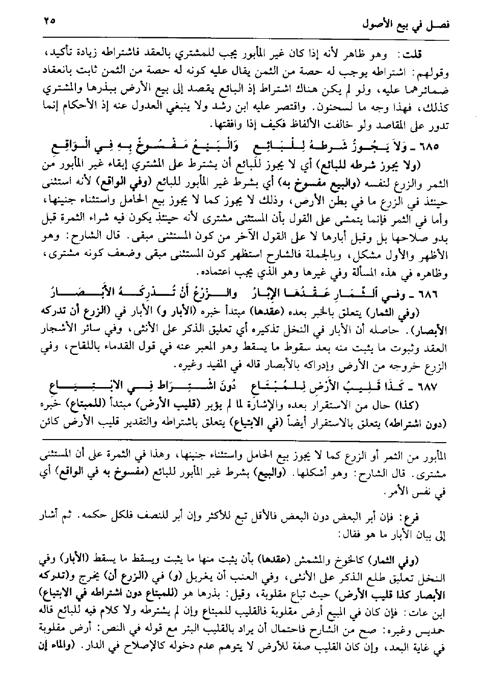 قلت: وَهُوَ ظَاهر لِأَنَّهُ إِذا كَانَ غير المأبور يجب للْمُشْتَرِي بِالْعقدِ فاشتراطه زِيَادَة تَأْكِيد، وَقَوْلهمْ: اشْتِرَاطه يُوجب لَهُ حِصَّة من الثّمن يُقَال عَلَيْهِ كَونه لَهُ حِصَّة من الثّمن ثَابت بانعقاد ضمائرهما عَلَيْهِ، وَلَو لم يكن هُنَاكَ اشْتِرَاط إِذْ البَائِع يقْصد إِلَى بيع الأَرْض ببذرها وَالْمُشْتَرِي كَذَلِك، فَهَذَا وَجه مَا لسَحْنُون. وَاقْتصر عَلَيْهِ ابْن رشد وَلَا يَنْبَغِي الْعُدُول عَنهُ إِذْ الْأَحْكَام إِنَّمَا تَدور على الْمَقَاصِد وَلَو خَالَفت الْأَلْفَاظ فَكيف إِذا وافقتها. وَلاَ يَجُوزُ شَرطهُ لِلْبَائِعِ وَالْبَيْعُ مَفْسُوخٌ بِهِ فِي الْوَاقِعِ (وَلَا يجوز شَرطه للْبَائِع) أَي لَا يجوز للْبَائِع أَن يشْتَرط على المُشْتَرِي إبْقَاء غير المأبور من الثَّمر وَالزَّرْع لنَفسِهِ (وَالْبيع مفسوخ بِهِ) أَي بِشَرْط غير المأبور للْبَائِع (وَفِي الْوَاقِع) لِأَنَّهُ اسْتثْنى حِينَئِذٍ فِي الزَّرْع مَا فِي بطن الأَرْض، وَذَلِكَ لَا يجوز كَمَا لَا يجوز بيع الْحَامِل واستثناء جَنِينهَا، وَأما فِي الثَّمر فَإِنَّمَا يتمشى على القَوْل بِأَن الْمُسْتَثْنى مشترى لِأَنَّهُ حِينَئِذٍ يكون فِيهِ شِرَاء الثَّمَرَة قبل بَدو صَلَاحهَا بل وَقبل أبارها لَا على القَوْل الآخر من كَون الْمُسْتَثْنى مبقى. قَالَ الشَّارِح: وَهُوَ الْأَظْهر وَالْأول مُشكل، وَبِالْجُمْلَةِ فالشارح استظهر كَون الْمُسْتَثْنى مبقى وَضعف كَونه مشترى، وَظَاهره فِي هَذِه الْمَسْأَلَة وَفِي غَيرهَا وَهُوَ الَّذِي يجب اعْتِمَاده. وَفِي الثِّمَارِ عَقْدُهَا الإِبَّارُ والزّرْعُ أَنْ تُدْرِكَهُ الأَبْصَارُ (وَفِي الثِّمَار) يتَعَلَّق بالْخبر بعده (عقدهَا) مُبْتَدأ خَبره (الْأَبَّار و) الْأَبَّار فِي (الزَّرْع أَن تُدْرِكهُ الْأَبْصَار) . حَاصله أَن الْأَبَّار فِي النّخل تذكيره أَي تَعْلِيق الذّكر على الْأُنْثَى، وَفِي سَائِر الْأَشْجَار العقد وَثُبُوت مَا يثبت مِنْهُ بعد سُقُوط مَا يسْقط وَهُوَ الْمعبر عَنهُ فِي قَول القدماء باللقاح، وَفِي الزَّرْع خُرُوجه من الأَرْض وإدراكه بالأبصار قَالَه فِي الْمُفِيد وَغَيره. كَذَا قَلِيبُ الأَرْضِ لِلمُبْتَاعِ دُونَ اشْتِرَاط فِي الابْتِيَاعِ (كَذَا) حَال من الِاسْتِقْرَار بعده وَالْإِشَارَة لما لم يؤبر (قليب الأَرْض) مُبْتَدأ (للْمُبْتَاع) خَبره (دون اشْتِرَاطه) يتَعَلَّق بالاستقرار أَيْضا (فِي الابتياع) يتَعَلَّق باشتراطه وَالتَّقْدِير قليب الأَرْض كَائِن