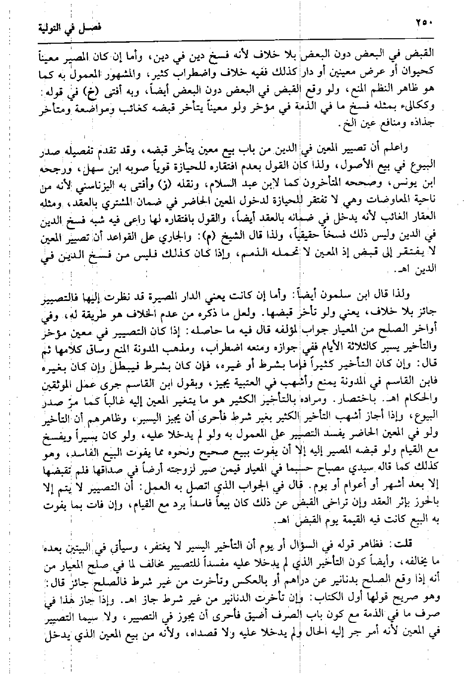 الْقَبْض فِي الْبَعْض دون الْبَعْض بِلَا خلاف لِأَنَّهُ فسخ دين فِي دين، وَأما إِن كَانَ الْمصير معينا كحيوان أَو عرض مُعينين أَو دَار كَذَلِك فَفِيهِ خلاف واضطراب كثير، وَالْمَشْهُور الْمَعْمُول بِهِ كَمَا هُوَ ظَاهر النّظم الْمَنْع، وَلَو وَقع الْقَبْض فِي الْبَعْض دون الْبَعْض أَيْضا، وَبِه أفتى (خَ) فِي قَوْله: وككالىء بِمثلِهِ فسخ مَا فِي الذِّمَّة فِي مُؤخر وَلَو معينا يتَأَخَّر قَبضه كغائب ومواضعة ومتأخر جذاذه وَمَنَافع عين الخ. وَاعْلَم أَن تصيير الْمعِين فِي الدّين من بَاب بيع معِين يتَأَخَّر قَبضه، وَقد تقدم تَفْصِيله صدر الْبيُوع فِي بيع الْأُصُول، وَلذَا كَانَ القَوْل بِعَدَمِ افتقاره للحيازة قَوِيا صَوبه ابْن سهل، وَرجحه ابْن يُونُس، وَصَححهُ الْمُتَأَخّرُونَ كَمَا لِابْنِ عبد السَّلَام، وَنَقله (ز) وَأفْتى بِهِ اليزناسني لِأَنَّهُ من نَاحيَة الْمُعَاوَضَات وَهِي لَا تفْتَقر للحيازة لدُخُول الْمعِين الْحَاضِر فِي ضَمَان المُشْتَرِي بِالْعقدِ، وَمثله الْعقار الْغَائِب لِأَنَّهُ يدْخل فِي ضَمَانه بِالْعقدِ أَيْضا، وَالْقَوْل بافتقاره لَهَا رَاعى فِيهِ شبه فسخ الدّين فِي الدّين وَلَيْسَ ذَلِك فسخا حَقِيقِيًّا، وَلذَا قَالَ الشَّيْخ (م) : والجاري على الْقَوَاعِد أَن تصيير الْمعِين لَا يفْتَقر إِلَى قبض إِذْ الْمعِين لَا تحمله الذمم، وَإِذا كَانَ كَذَلِك فَلَيْسَ من فسخ الدّين فِي الدّين اه. وَلذَا قَالَ ابْن سَلمُون أَيْضا: وَأما إِن كَانَت يَعْنِي الدَّار المصيرة قد نظرت إِلَيْهَا فالتصيير جَائِز بِلَا خلاف، يَعْنِي وَلَو تَأَخّر قبضهَا. وَلَعَلَّ مَا ذكره من عدم الْخلاف هُوَ طَريقَة لَهُ، وَفِي أَوَاخِر الصُّلْح من المعيار جَوَاب لمؤلفه قَالَ فِيهِ مَا حَاصله: إِذا كَانَ التصيير فِي معِين مُؤخر وَالتَّأْخِير يسير كالثلاثة الْأَيَّام فَفِي جَوَازه وَمنعه اضْطِرَاب، وَمذهب الْمُدَوَّنَة الْمَنْع وسَاق كَلَامهَا ثمَّ قَالَ: وَإِن كَانَ التَّأْخِير كثيرا فإمَّا بِشَرْط أَو غَيره، فَإِن كَانَ بِشَرْط فَيبْطل وَإِن كَانَ بِغَيْرِهِ فَابْن الْقَاسِم فِي الْمُدَوَّنَة يمْنَع وَأَشْهَب فِي الْعُتْبِيَّة يُجِيز، وَبقول ابْن الْقَاسِم جرى عمل الموثقين والحكام اه. بِاخْتِصَار. وَمرَاده بِالتَّأْخِيرِ الْكثير هُوَ مَا يتَغَيَّر الْمعِين إِلَيْهِ غَالِبا كَمَا مرّ صدر الْبيُوع، وَإِذا أجَاز أَشهب التَّأْخِير الْكثير بِغَيْر شَرط فأحرى أَن يُجِيز الْيَسِير، وظاهرهم أَن التَّأْخِير وَلَو فِي الْمعِين الْحَاضِر يفْسد التصيير على الْمَعْمُول بِهِ وَلَو لم يدخلا عَلَيْهِ، وَلَو كَانَ يَسِيرا وَيفْسخ مَعَ الْقيام وَلَو قَبضه الْمصير إِلَيْهِ إِلَّا أَن يفوت بِبيع صَحِيح وَنَحْوه مِمَّا يفوت البيع الْفَاسِد، وَهُوَ كَذَلِك كَمَا قَالَه سَيِّدي مِصْبَاح حَسْبَمَا فِي المعيار فِيمَن صير لزوجته أَرضًا فِي صَدَاقهَا فَلم تقبضها إِلَّا بعد أشهر أَو أَعْوَام أَو يَوْم. قَالَ فِي الْجَواب الَّذِي اتَّصل بِهِ الْعَمَل: أَن التصيير لَا يتم إِلَّا بالحوز بإثر العقد وَإِن ترَاخى الْقَبْض عَن ذَلِك كَانَ بيعا فَاسِدا يرد مَعَ الْقيام، وَإِن فَاتَ بِمَا يفوت بِهِ البيع كَانَت فِيهِ الْقيمَة يَوْم الْقَبْض اه. قلت: فَظَاهر قَوْله فِي السُّؤَال أَو يَوْم أَن التَّأْخِير الْيَسِير لَا يغْتَفر، وَسَيَأْتِي فِي الْبَيْتَيْنِ بعده مَا يُخَالِفهُ، وَأَيْضًا كَون التَّأْخِير الَّذِي لم يدخلا عَلَيْهِ مُفْسِدا للتصيير مُخَالف لما فِي صلح المعيار من أَنه إِذا وَقع الصُّلْح بِدَنَانِير عَن دَرَاهِم أَو بِالْعَكْسِ وتأخرت من غير شَرط فَالصُّلْح جَائِز قَالَ: وَهُوَ صَرِيح قَوْلهَا أول الْكتاب: وَإِن تَأَخَّرت الدَّنَانِير من غير شَرط جَازَ اه. وَإِذا جَازَ هَذَا فِي صرف مَا فِي الذِّمَّة مَعَ كَون بَاب الصّرْف أضيق فأحرى أَ